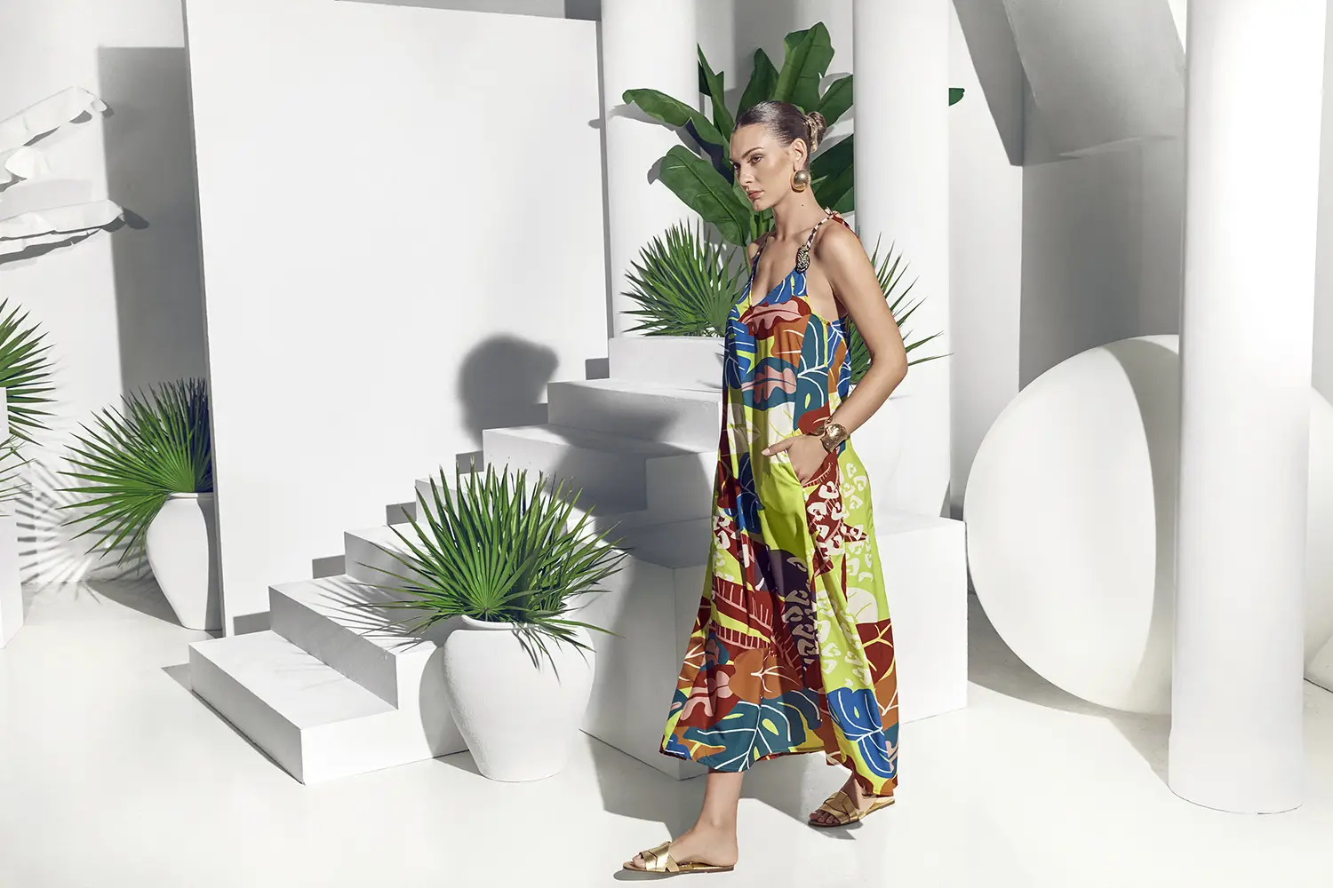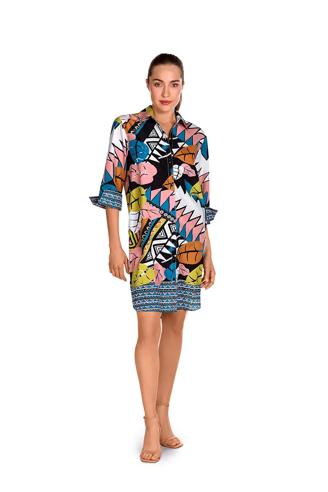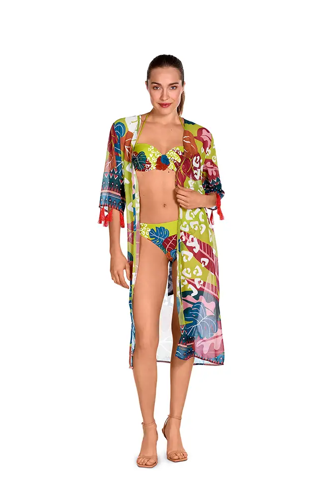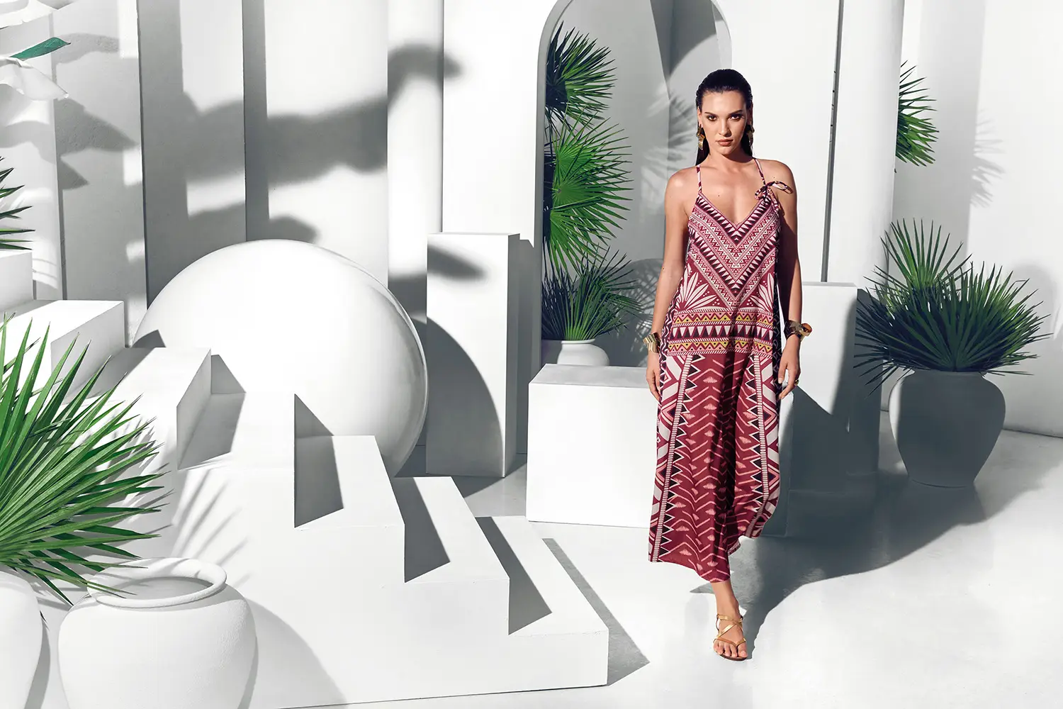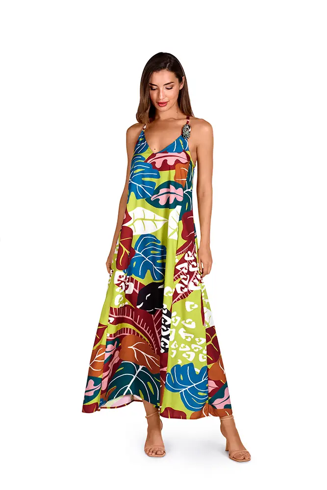 El diseño juega con la simetría, la escala y el contraste cromático, reinterpretando las paletas tradicionales africanas en una gama que oscila entre tonos vibrantes y matices metálicos. La sofisticación se potencia con acabados en lurex, que aportan una dimensión luminosa y sensual a cada pieza.