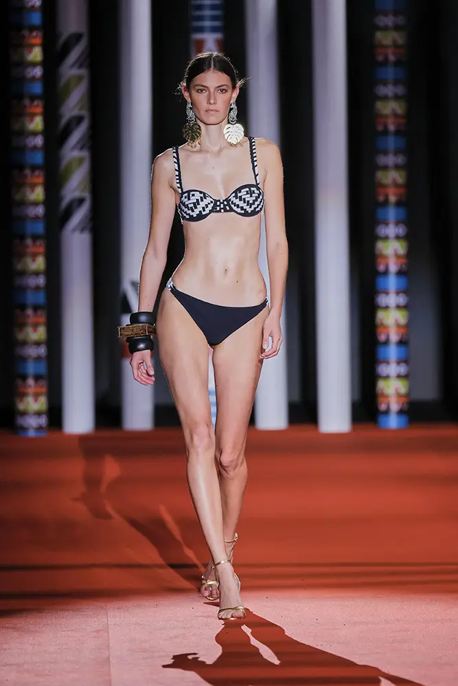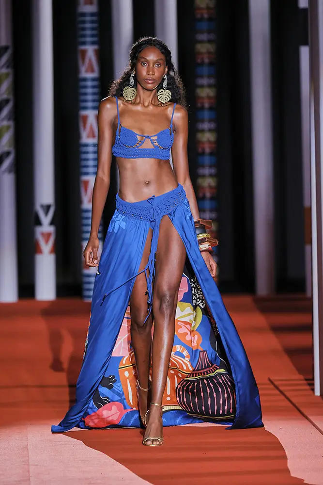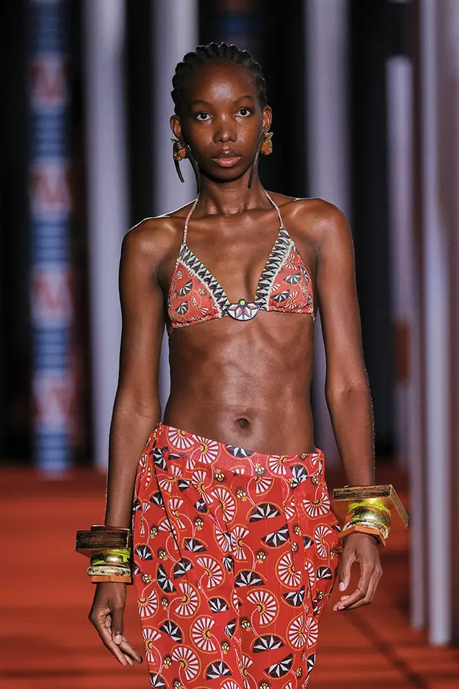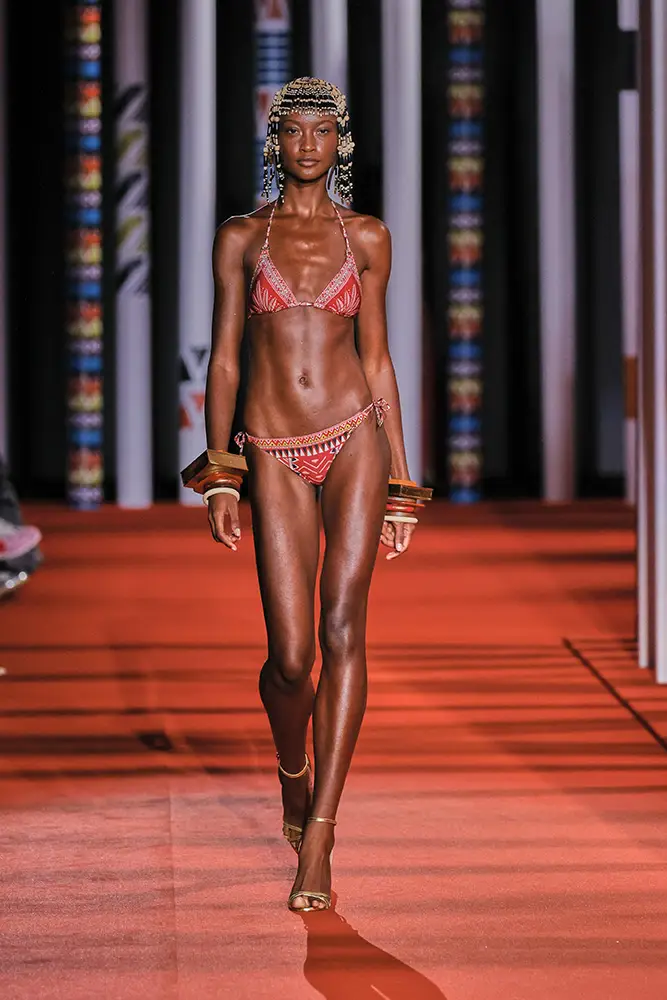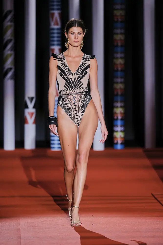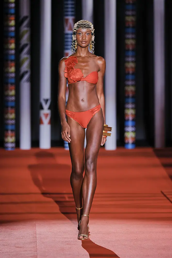 “Ndebele” parte de la riqueza visual que caracteriza los murales geométricos, donde los colores contrastantes, las formas angulares y los patrones repetitivos crean una estética gráfica potente. La diseñadora articula sus bañadores, bikinis, túnicas, pareos y accesorios como lienzos que dialogan con el cuerpo, diseñados para proyectar movimiento, personalidad y presencia. La paleta cromática fluye entre tonos tierra, azul oceánico, negro, blanco y contrastes vibrantes, evocando tanto la naturaleza como el exotismo propio de las manifestaciones artísticas africanas. Se suman detalles artesanales como flecos y abalorios, que no solo embellecen, sino que refuerzan la conexión entre tradición y modernidad.