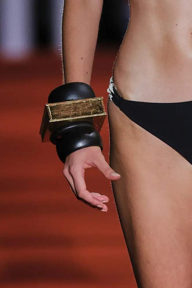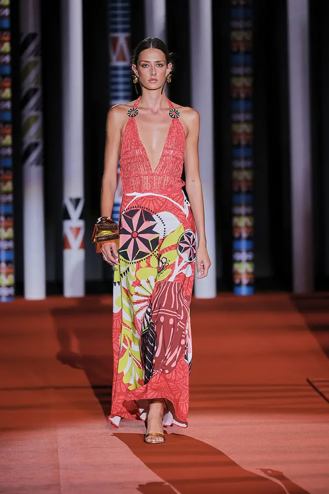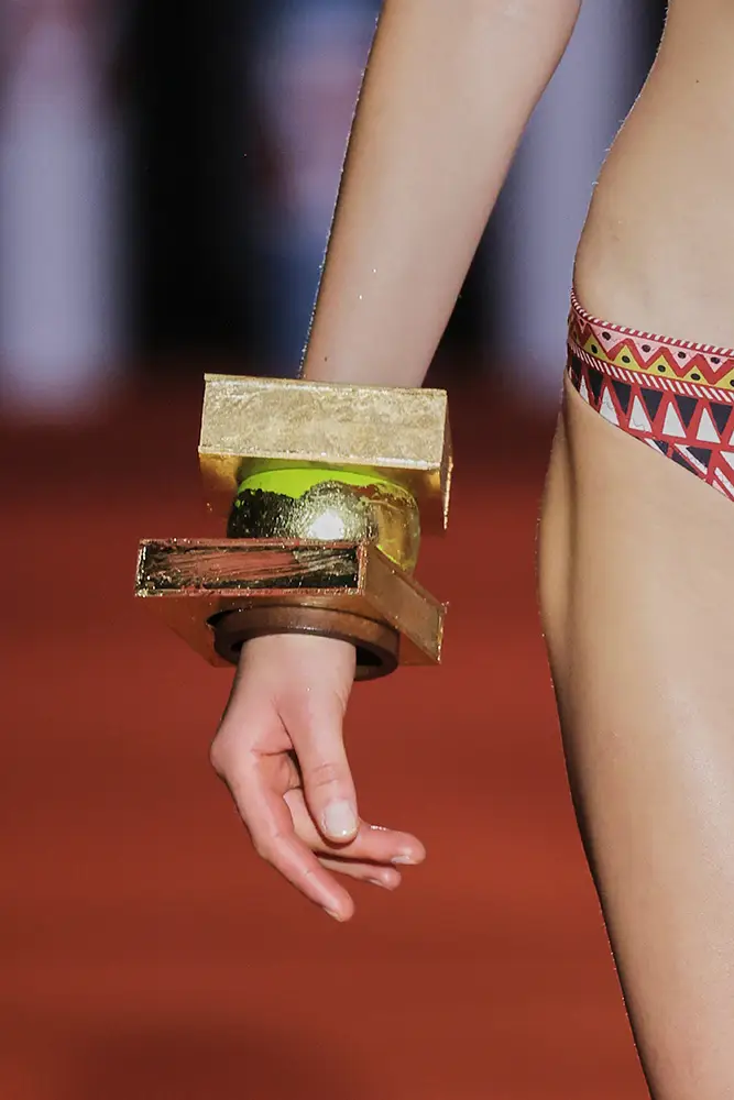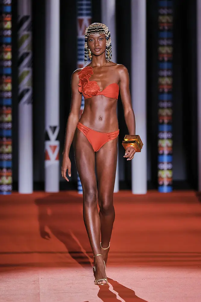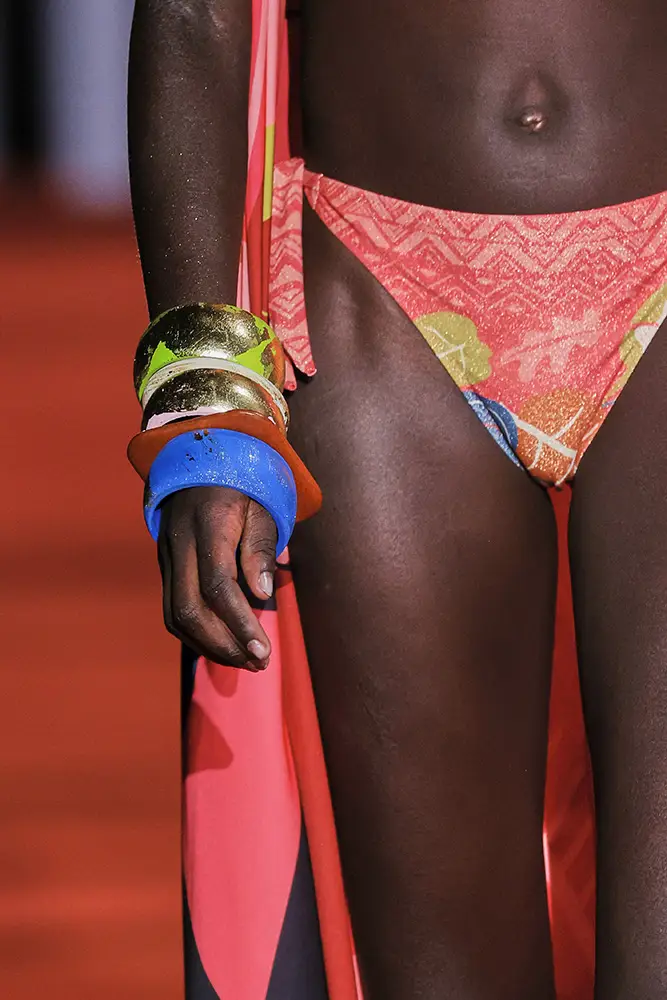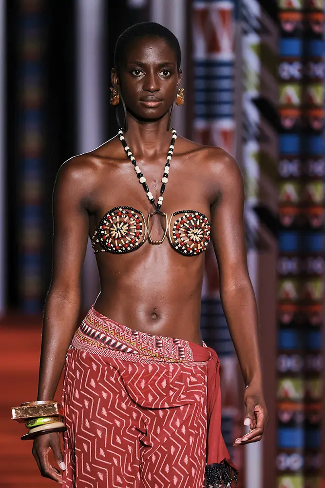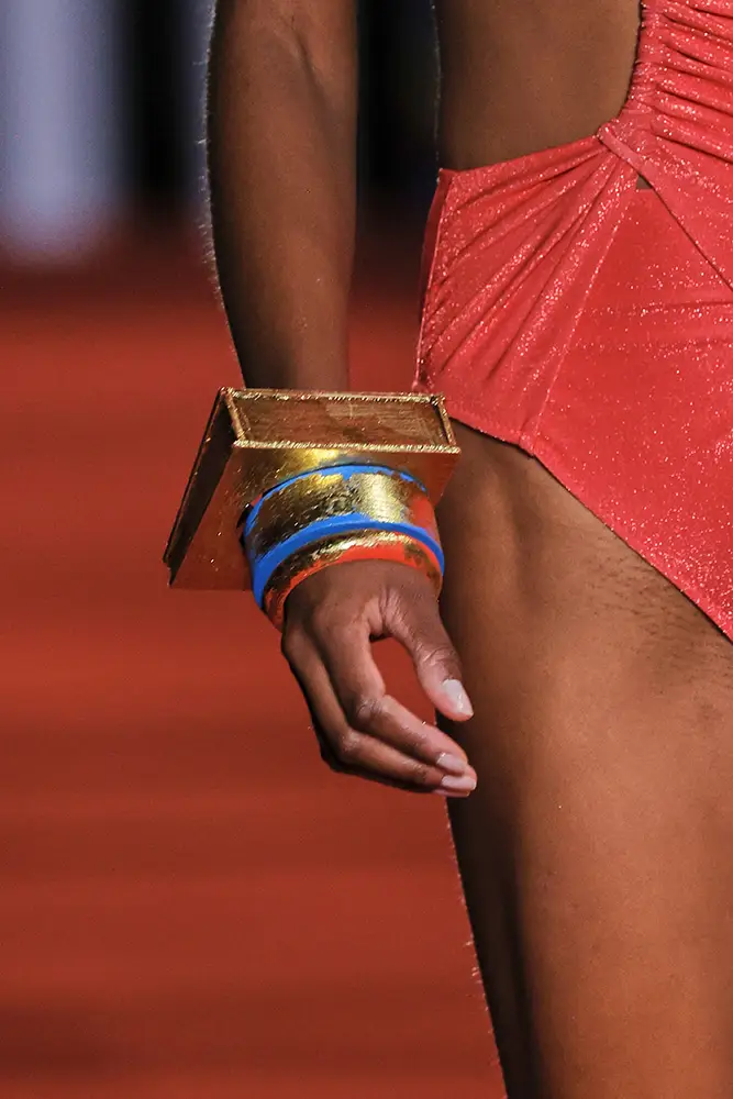 “Ndebele” parte de la riqueza visual que caracteriza los murales geométricos, donde los colores contrastantes, las formas angulares y los patrones repetitivos crean una estética gráfica potente. La diseñadora articula sus bañadores, bikinis, túnicas, pareos y accesorios como lienzos que dialogan con el cuerpo, diseñados para proyectar movimiento, personalidad y presencia. La paleta cromática fluye entre tonos tierra, azul oceánico, negro, blanco y contrastes vibrantes, evocando tanto la naturaleza como el exotismo propio de las manifestaciones artísticas africanas. Se suman detalles artesanales como flecos y abalorios, que no solo embellecen, sino que refuerzan la conexión entre tradición y modernidad.