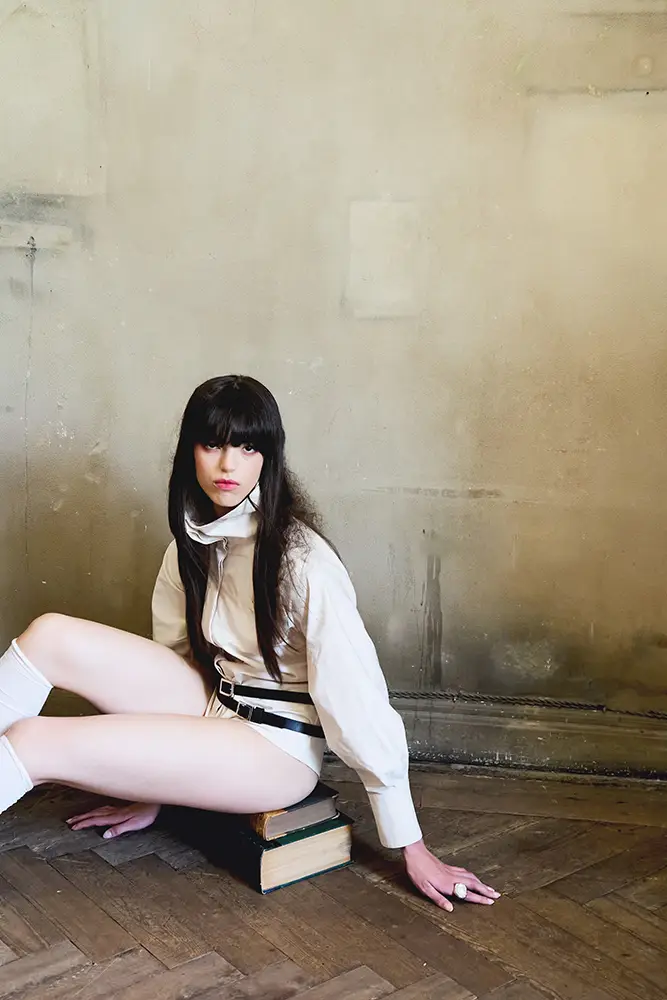 La propuesta de E·R·A·X articula una serie de códigos visuales y materiales que trasladan el universo interno al lenguaje del cuerpo. Los cinturones, presentes no solo en cintura sino también en muñecas y tobillos, hacen referencia directa a los dispositivos de contención utilizados históricamente en instituciones psiquiátricas. Lejos de ser un gesto literal, estos elementos funcionan como símbolo de una presión emocional que aprieta desde dentro.