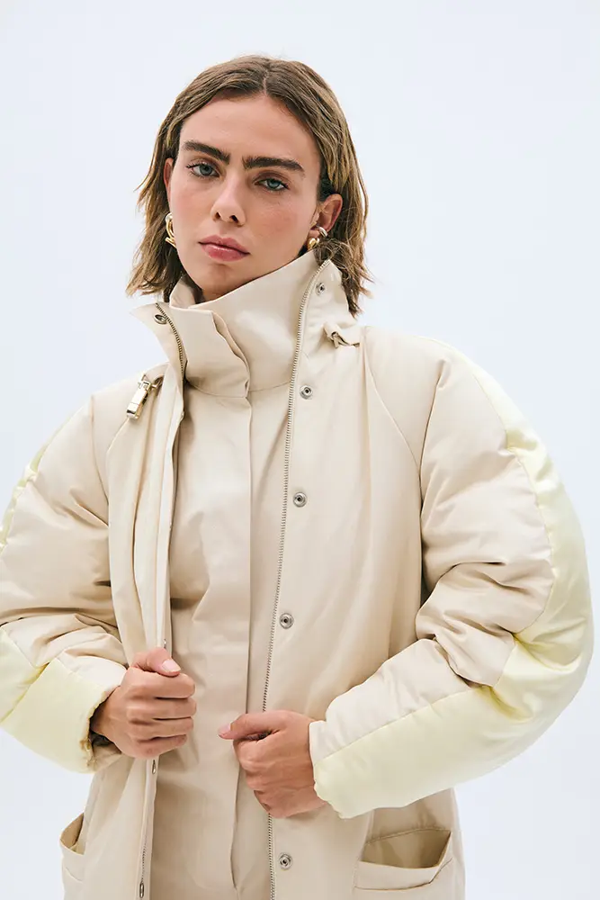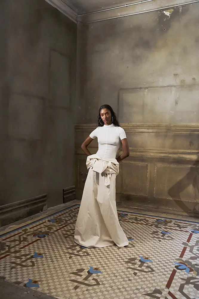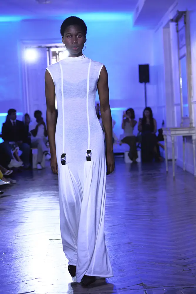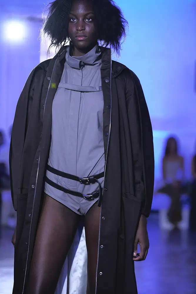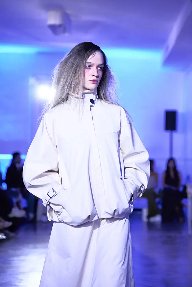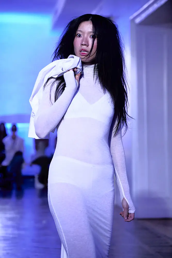 Los tejidos juegan un papel esencial en esta narrativa. La colección combina materiales técnicos con acabados más orgánicos: punto cerrado que genera tensión estructural, tejidos transparentes que dejan entrever el cuerpo como metáfora de una vulnerabilidad expuesta, y algodones tratados que refuerzan la sensación de neutralidad clínica. Los detalles fruncidos, los volúmenes comprimidos y las costuras que constriñen refuerzan visualmente la idea de un cuerpo limitado por su propia mente.