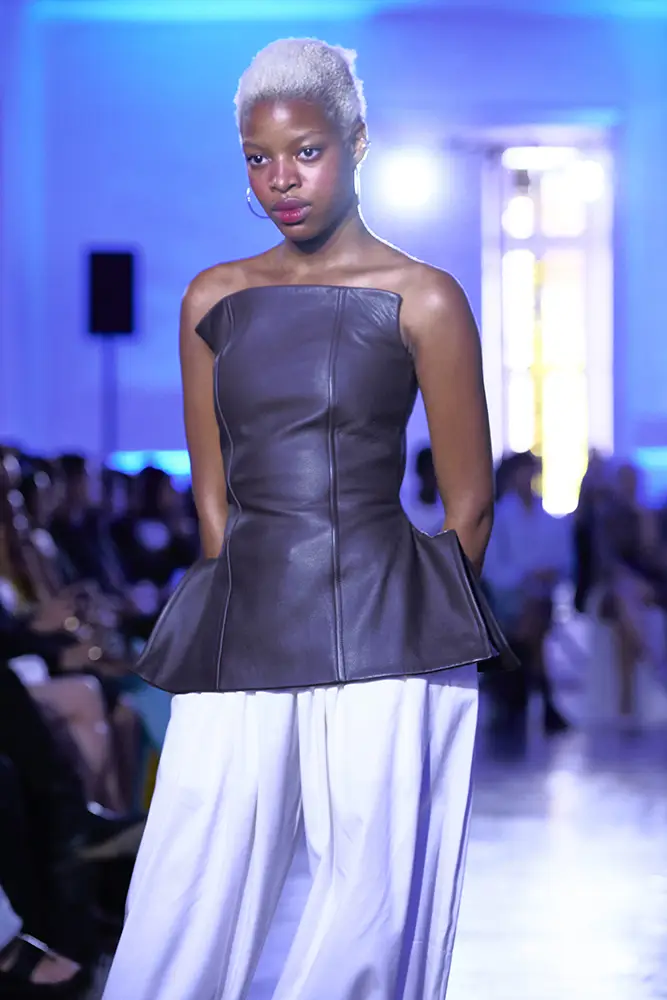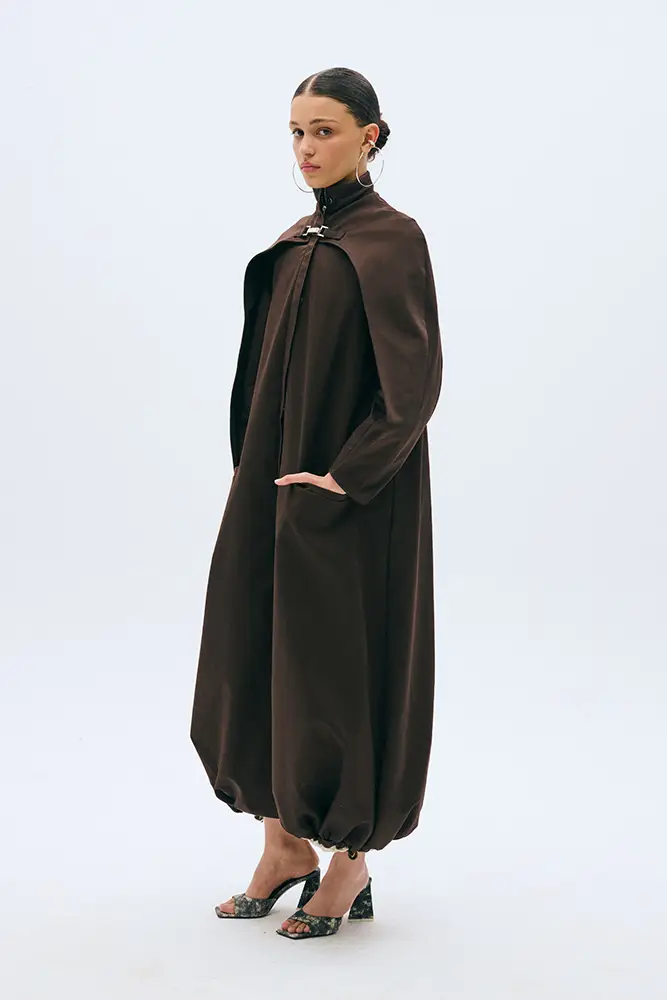 Entre los looks, destacan piezas como los vestidos-capa en tejido técnico marrón que anulan la silueta sin negarla, monos acolchados en blanco que generan una falsa sensación de protección, y tops de cuero estructurado que se abren en la cadera como si contuvieran una presión a punto de escapar.