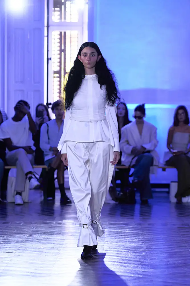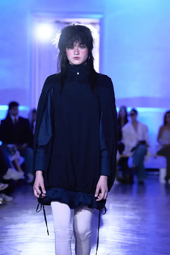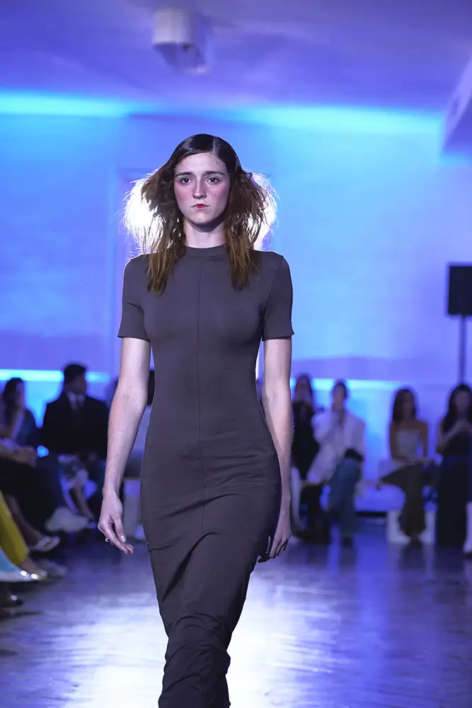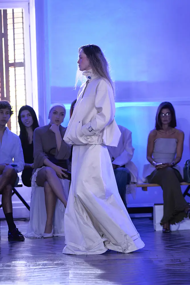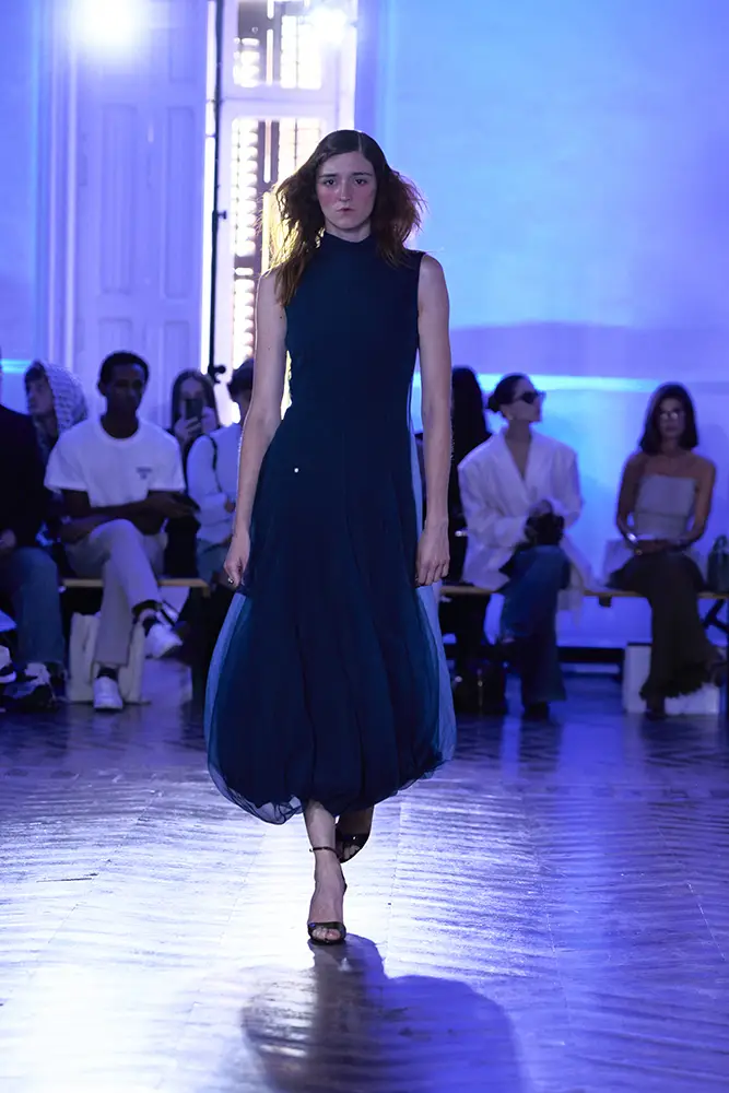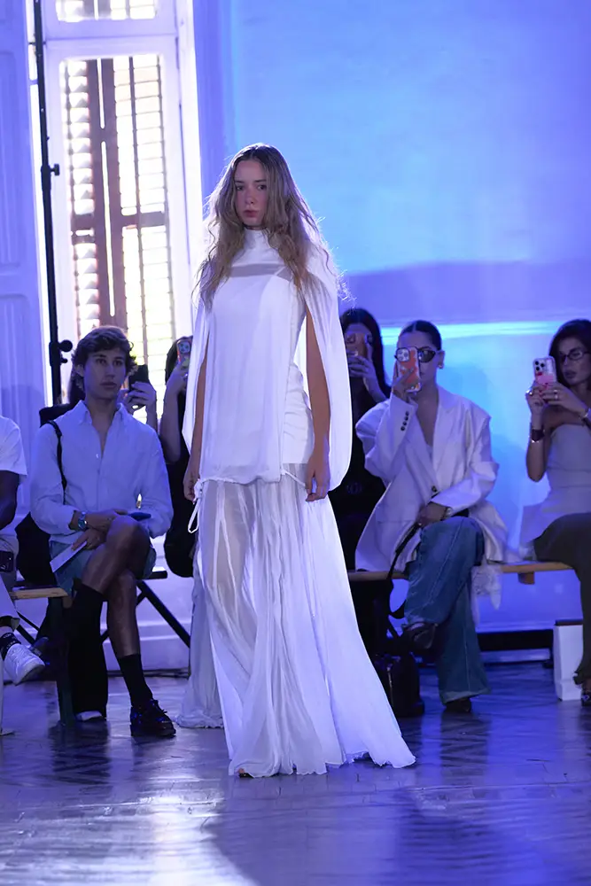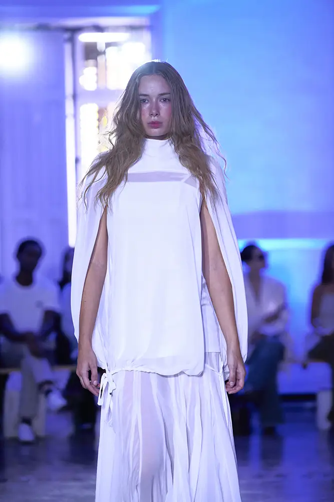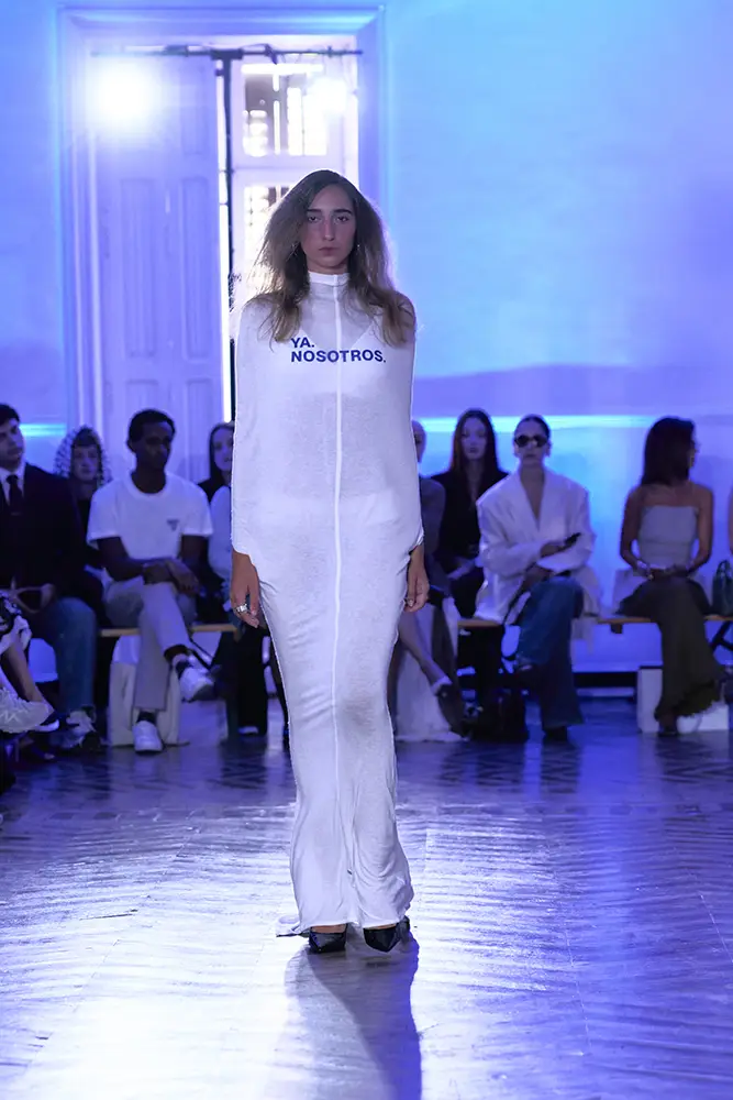 La puesta en escena del desfile ha acompañado esta propuesta conceptual con una atmósfera sobria, pausada y contenida. La pasarela no se convierte en un lugar de exhibición, sino en un espacio de resonancia emocional. Las modelos caminan sin artificios, sin excesos, dejando que las prendas y sus gestos hablen por sí solas. Cada silueta propone una idea, una emoción o una pregunta que no busca respuesta, sino que invita a detenerse.