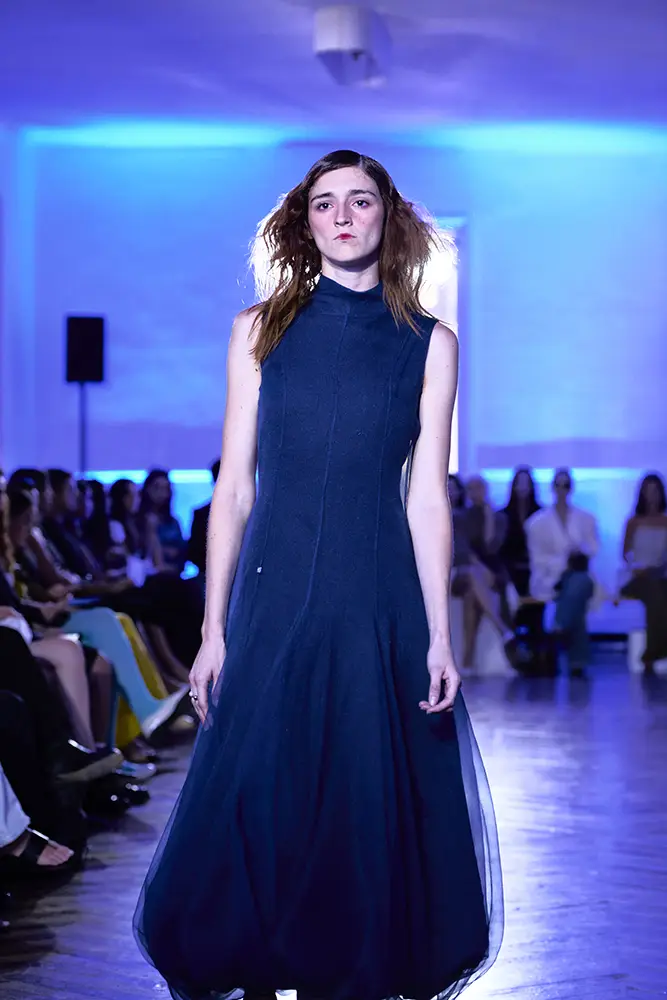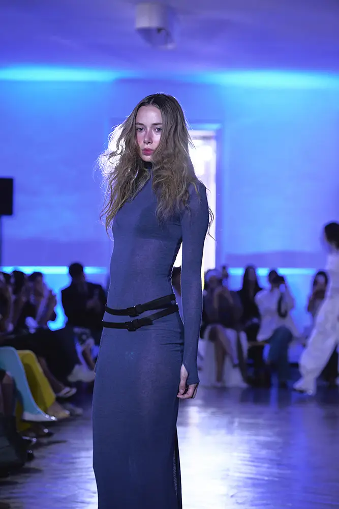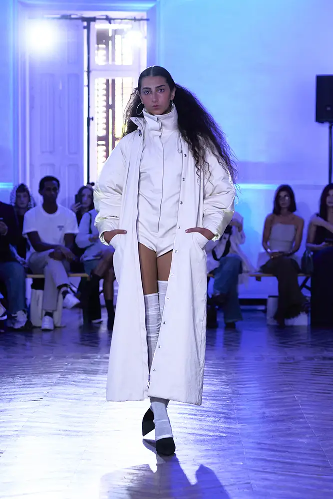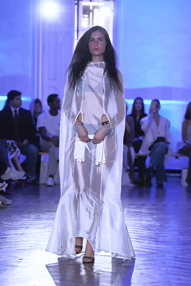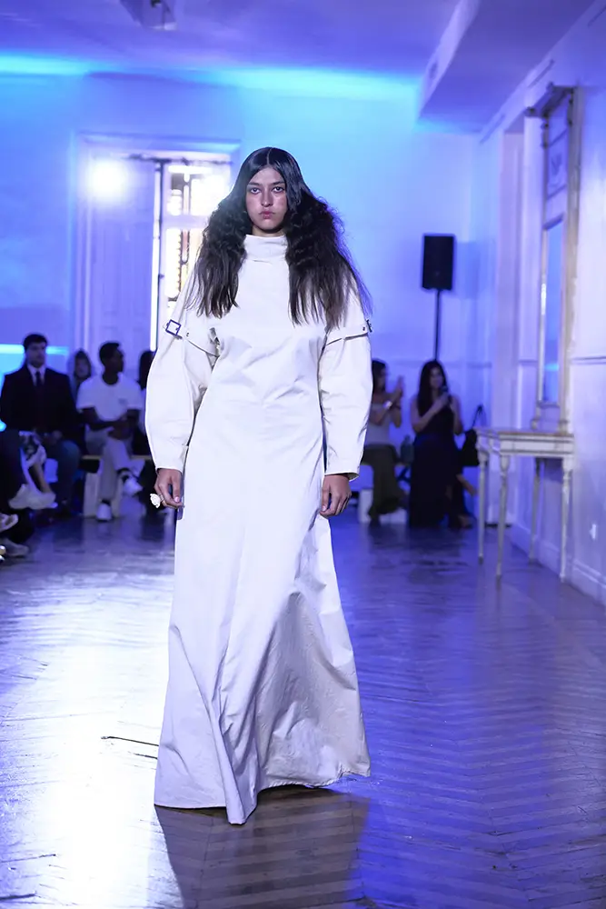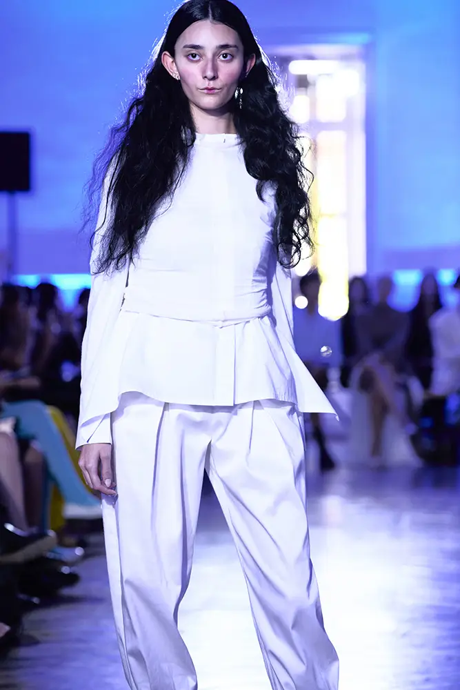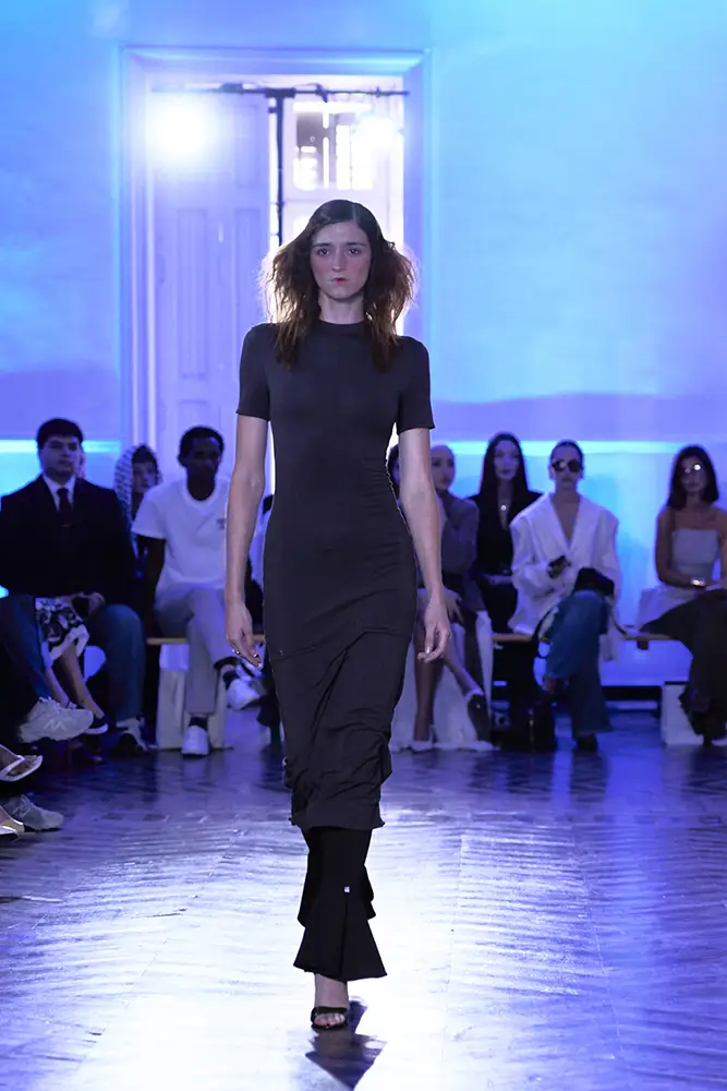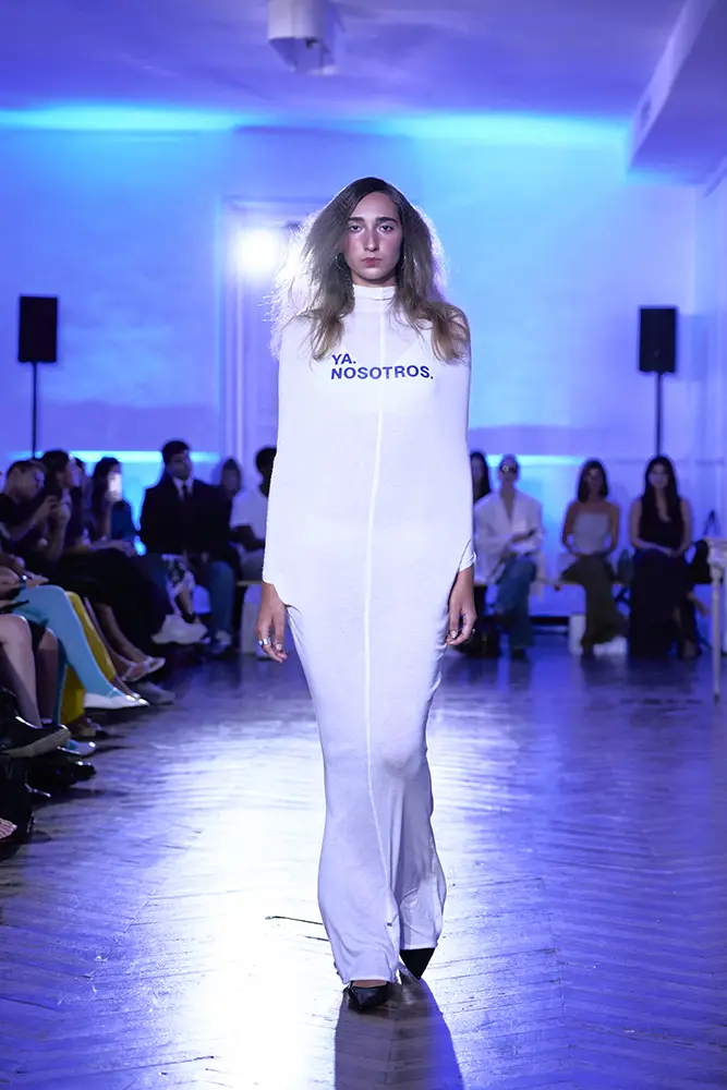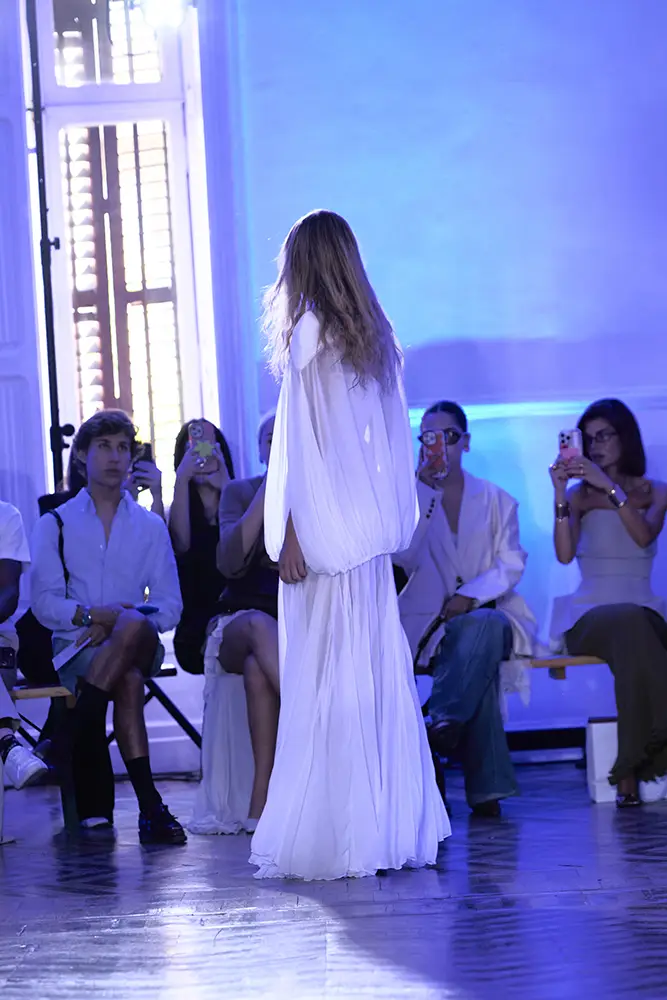 La puesta en escena del desfile ha acompañado esta propuesta conceptual con una atmósfera sobria, pausada y contenida. La pasarela no se convierte en un lugar de exhibición, sino en un espacio de resonancia emocional. Las modelos caminan sin artificios, sin excesos, dejando que las prendas y sus gestos hablen por sí solas. Cada silueta propone una idea, una emoción o una pregunta que no busca respuesta, sino que invita a detenerse.