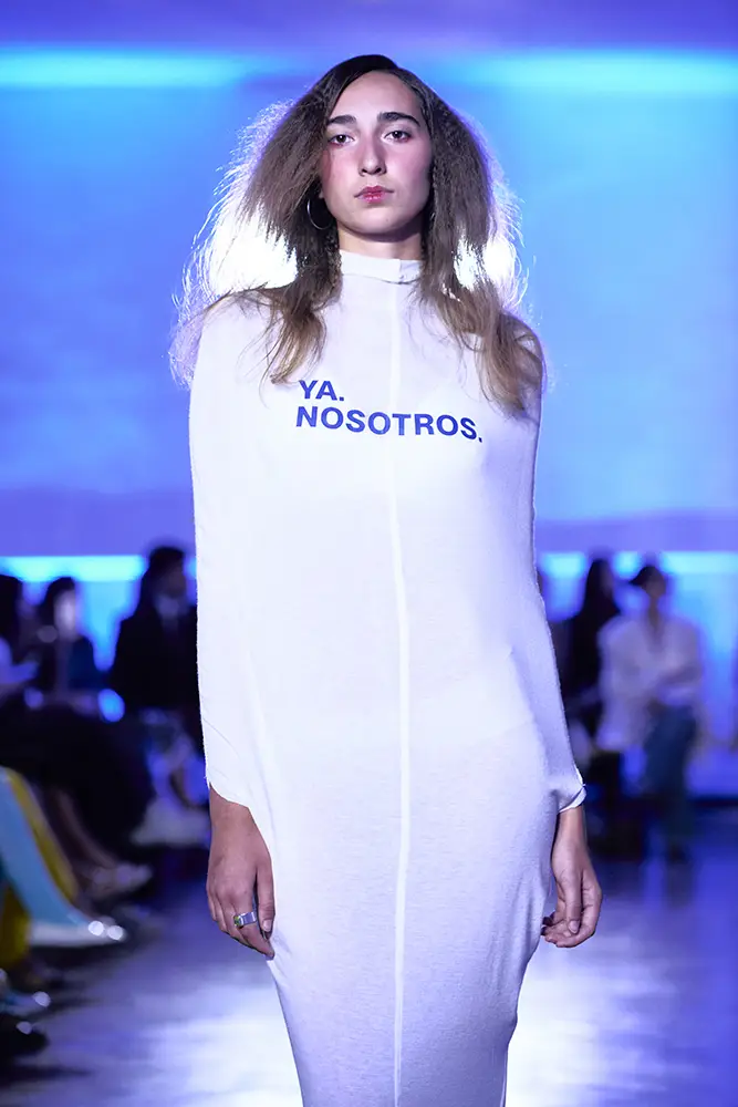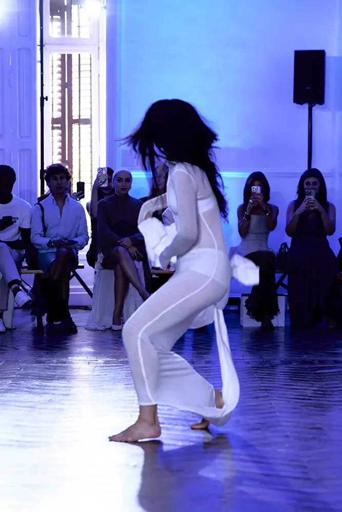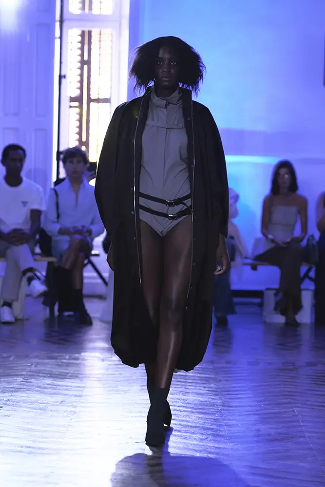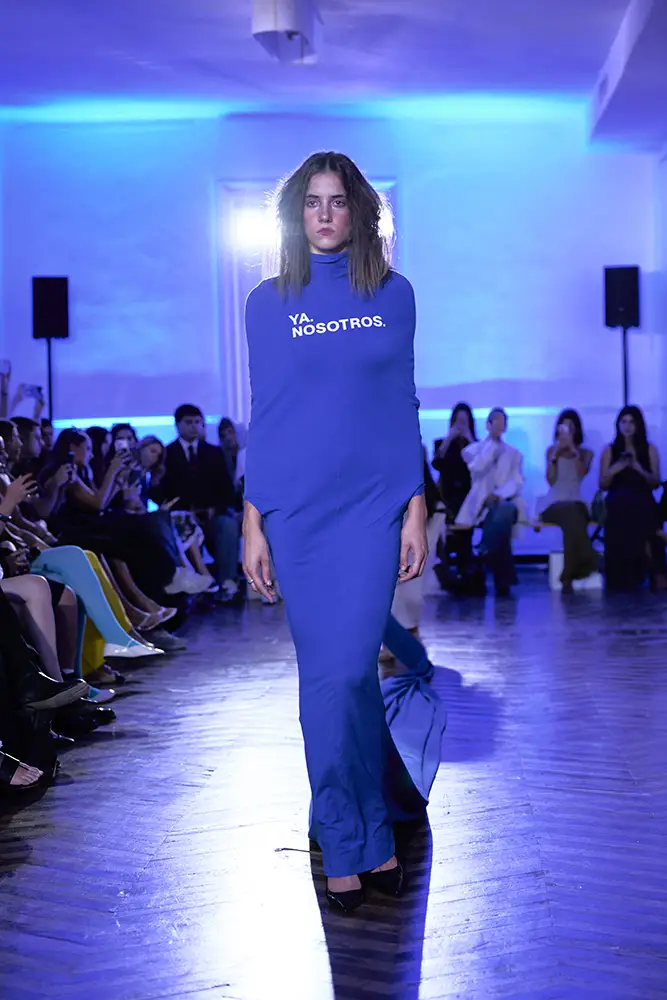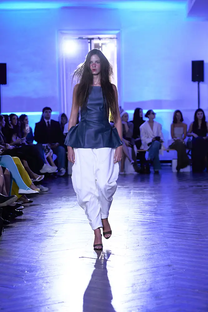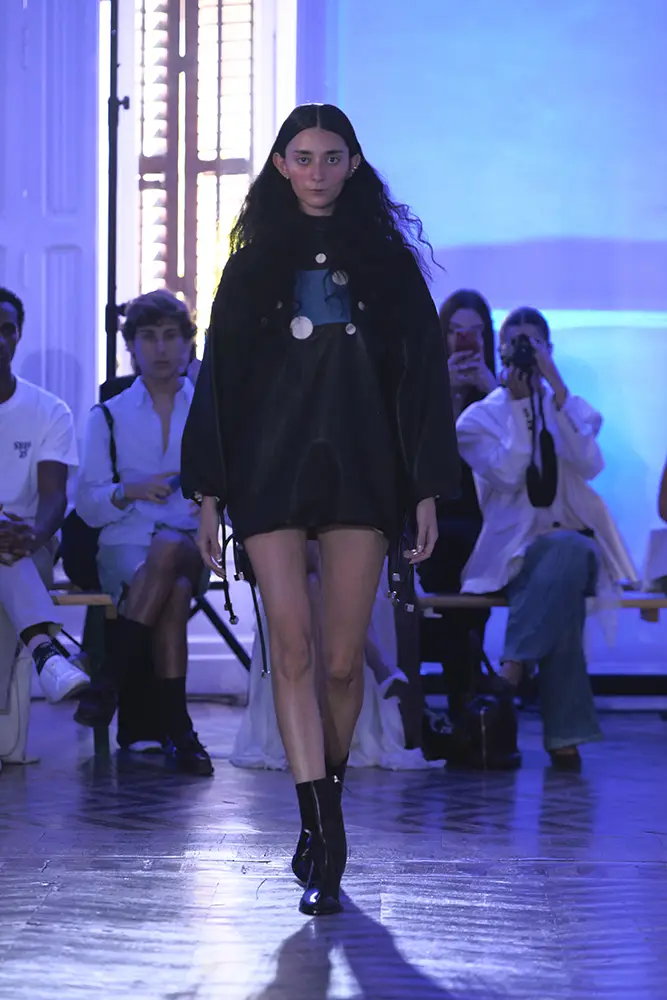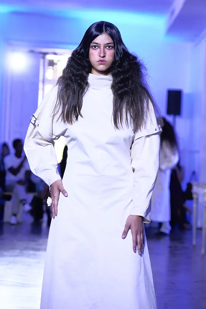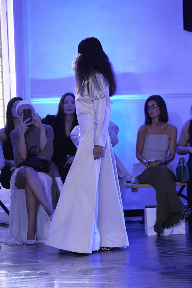 La puesta en escena del desfile ha acompañado esta propuesta conceptual con una atmósfera sobria, pausada y contenida. La pasarela no se convierte en un lugar de exhibición, sino en un espacio de resonancia emocional. Las modelos caminan sin artificios, sin excesos, dejando que las prendas y sus gestos hablen por sí solas. Cada silueta propone una idea, una emoción o una pregunta que no busca respuesta, sino que invita a detenerse.