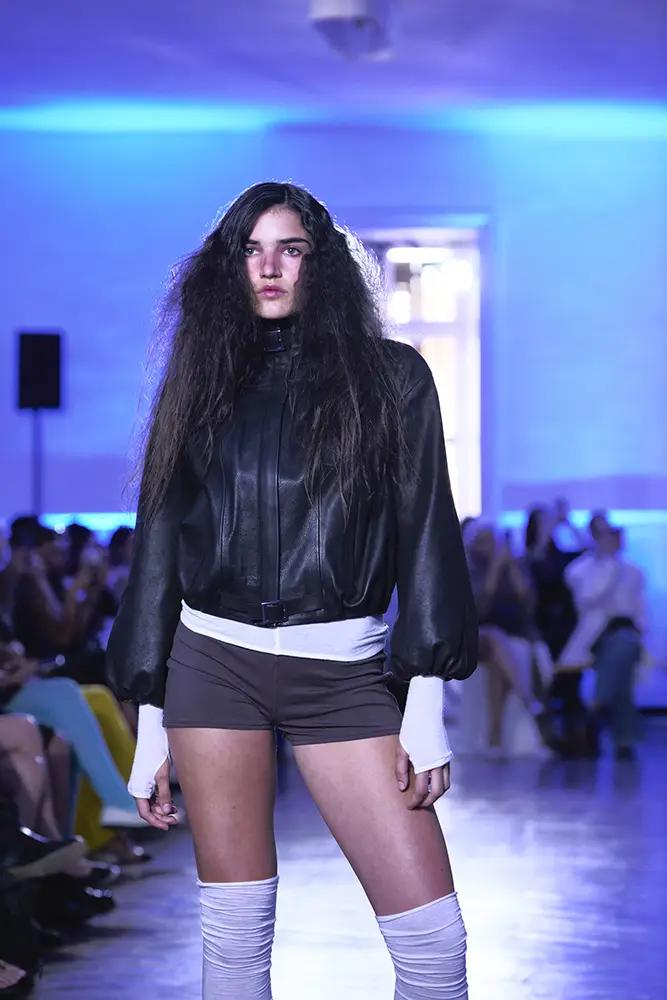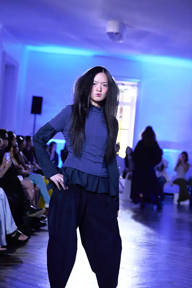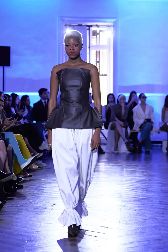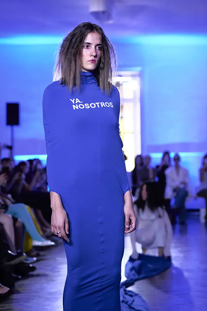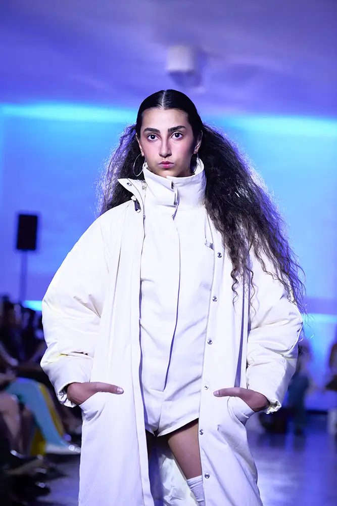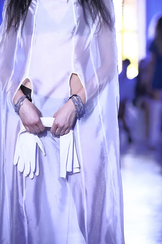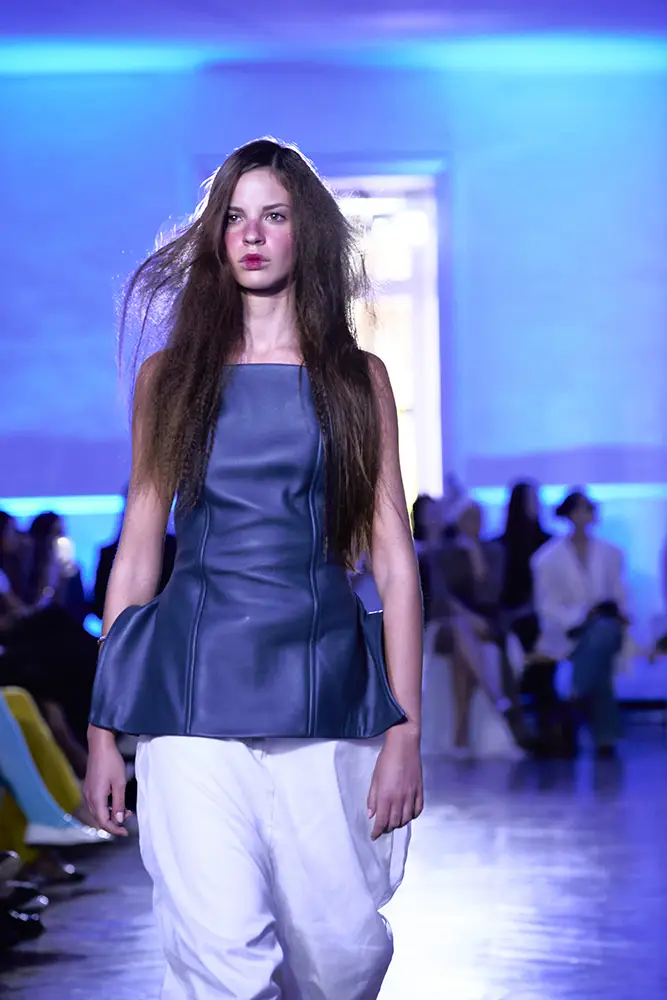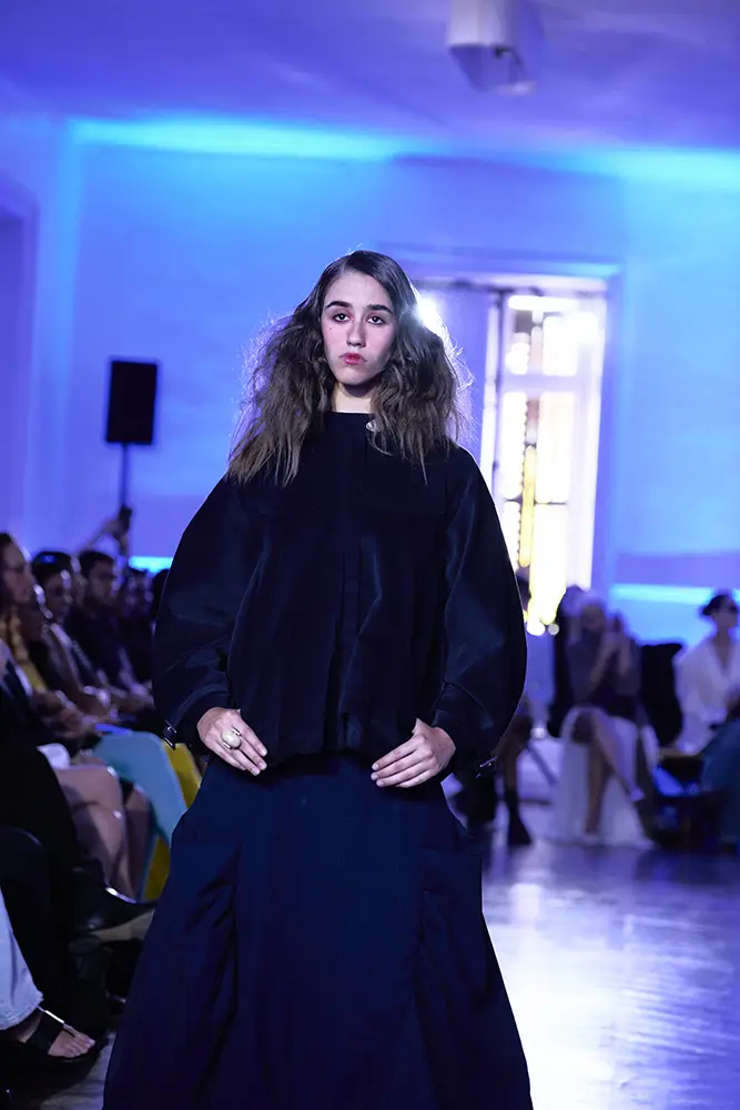 La puesta en escena del desfile ha acompañado esta propuesta conceptual con una atmósfera sobria, pausada y contenida. La pasarela no se convierte en un lugar de exhibición, sino en un espacio de resonancia emocional. Las modelos caminan sin artificios, sin excesos, dejando que las prendas y sus gestos hablen por sí solas. Cada silueta propone una idea, una emoción o una pregunta que no busca respuesta, sino que invita a detenerse.