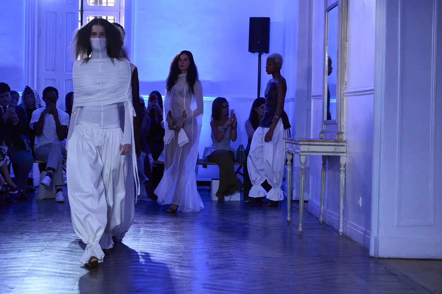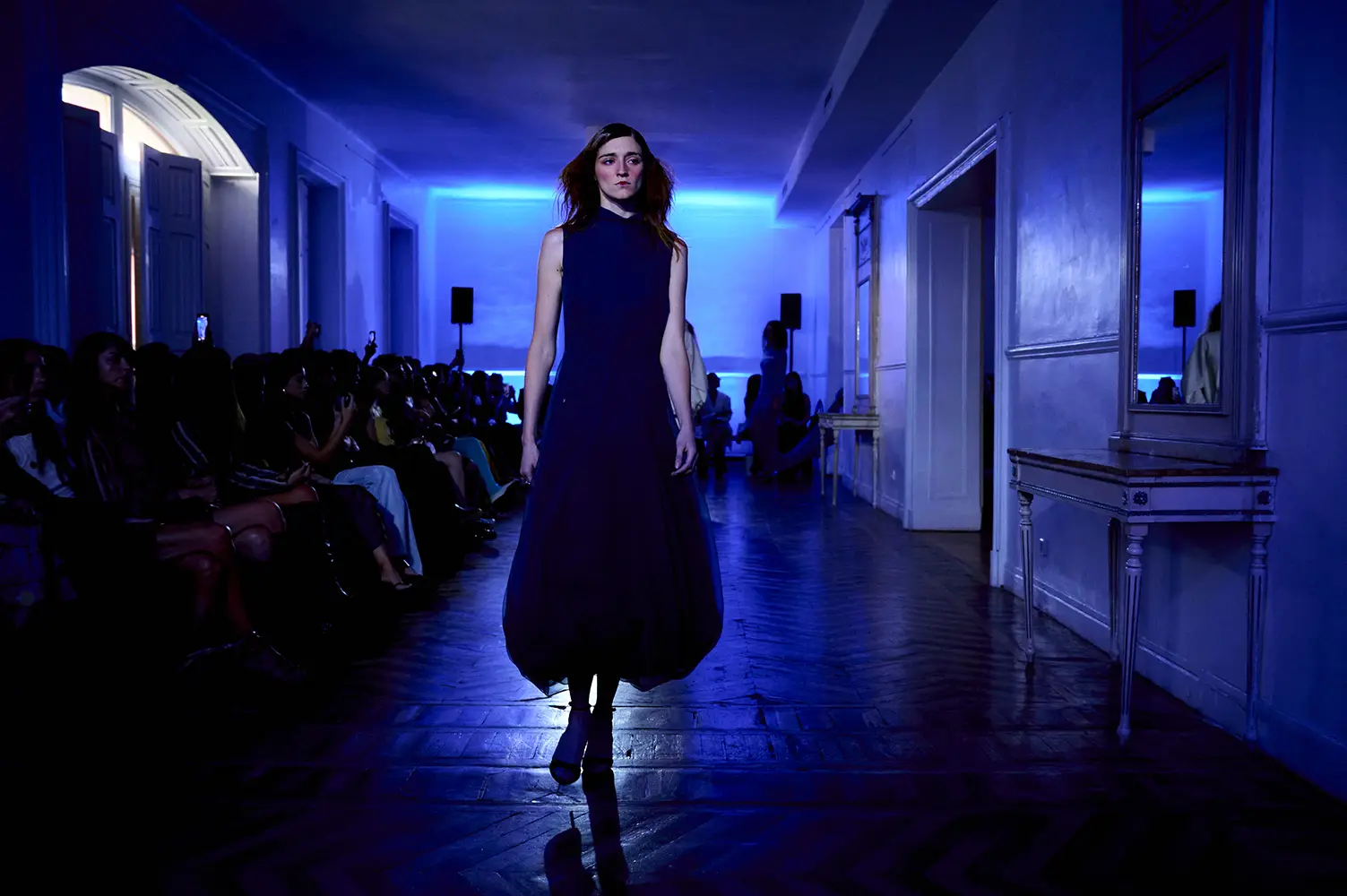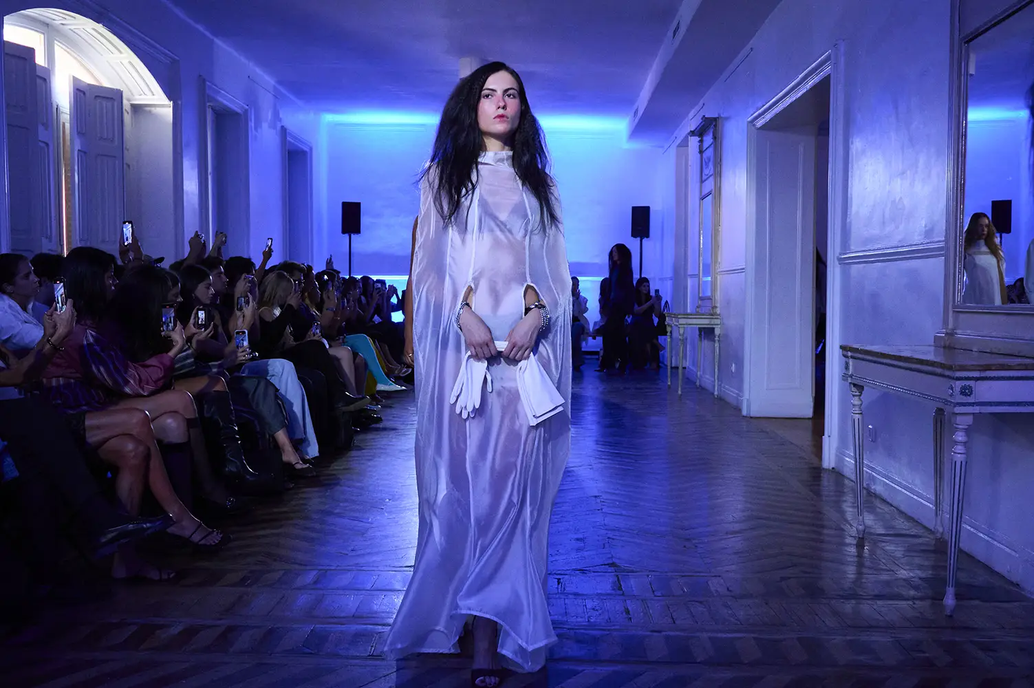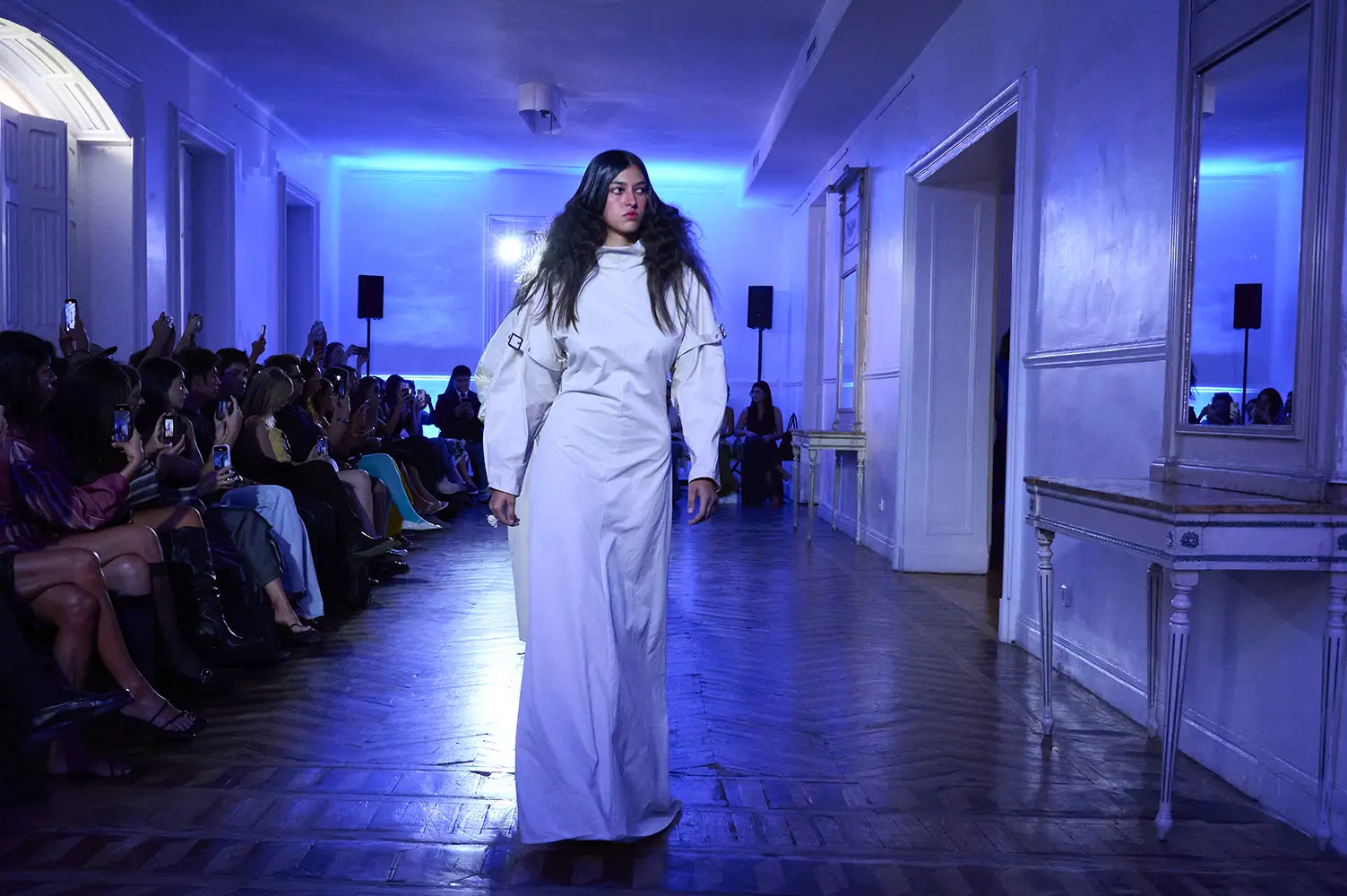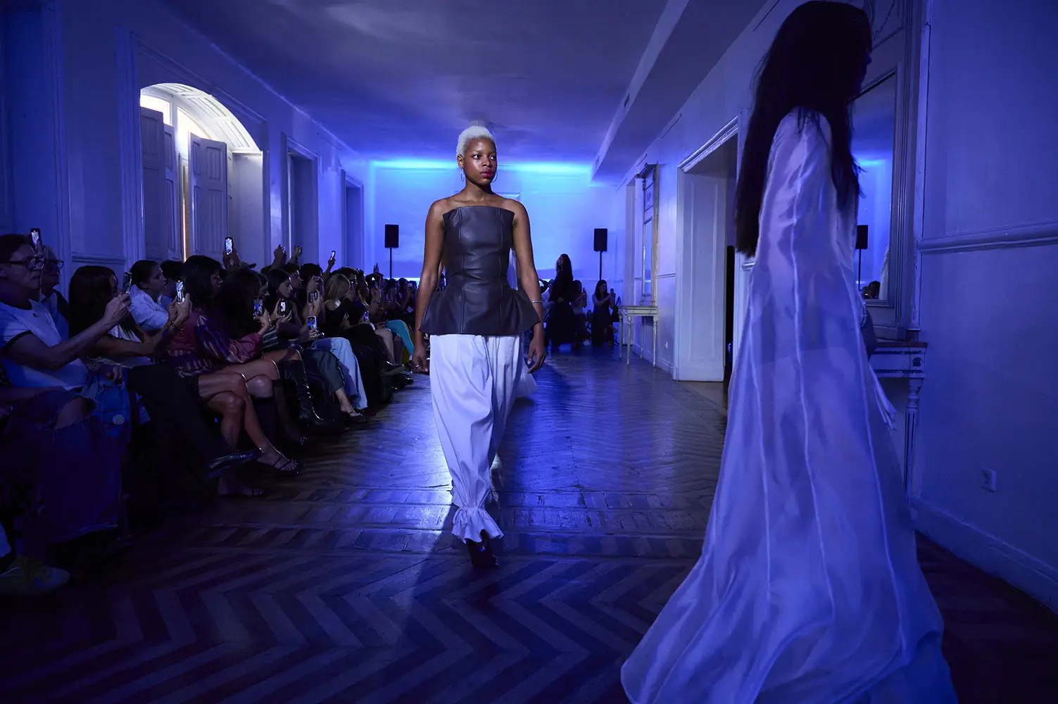 La puesta en escena del desfile ha acompañado esta propuesta conceptual con una atmósfera sobria, pausada y contenida. La pasarela no se convierte en un lugar de exhibición, sino en un espacio de resonancia emocional. Las modelos caminan sin artificios, sin excesos, dejando que las prendas y sus gestos hablen por sí solas. Cada silueta propone una idea, una emoción o una pregunta que no busca respuesta, sino que invita a detenerse.