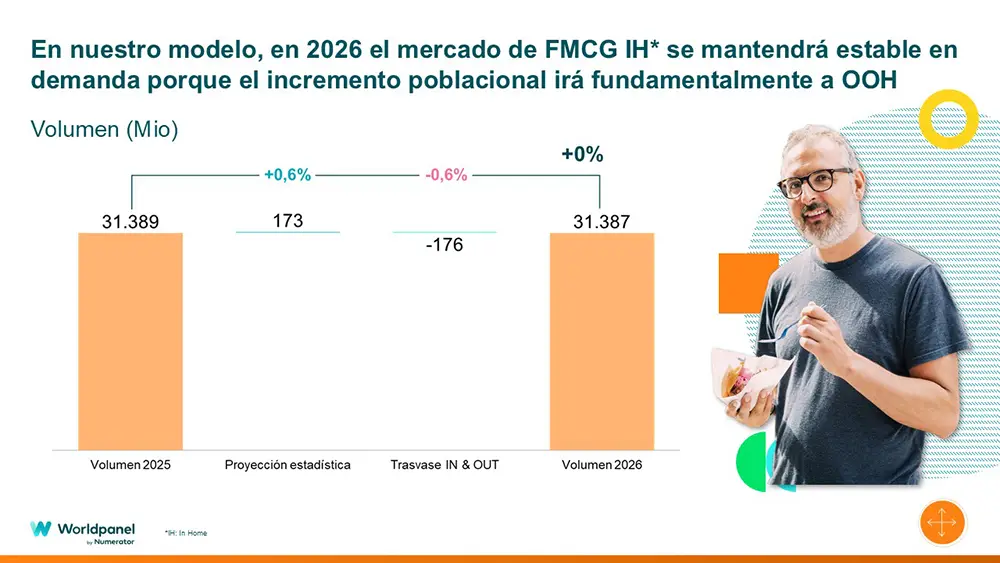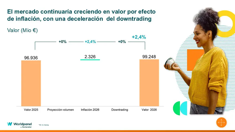 La estabilidad actual del mercado de gran consumo tendrá continuidad en 2026, según Worldpanel by Numerator, que prevé un año plano en lo que a evolución de demanda concierne y un crecimiento alrededor del 3% en valor por efecto de la inflación, según el informe “Los grandes retos de 2026”.