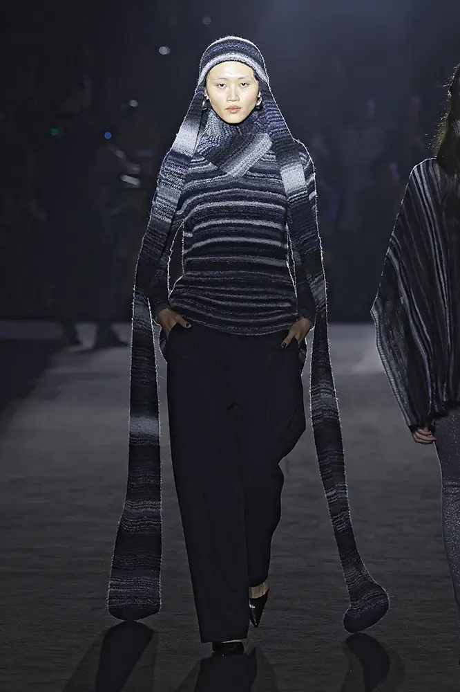 El punto se erige como el gran protagonista, manifestándose en una amplia variedad de diseños que van desde texturas suaves y envolventes, evocando las ondulaciones del paisaje, hasta piezas estructuradas que reimaginan la tradición. La paleta cromática conecta directamente con la naturaleza escocesa: tonos tierra, azul noche y negro reflejan los paisajes montañosos y los cielos invernales al atardecer, mientras que los acentos en rojo y dorado aportan un dramatismo vibrante, infundiendo pasión y carácter a la colección.