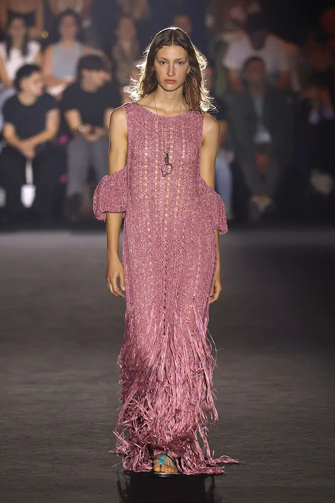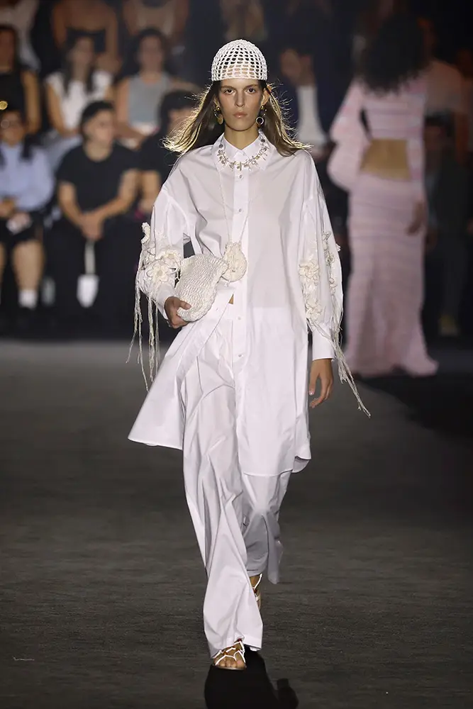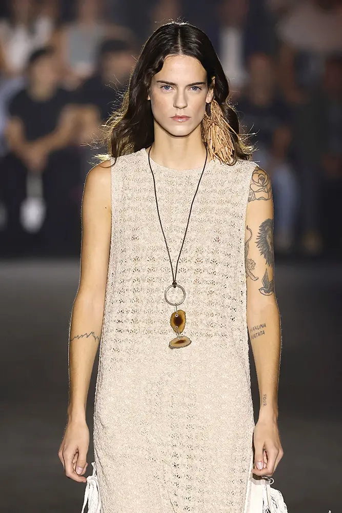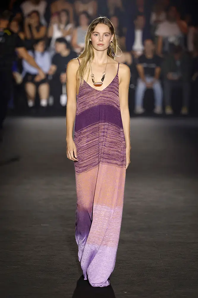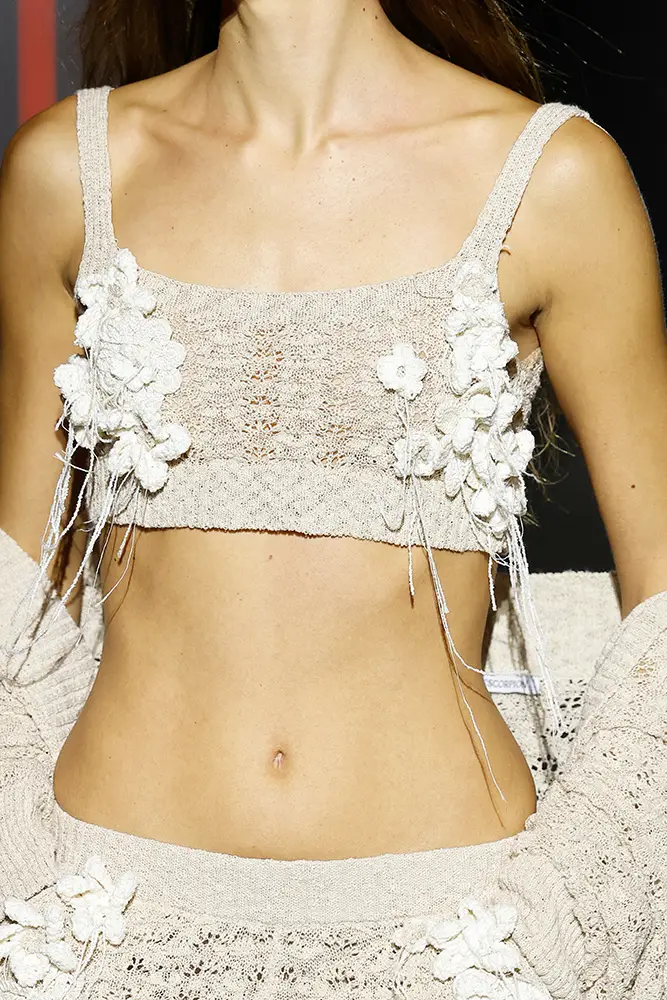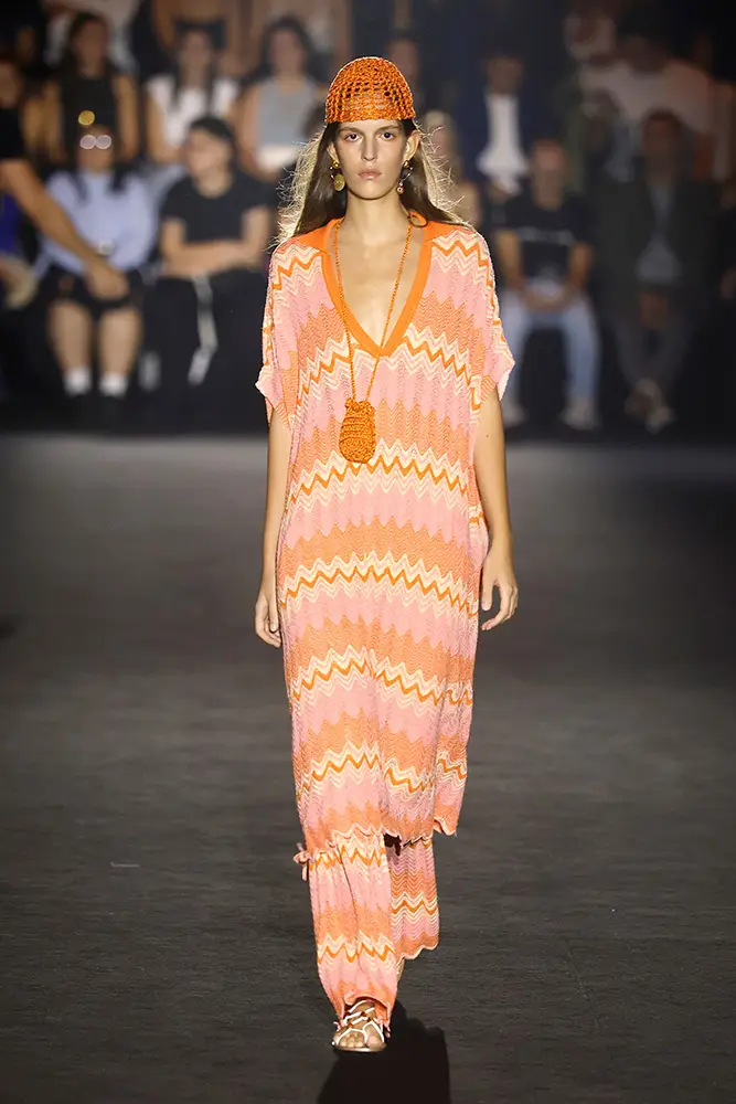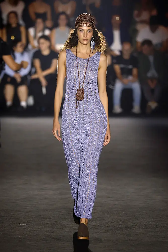 Con el punto como hilo conductor, la propuesta fusiona prendas sofisticadas y versátiles para una mujer libre y contemporánea. Vestidos que se enriquecen con detalles artesanales, como flecos, bordados o aplicaciones que aportan un carácter único y distintivo a cada pieza. Conjuntos coordinados como blusas y tops de punto, combinan con pantalones de tiro alto o shorts adornados con apliques de ganchillo, creando una estética propia de los años setenta.