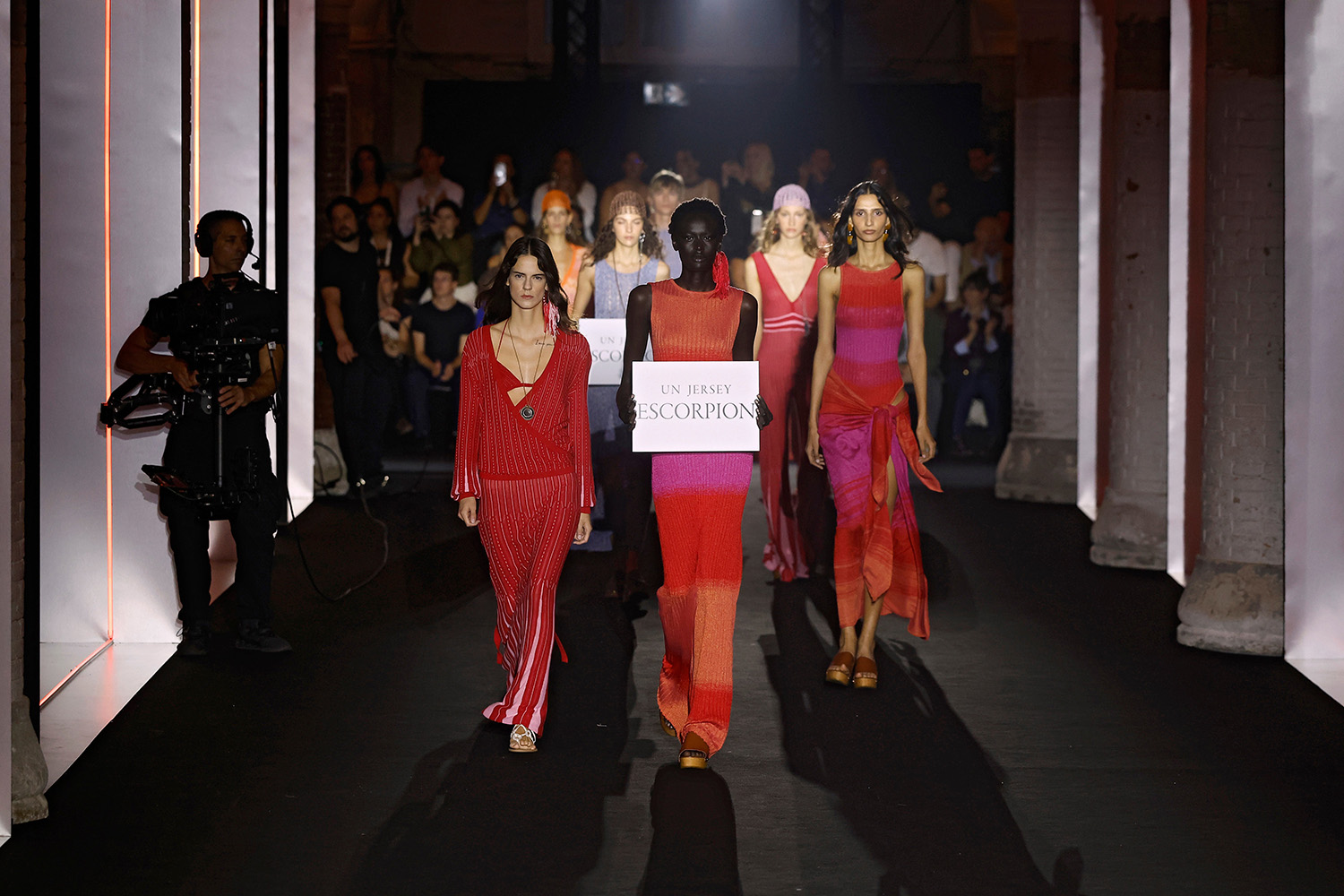 En el carrusel final, las modelos reivindicaron la esencia de la marca con uno de sus míticos carteles, utilizados en sus primeras campañas, donde se puede leer “Un jersey Escorpion”. La esencia de la marca.