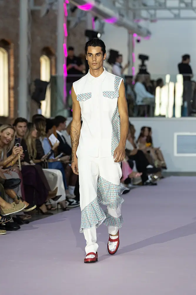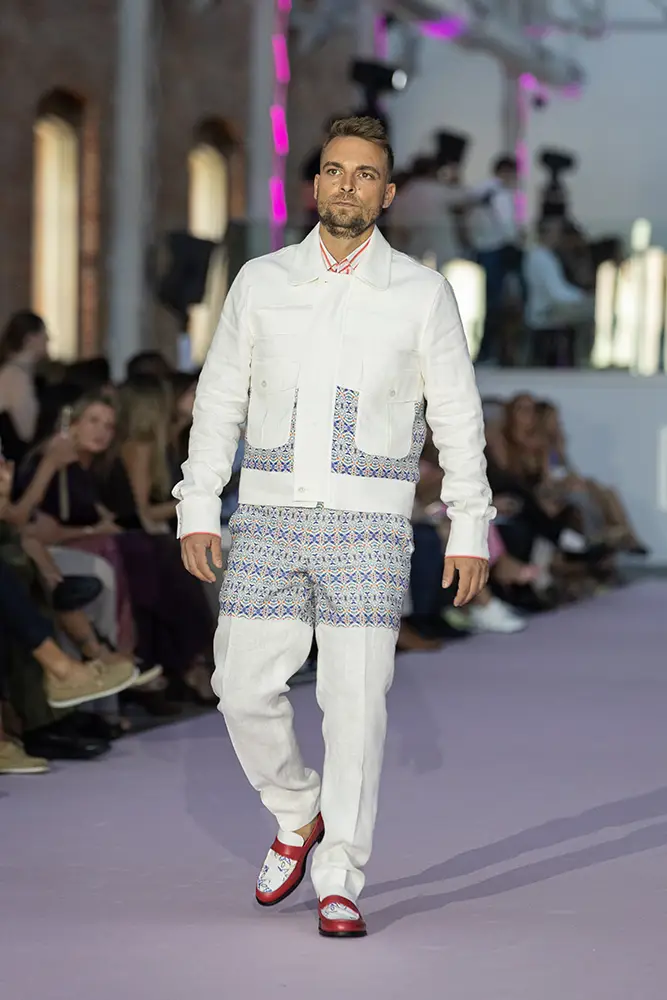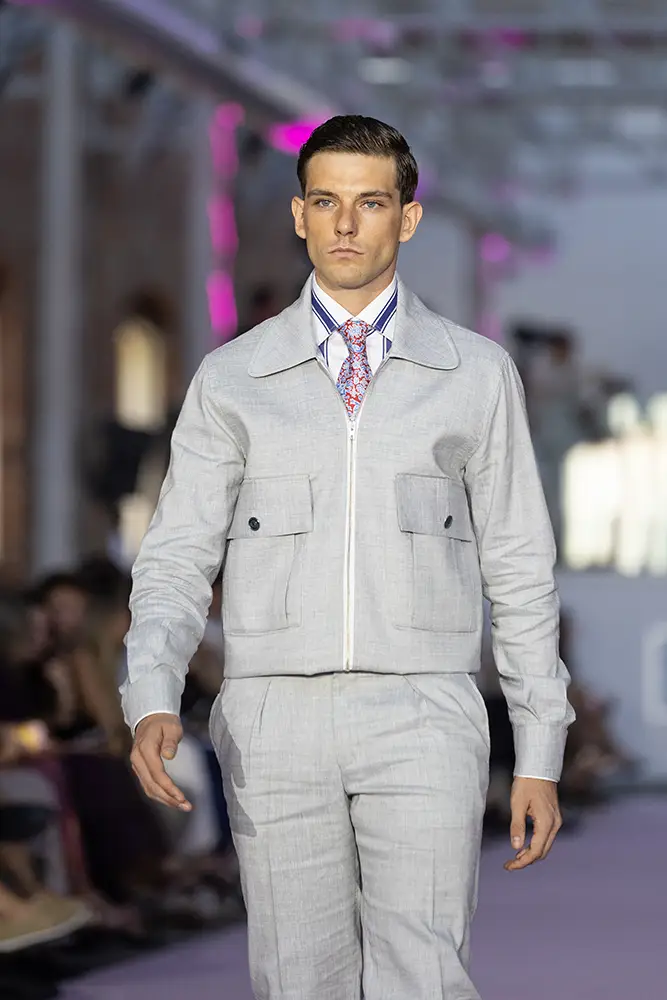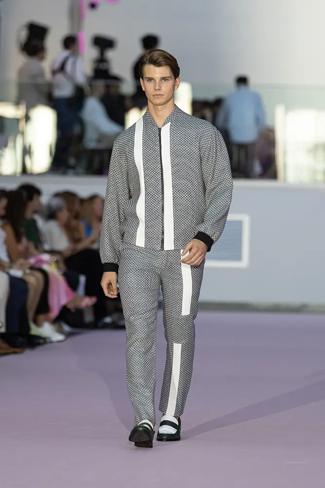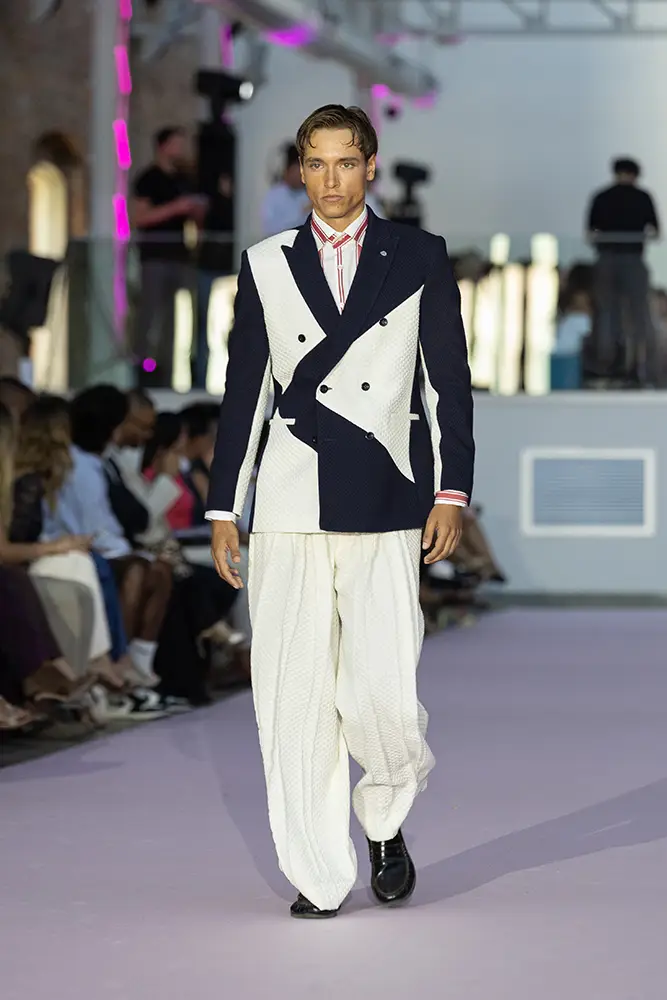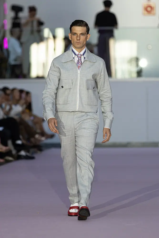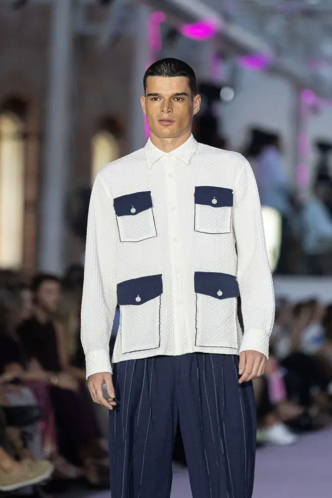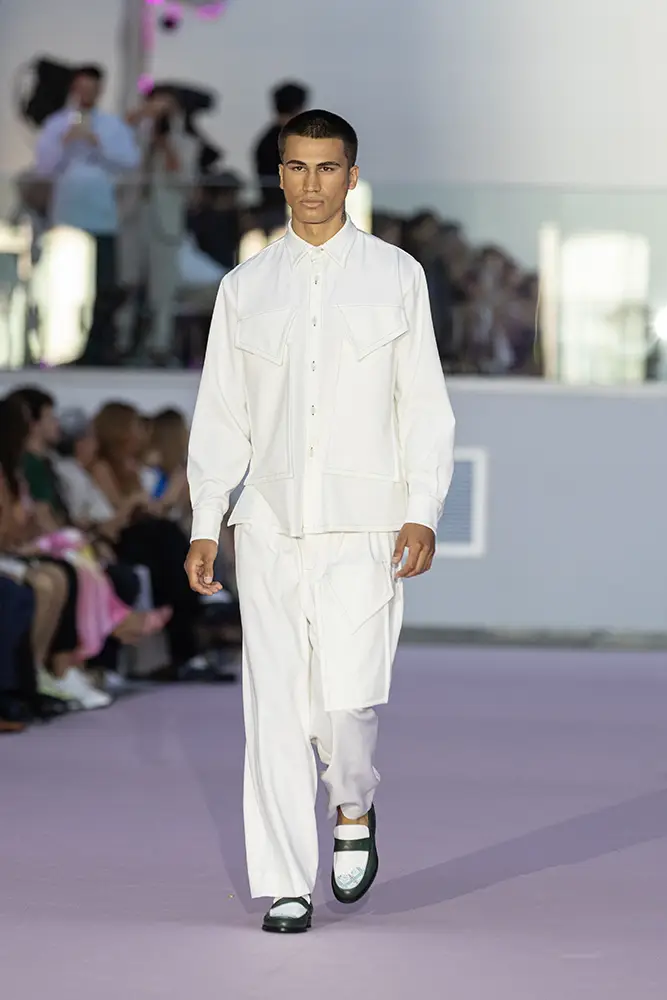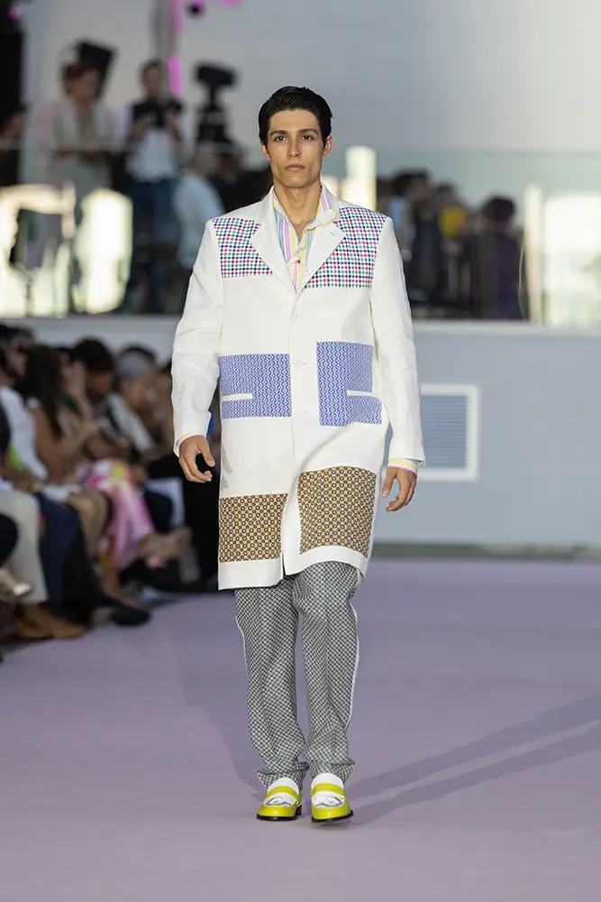 Los tejidos –lino, seda, algodón orgánico, lana fría, popelín, viscosa o lamé – se cruzan con patrones arquitectónicos y reinterpretaciones de la sastrería clásica: carteras asimétricas con pespuntes largos, delanteros “efecto persiana”, juegos de superposiciones y trajes que destacan por su precisión artesanal y carácter innovador.