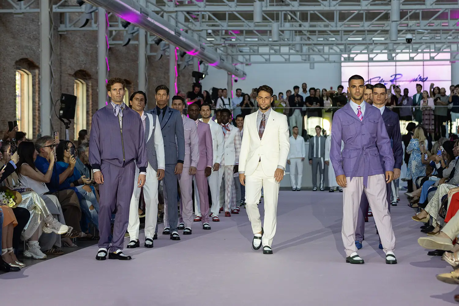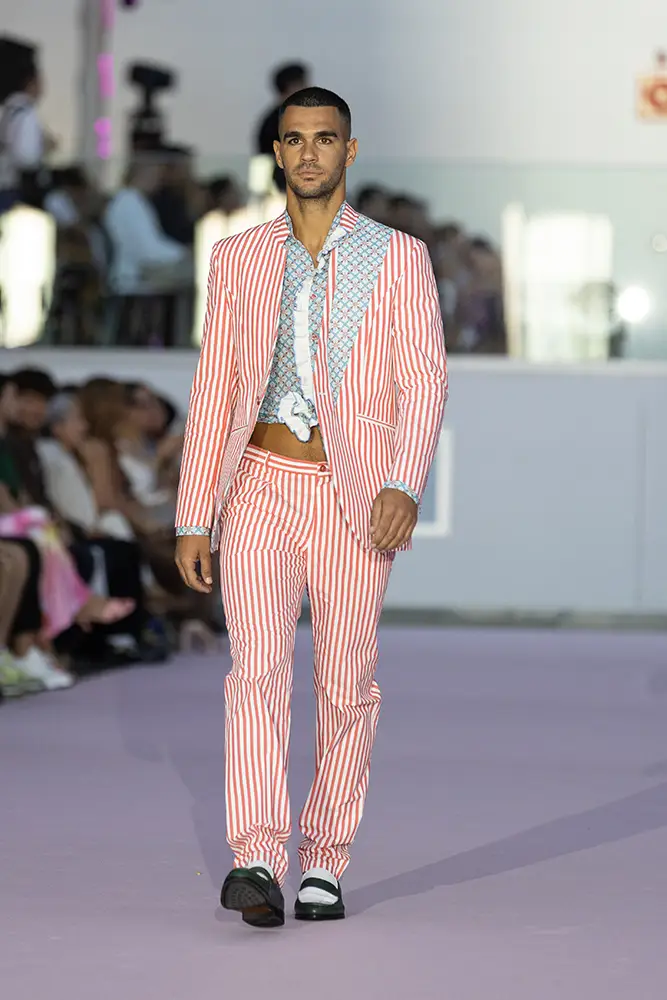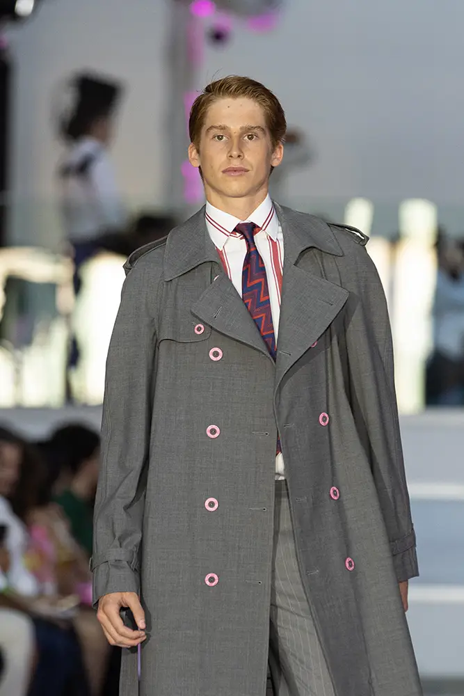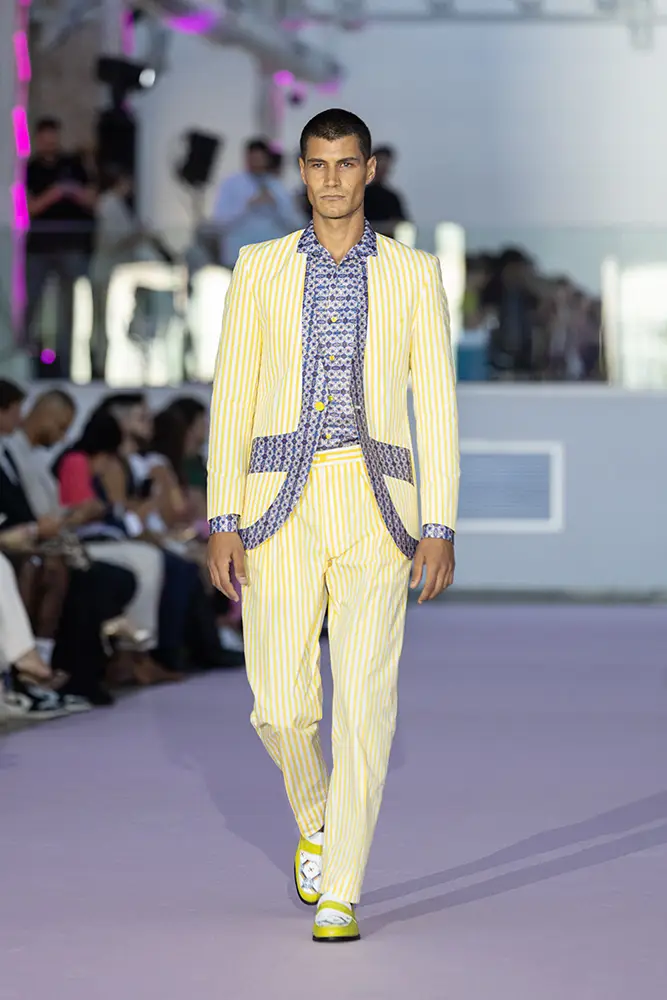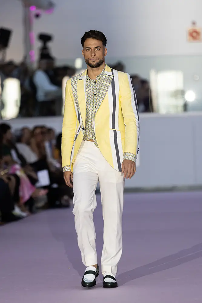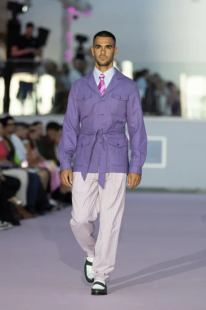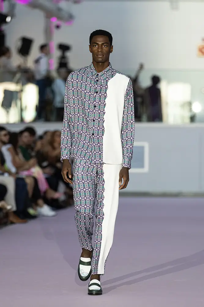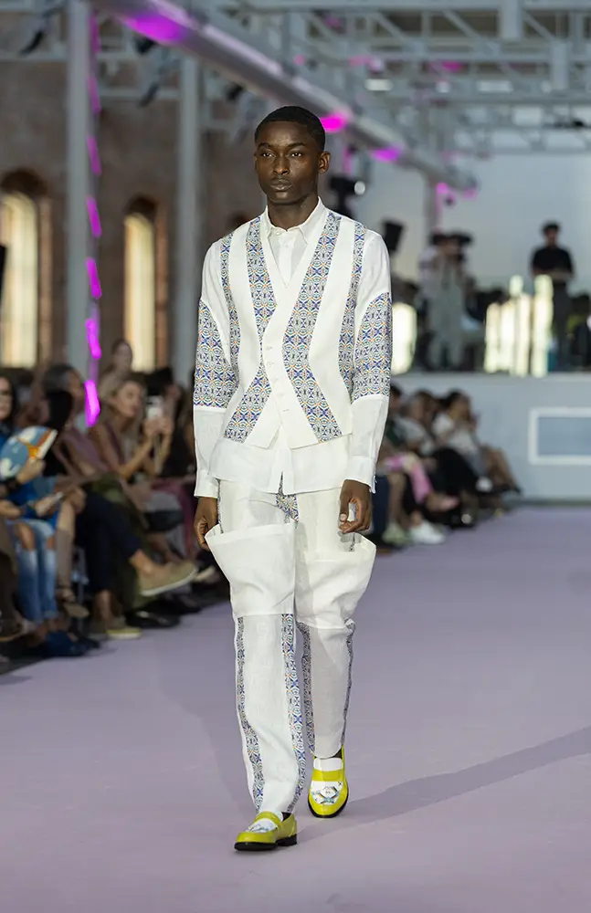Los tejidos –lino, seda, algodón orgánico, lana fría, popelín, viscosa o lamé – se cruzan con patrones arquitectónicos y reinterpretaciones de la sastrería clásica: carteras asimétricas con pespuntes largos, delanteros “efecto persiana”, juegos de superposiciones y trajes que destacan por su precisión artesanal y carácter innovador.
