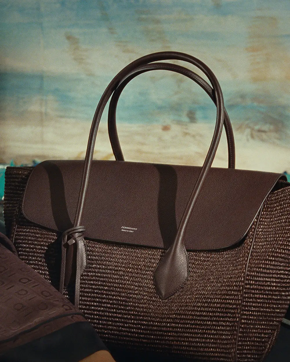 A medida que se acerca el verano, también lo hacen las estrellas de la temporada: sandalias esféricas de tacón de corcho con adornos de rafia; bolsos Gancini tejidos a mano; mules de caballero sin cordones. Protagonizado por materiales naturales que rinden homenaje a la innovación de la que Salvatore Ferragamo fue pionero, el capítulo se aleja para revelar una técnica cinematográfica que utiliza retazos de tela para presentar la ilusión de olas ondulantes.