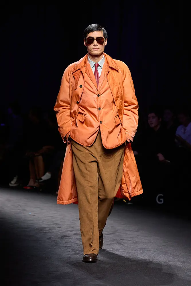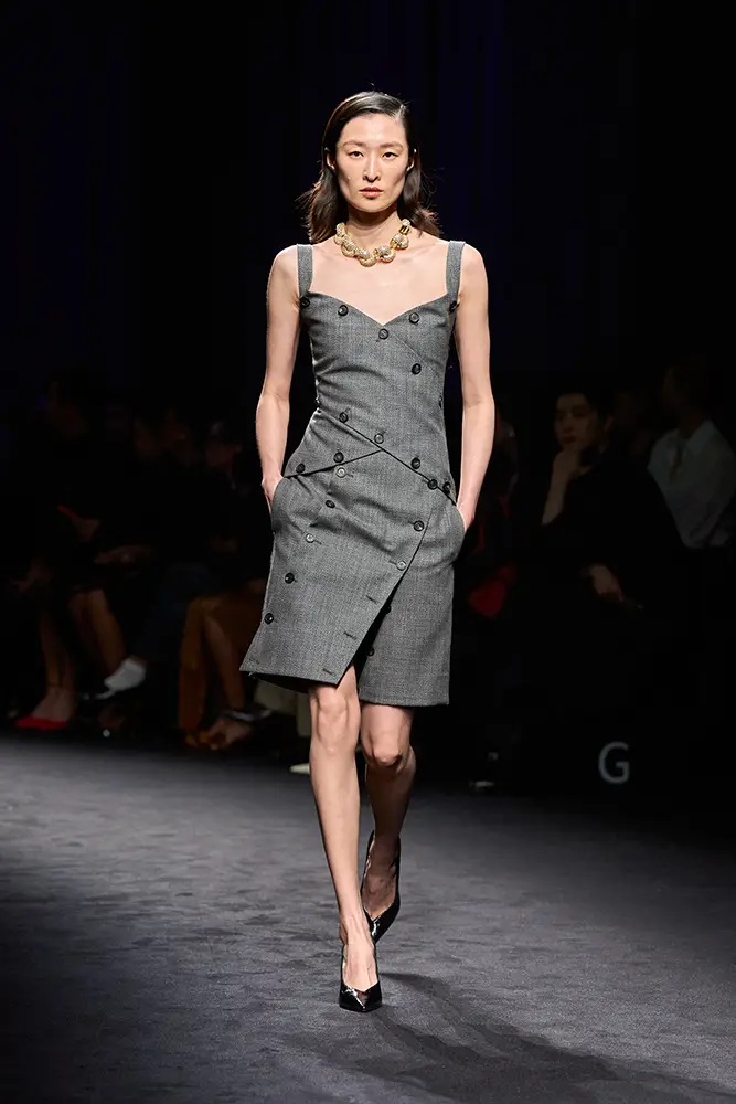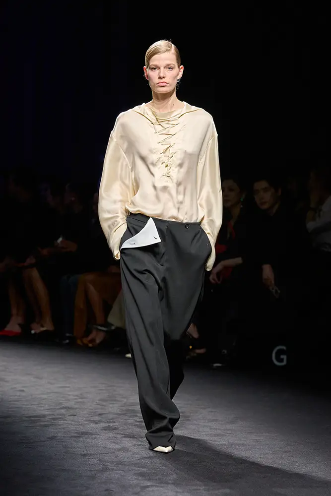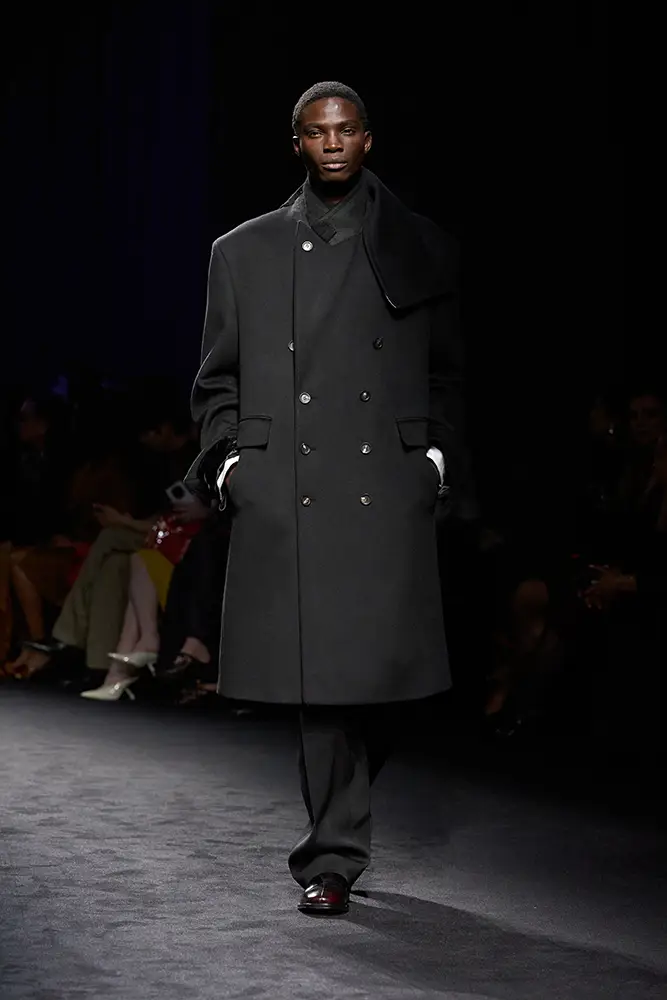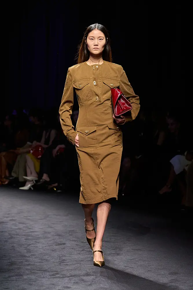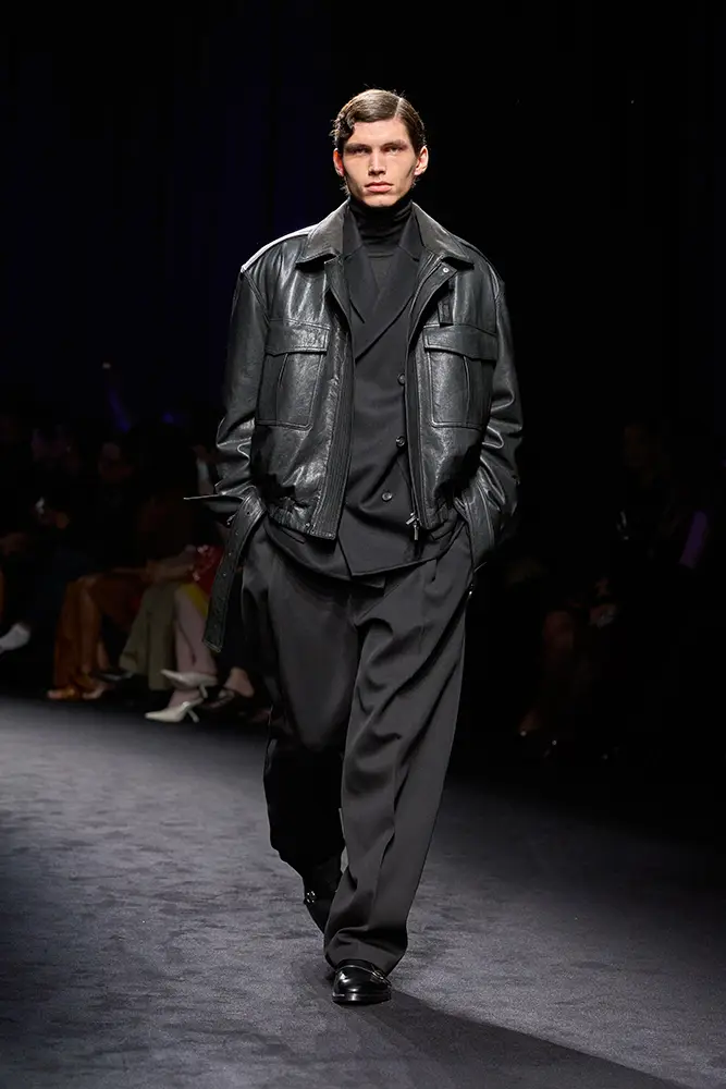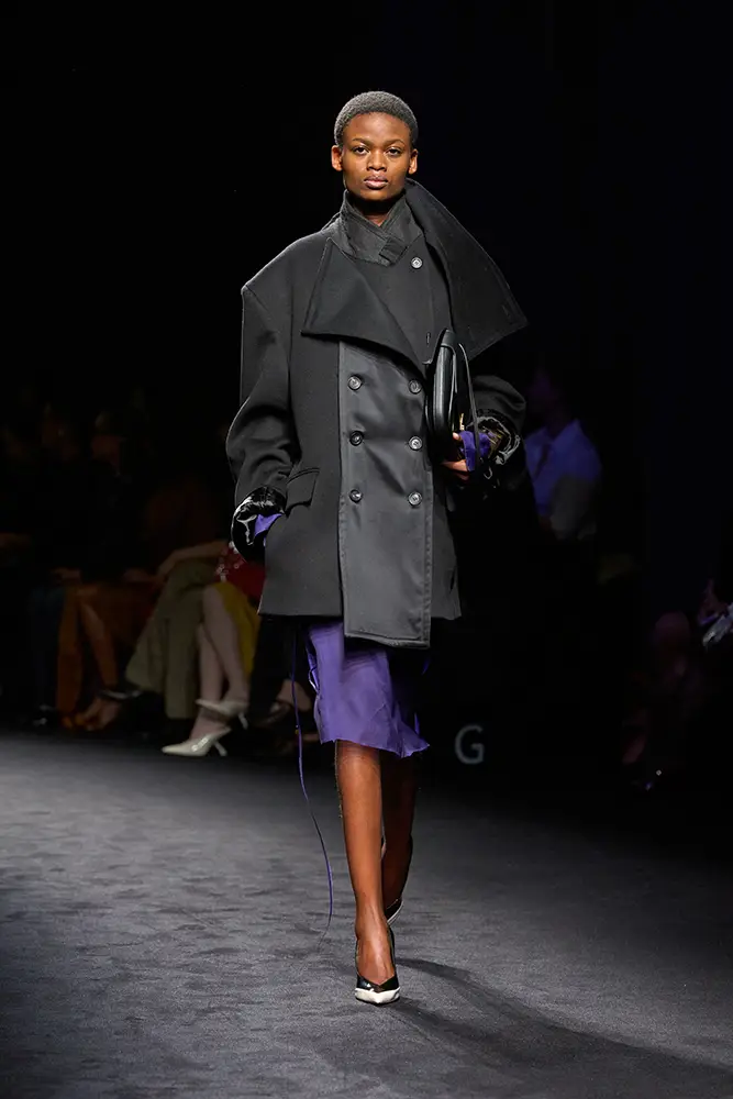Junto a la vestimenta utilitaria, emerge la elegancia desenfadada de la ropa de noche de la época: vestidos lenceros de lamé de terciopelo metalizado y jacquard floral; drapeados decorados con volúmenes que evocan la evolución de los volantes; prendas de abrigo envolventes que evocan siluetas de alta costura, superpuestas sobre vestidos largos. En la colección, como en el bar clandestino, ambas se entremezclan.