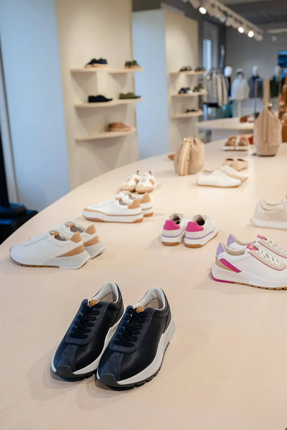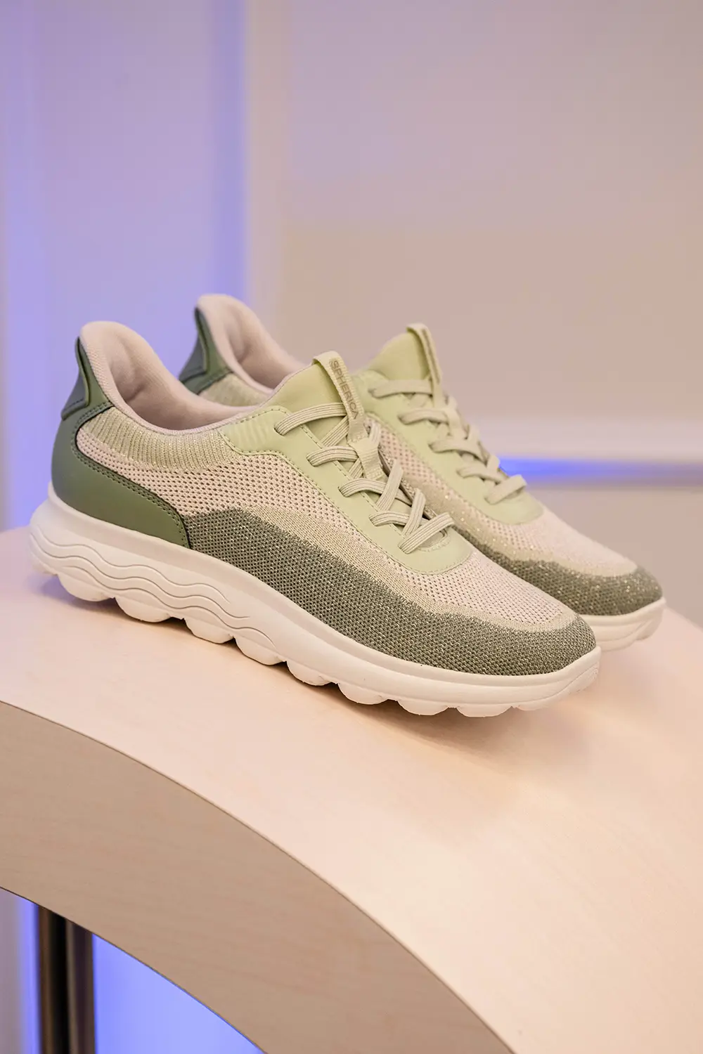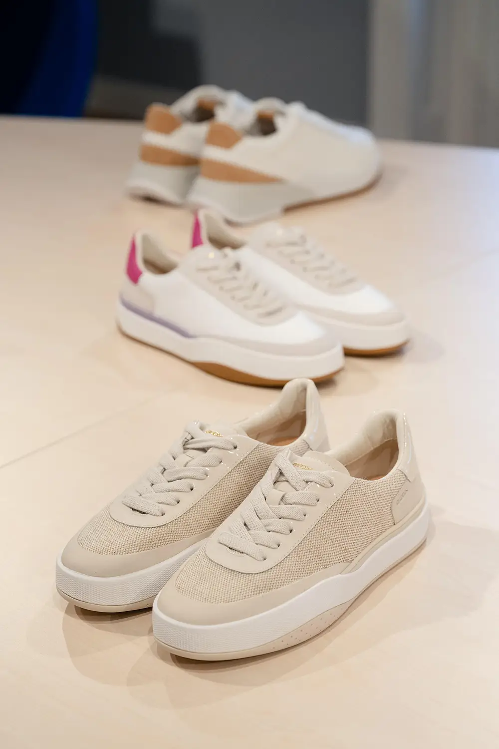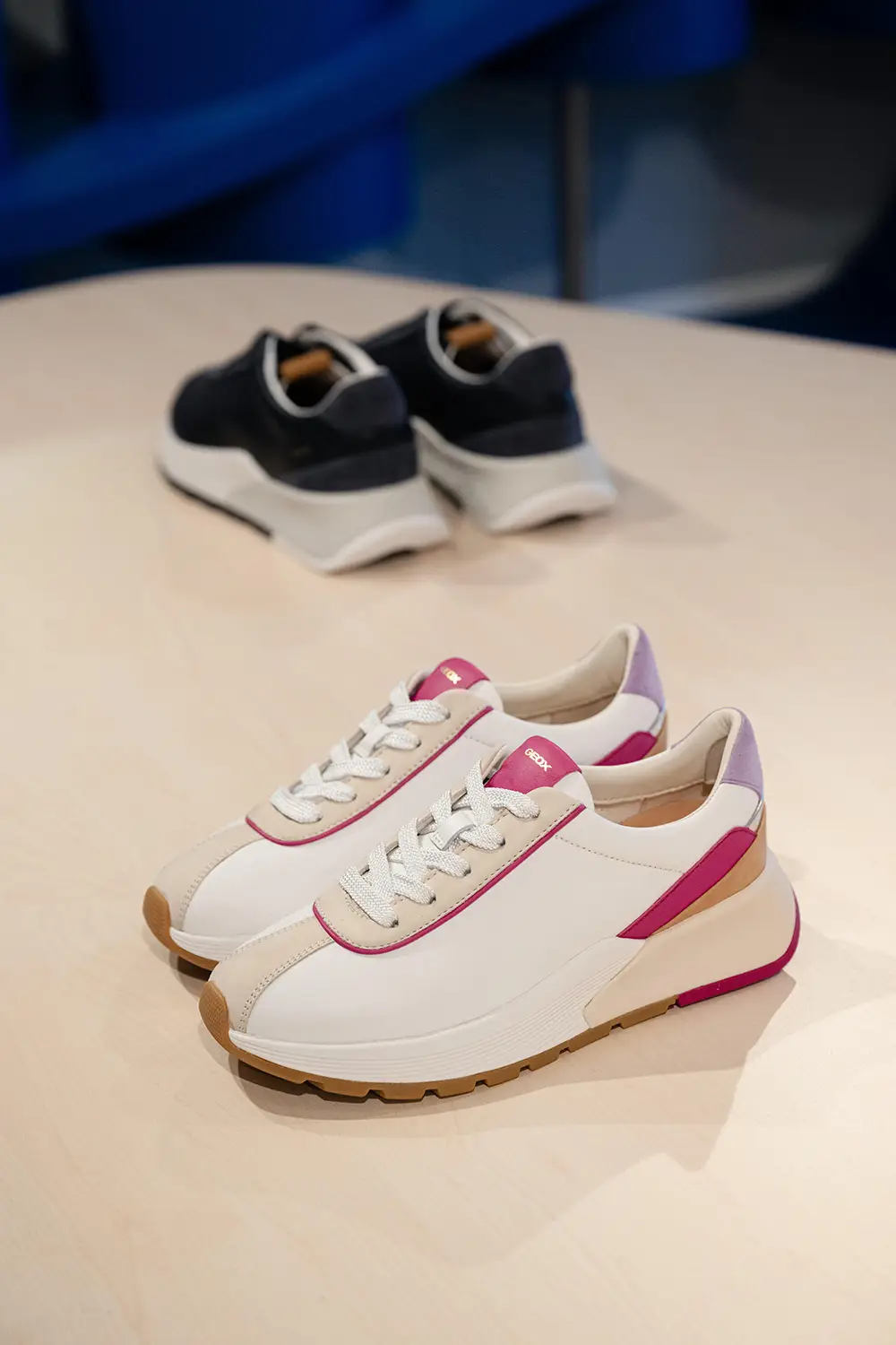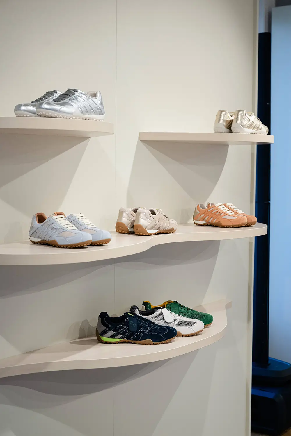 Las zapatillas exploran tendencias contemporáneas con suelas gruesas, siluetas estilizadas, combinaciones de materiales como ante, lona y cuero, y detalles llamativos como neones, brillo o cordones contrastantes. La colección también mira al pasado con modelos retro como Snake Original, ahora en versión femenina con tonos pastel y metálicos, y a la innovación con Blue Touch, minimalista, tecnológica y con un diseño retro visible gracias a su inserto azul “Respira”.