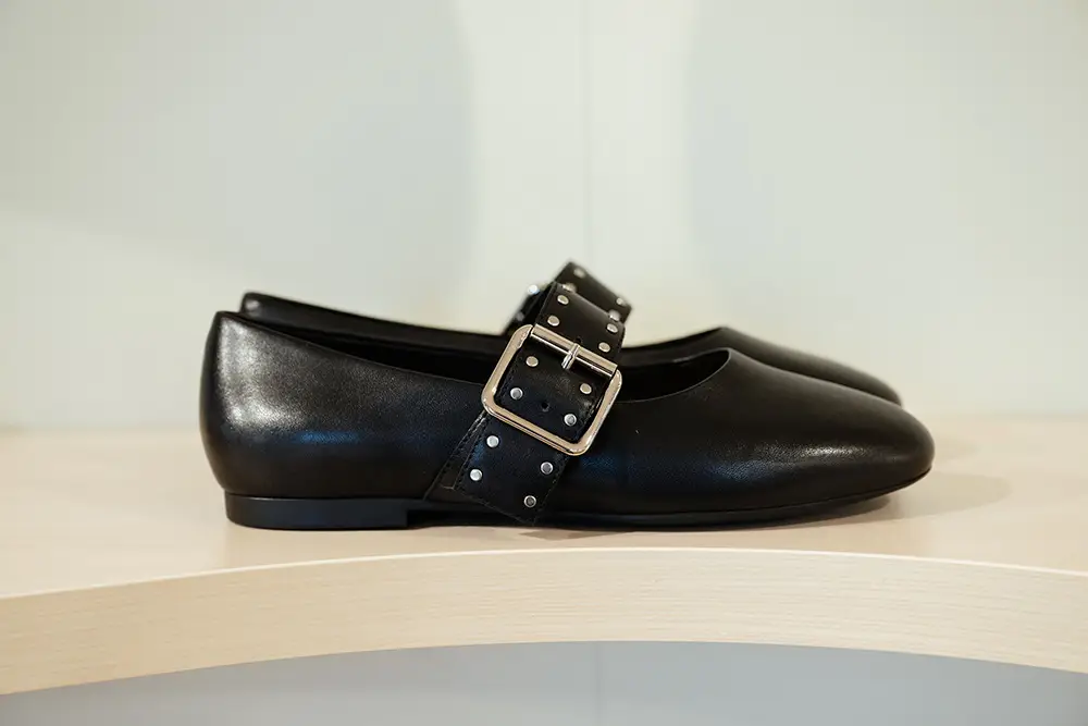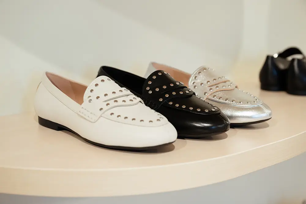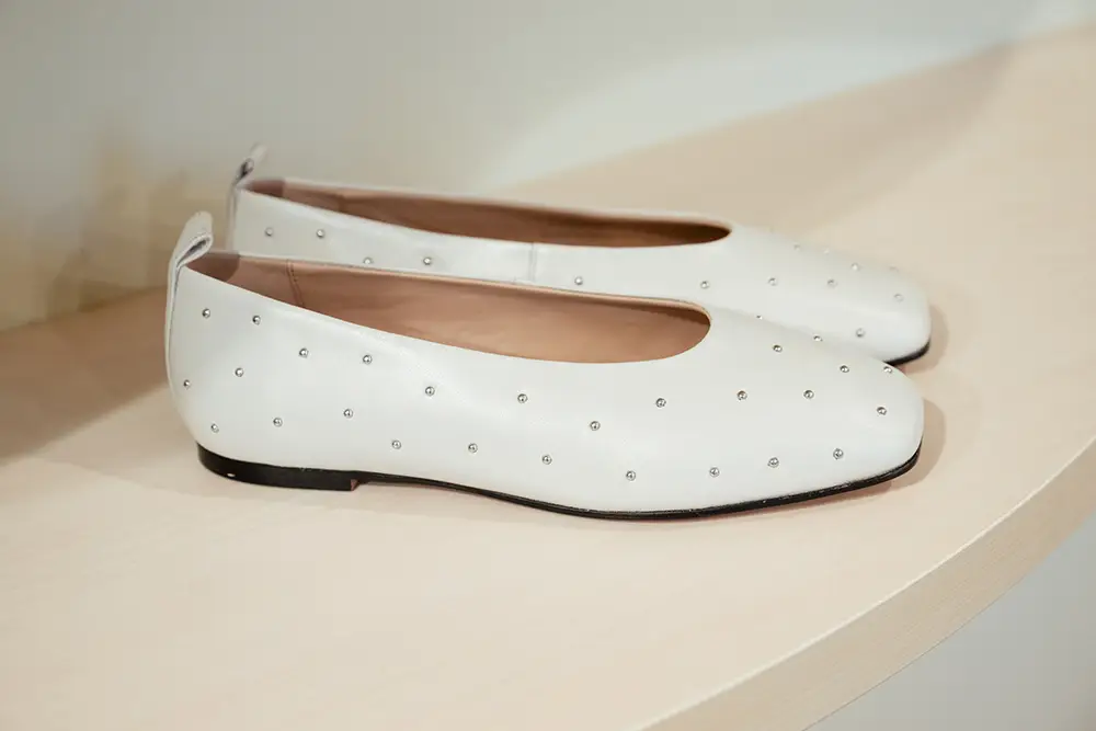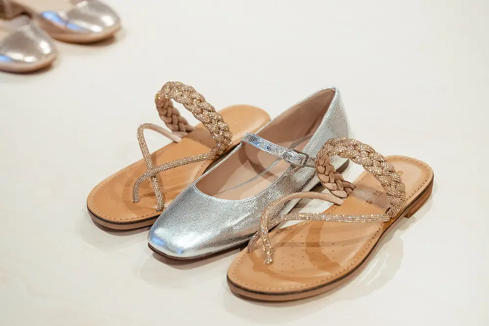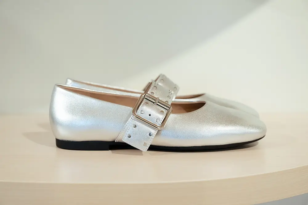 En la línea más formal y sofisticada, destacan bailarinas, mocasines y sandalias de tiras cruzadas o slingbacks de altura media, en charol o cuero metálico, con detalles delicados como lazos y studs planos. Las paletas incluyen verde menta, rojo fresa y púrpura pálido, combinando elegancia y comodidad para cualquier momento del día.
