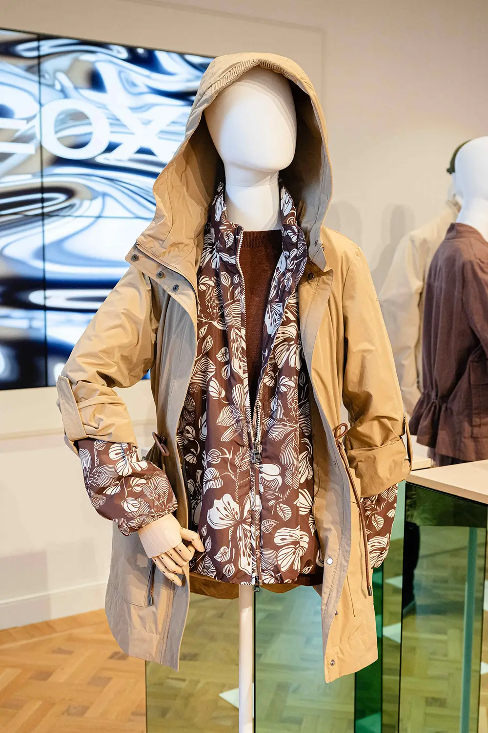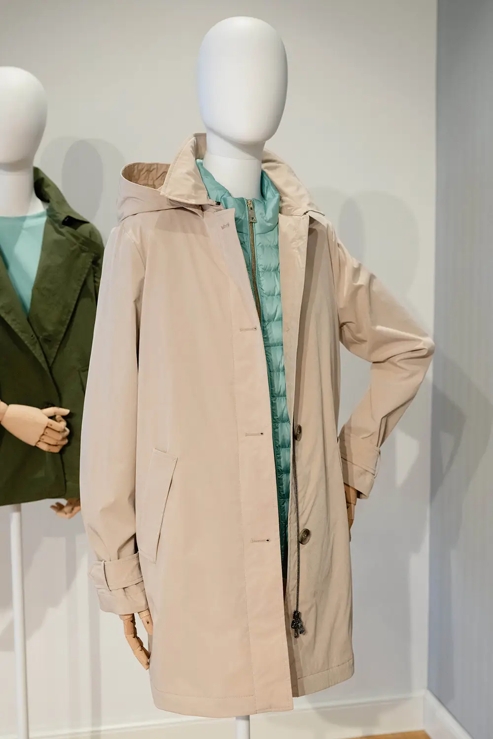 Los tejidos incluyen combinaciones naturales como lino y algodón, así como materiales tecnológicos con acabados mate o brillantes, siempre con atención al detalle: cuellos elegantes, fruncidos delicados y cordones que definen la silueta.