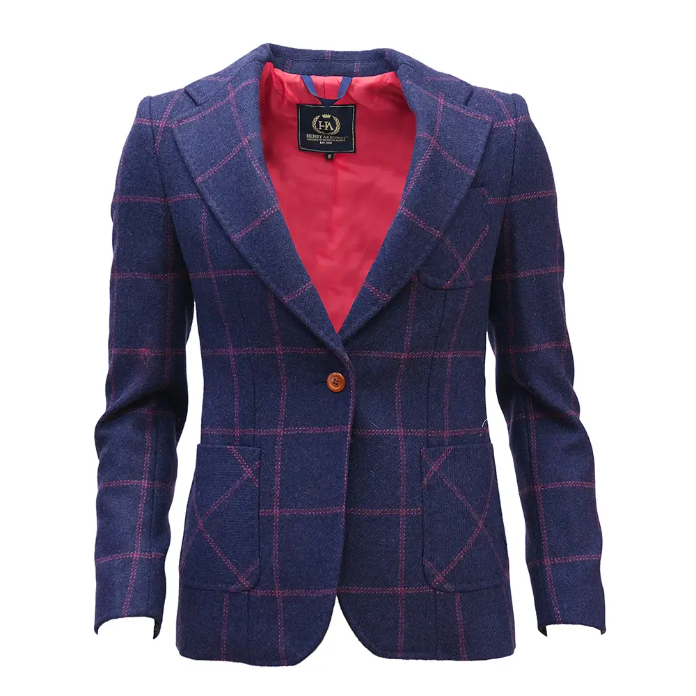 La silueta ajustada, femenina y refinada de Marylin también se traslada a Evelyn, un modelo de blazer estampado de cuadros de color azul marino y detalles rosas en la parte exterior y su forro que convergen en la mezcla perfecta entre lo clásico y la tendencia; logrando una americana femenina, sofisticada y con carácter.