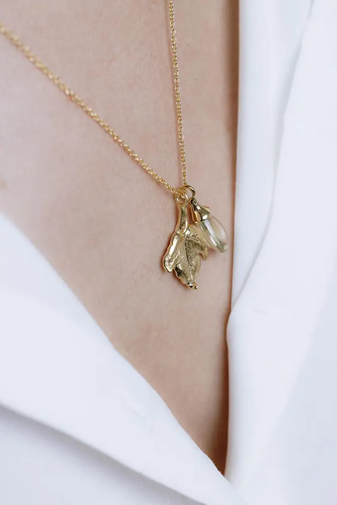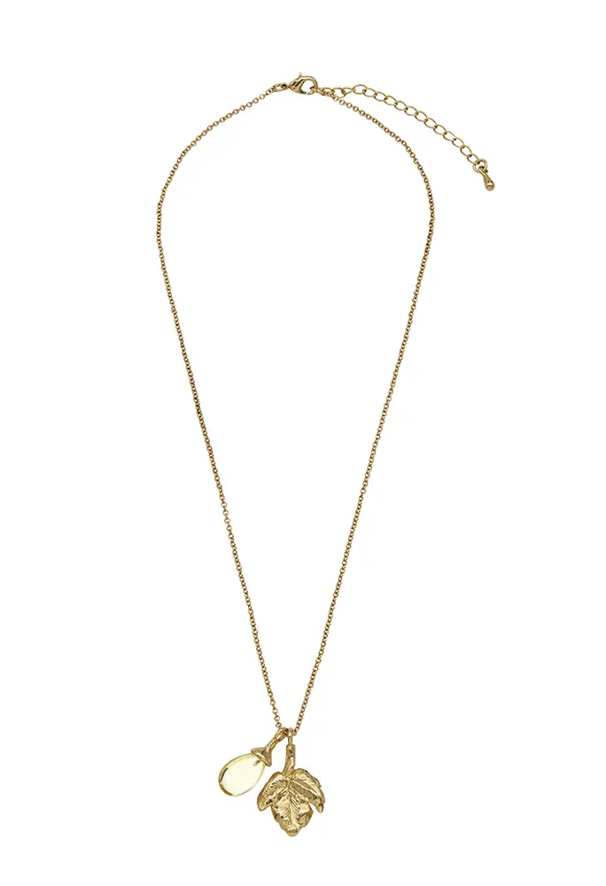 La gargantilla Malvasía con cuarzo limón es una pieza delicada y llena de movimiento. Inspirada también en la uva Malvasía, su diseño incorpora dos charms: una hoja de parra y un cuarzo limón tallado con forma de uva, que se balancean suavemente con cada gesto.