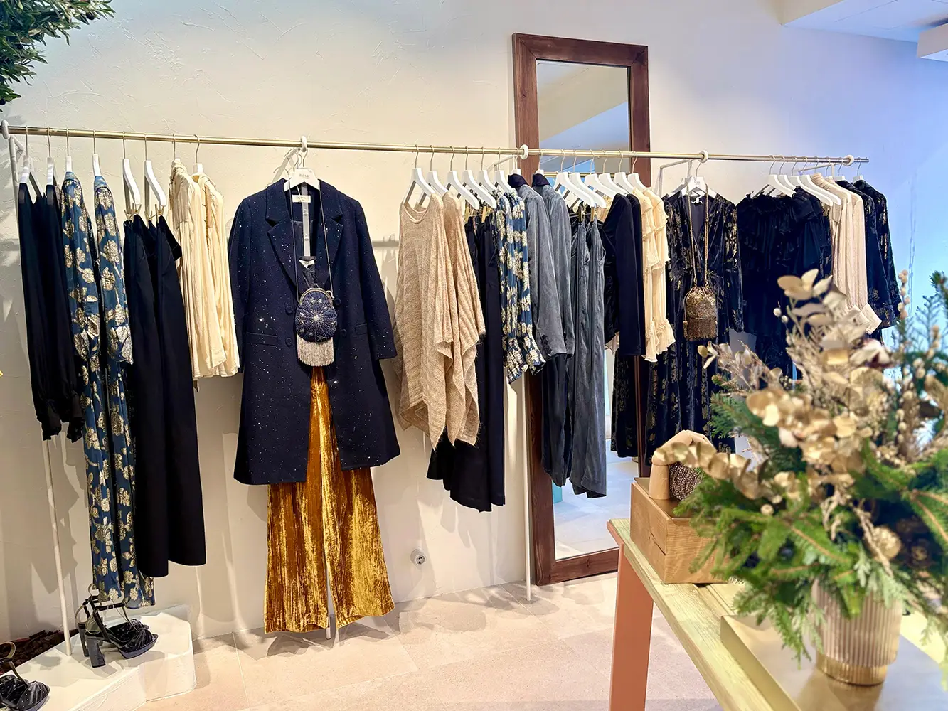 Las prendas integran tejidos nobles como el terciopelo, tejidos con lentejuelas y bordados de abalorios, aportando brillo y detalle artesanal. Cada look se completa con piezas únicas y originales, que aportan ese toque especial y diferenciado. Todo está trabajado con un enfoque delicado y refinado, perfecto para quienes buscan elegancia con personalidad para días señalados.
