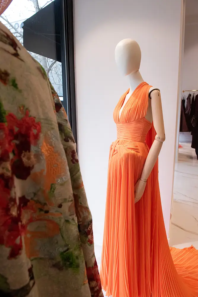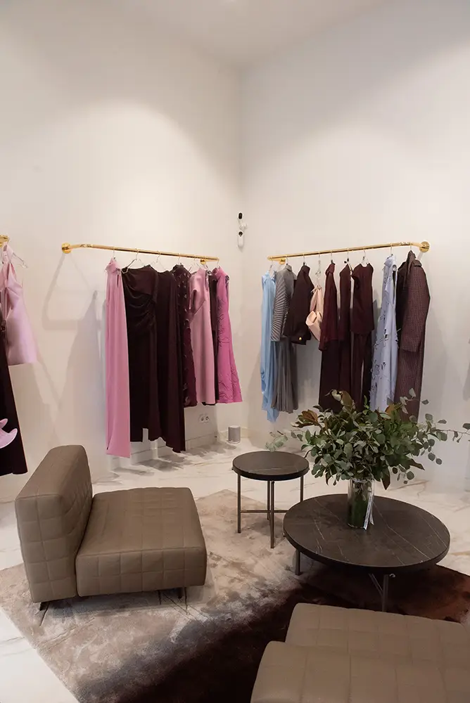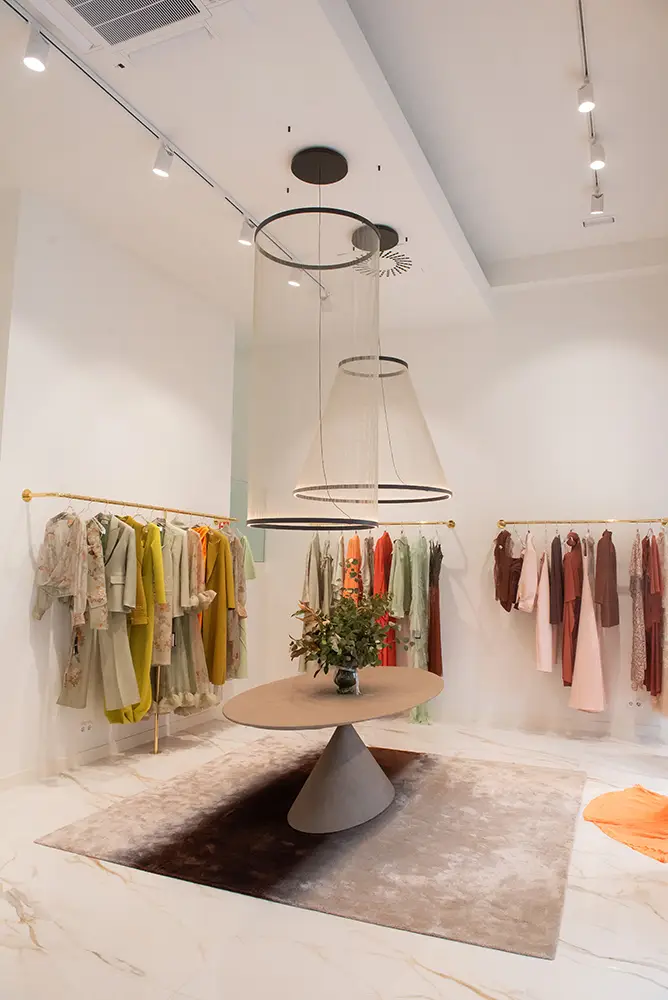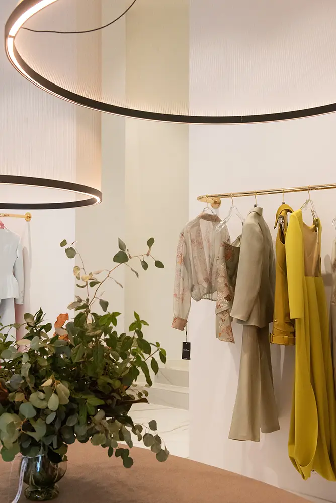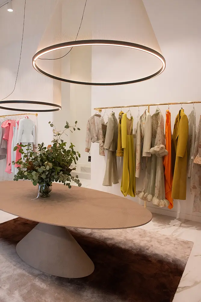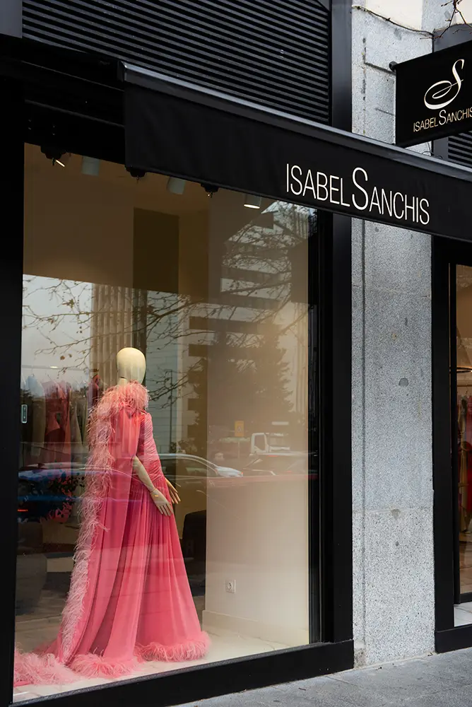 La boutique ofrece una experiencia coherente con el ADN de Isabel Sanchis, donde conviven sus colecciones de prêt-à-porter, costura, novia y alta moda en un entorno elegante, amplio y luminoso. Cada detalle del espacio ha sido concebido para acompañar y realzar las piezas, sin restarles protagonismo.