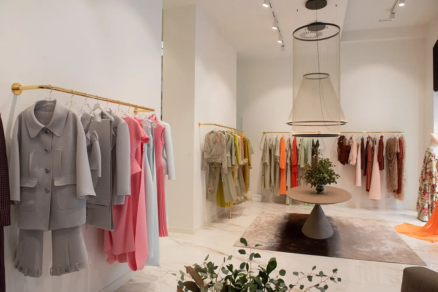 El interior de la boutique se concibe como una prolongación natural de su universo estético. Líneas limpias y arquitectura depurada se combinan con materiales nobles como el mármol veteado en suelos y escaleras, barandillas de vidrio y sutiles acentos en latón dorado. La iluminación, pensada para destacar volúmenes y texturas, se integra con un mobiliario de formas orgánicas y tonos neutros, creando una atmósfera sofisticada y serena.