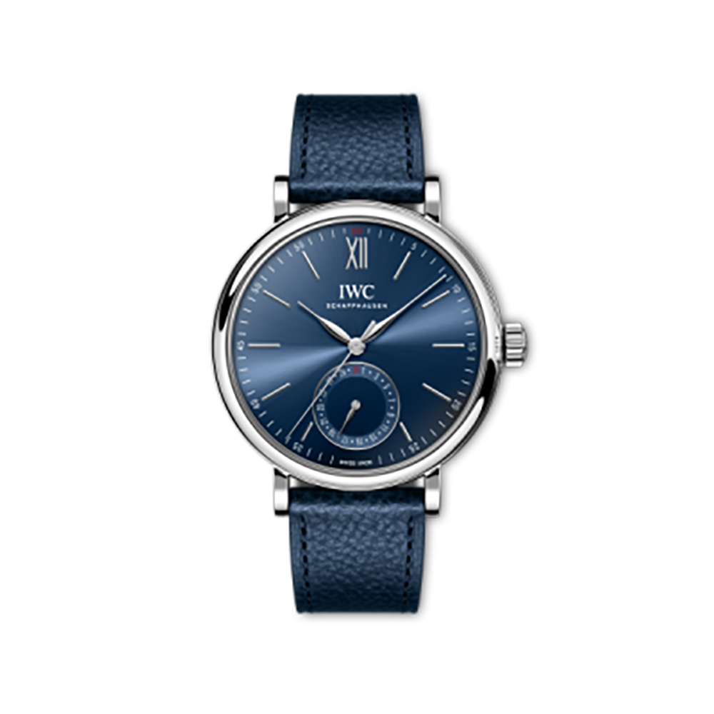 El Portofino Automático Puntero Fecha Laureus (Ref. IW359202) presenta una caja de acero inoxidable de 39 milímetros y una esfera con acabado de rayos de sol en el característico color azul Laureus. Los índices aplicados, el número romano «XII» a las 12 horas y las agujas están chapadas en rodio.