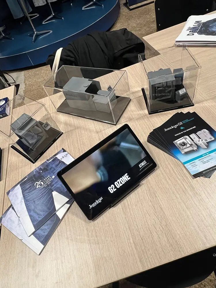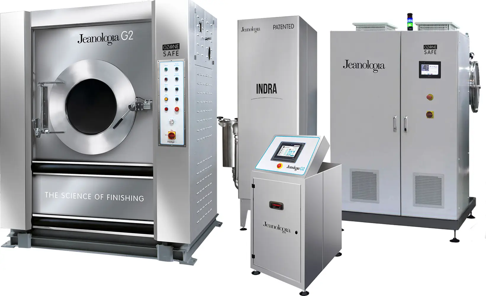 - G2 Ozone Indra, cuyo proceso ATMOS crea abrasiones y una amplia gama de lavados, desde los azules índigo más profundos hasta tonos claros, negros y grises. Esta innovadora “lavadora de aire” sustituye los métodos tradicionales por ozono y un control preciso de la humedad, logrando acabados auténticos sin agua, sin químicos y sin piedra pómez, reduciendo el impacto ambiental y los costes.