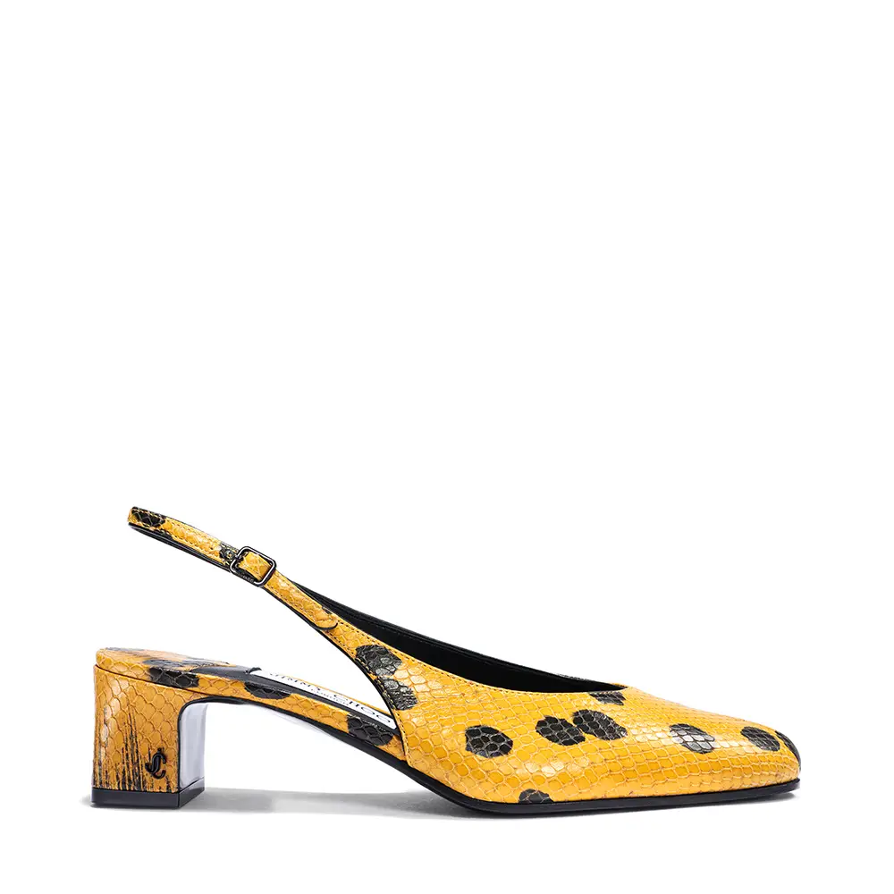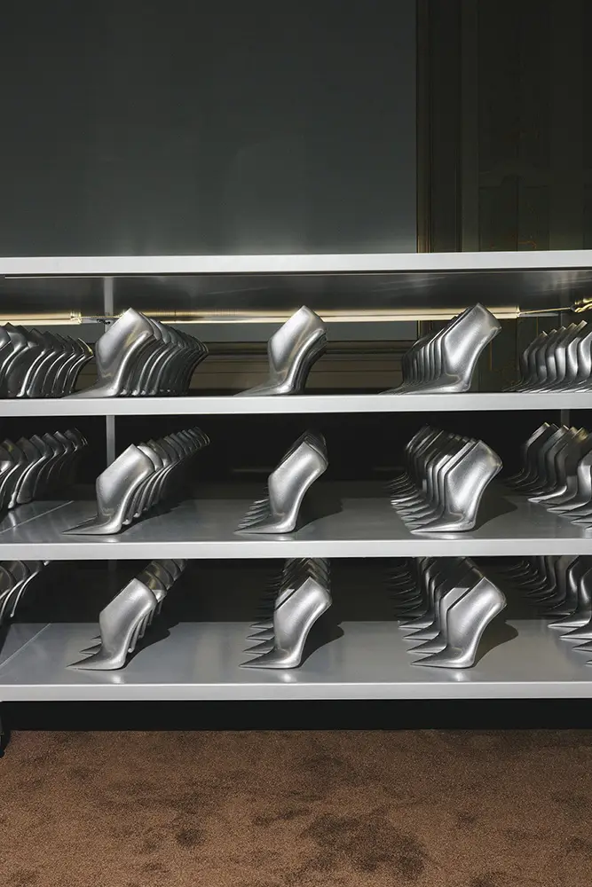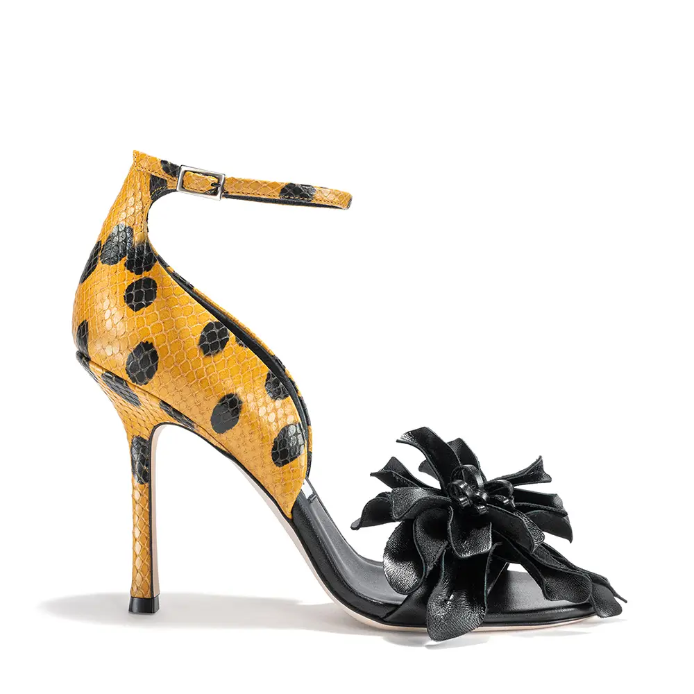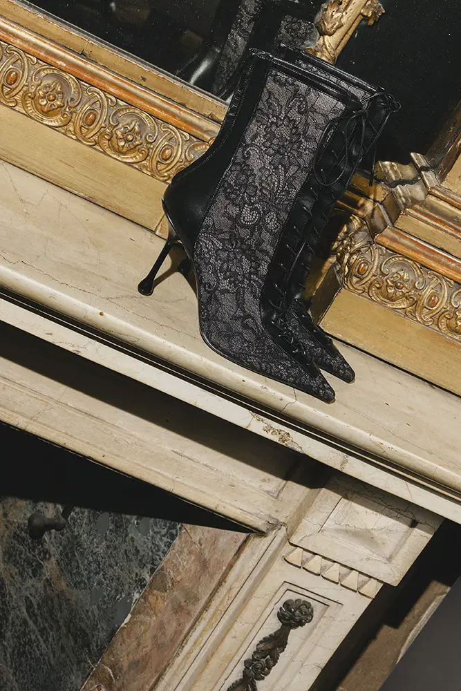 En el otro extremo del espectro, una referencia al estilo Y2K de una nueva silueta icónica, esta temporada, la SCARLETT se presenta en encaje y piel napa con el característico cordón corsé que recorre el pie y la pierna, elevándose hasta la rodilla o el tobillo. La bota CALY inspira una versión moderna del estilo Mod, con un tacón grueso de 85 mm por encima de la rodilla o un tacón de 45 mm de corte pronunciado a media pantorrilla, ambas en piel suave y pulida. El tacón bajo EYLA, con su talón destalonado y puntera estrecha y redondeada, ofrece una estética femenina para el día a día, práctica, atemporal y refinada. Presentada originalmente en el año 2000, la distintiva serpiente con estampado de lunares sigue animando los zapatos y el bolso CINCH.