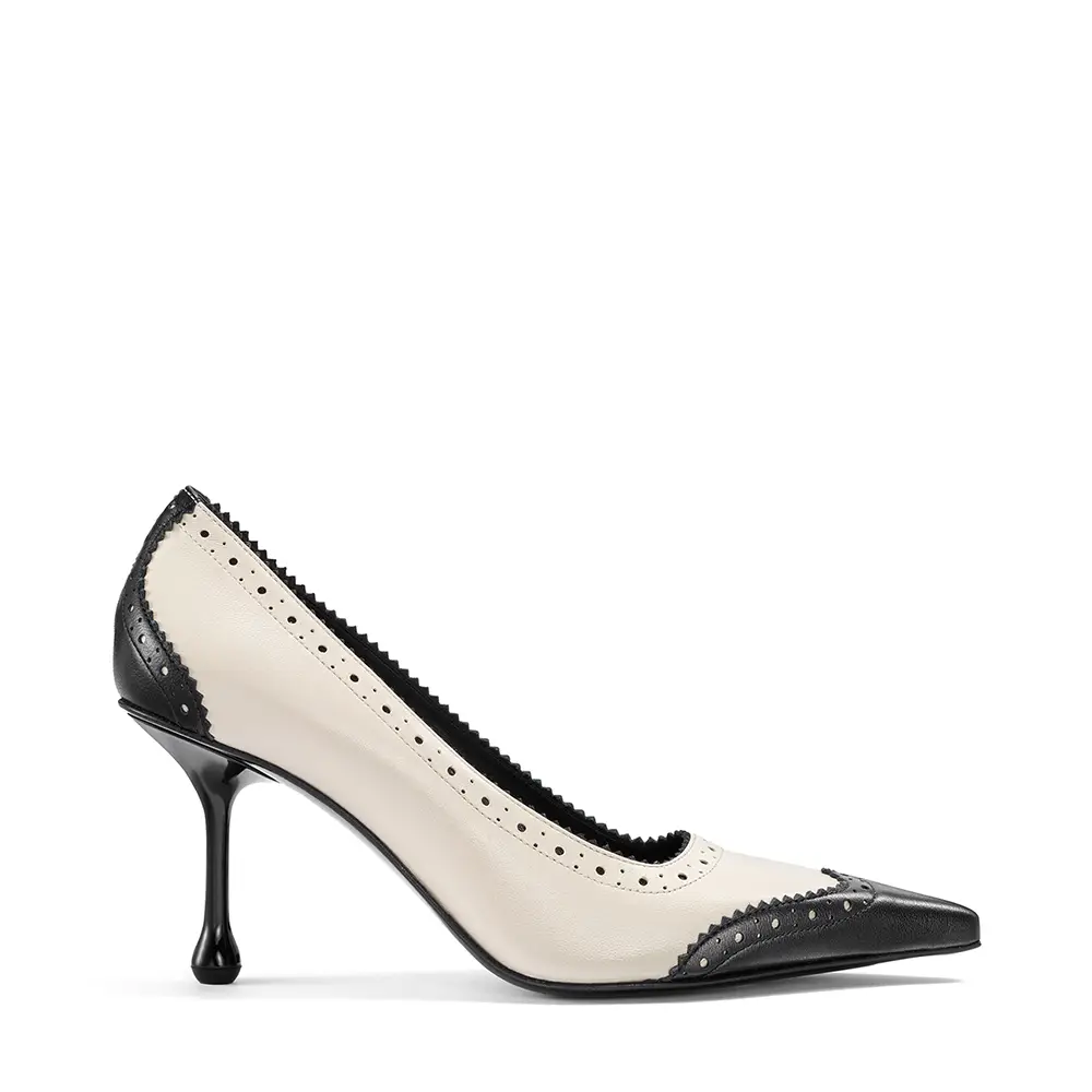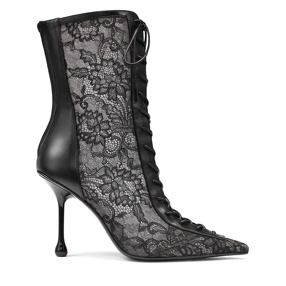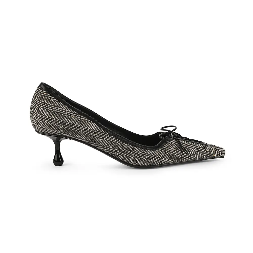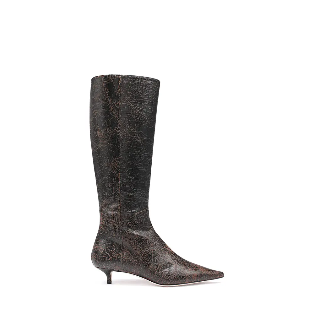 En el otro extremo del espectro, una referencia al estilo Y2K de una nueva silueta icónica, esta temporada, la SCARLETT se presenta en encaje y piel napa con el característico cordón corsé que recorre el pie y la pierna, elevándose hasta la rodilla o el tobillo. La bota CALY inspira una versión moderna del estilo Mod, con un tacón grueso de 85 mm por encima de la rodilla o un tacón de 45 mm de corte pronunciado a media pantorrilla, ambas en piel suave y pulida. El tacón bajo EYLA, con su talón destalonado y puntera estrecha y redondeada, ofrece una estética femenina para el día a día, práctica, atemporal y refinada. Presentada originalmente en el año 2000, la distintiva serpiente con estampado de lunares sigue animando los zapatos y el bolso CINCH.
