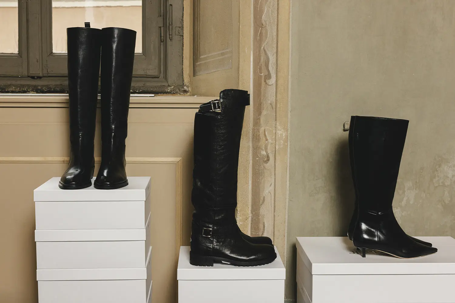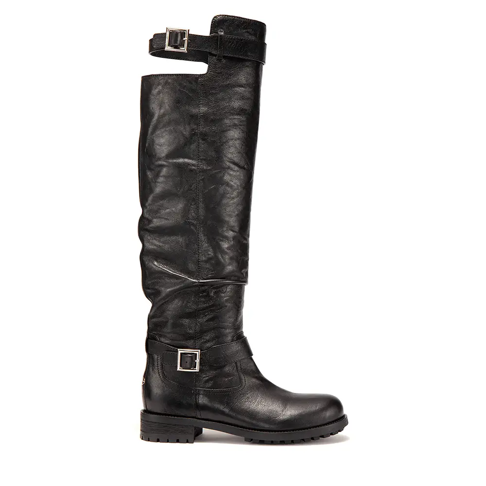 La propuesta abarca cada faceta de las botas Jimmy Choo: desde estilos diarios con tacón bajo y hasta la rodilla, hasta botas vaqueras con plataforma y fantasías nocturnas. El icónico Jimmy Choo BIKER, un básico para las chicas más atrevidas, es una propuesta central; se ofrece en una bota de caña alta hasta la rodilla con detalle de hebilla en el tobillo, en cuero resistente y elegante. El original se presenta en cuero biker en marrón, negro y ante aterciopelado: una reencarnación de este clásico moderno tan querido.
