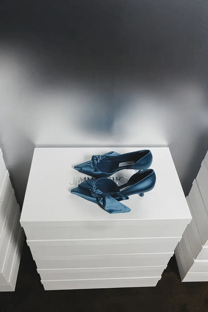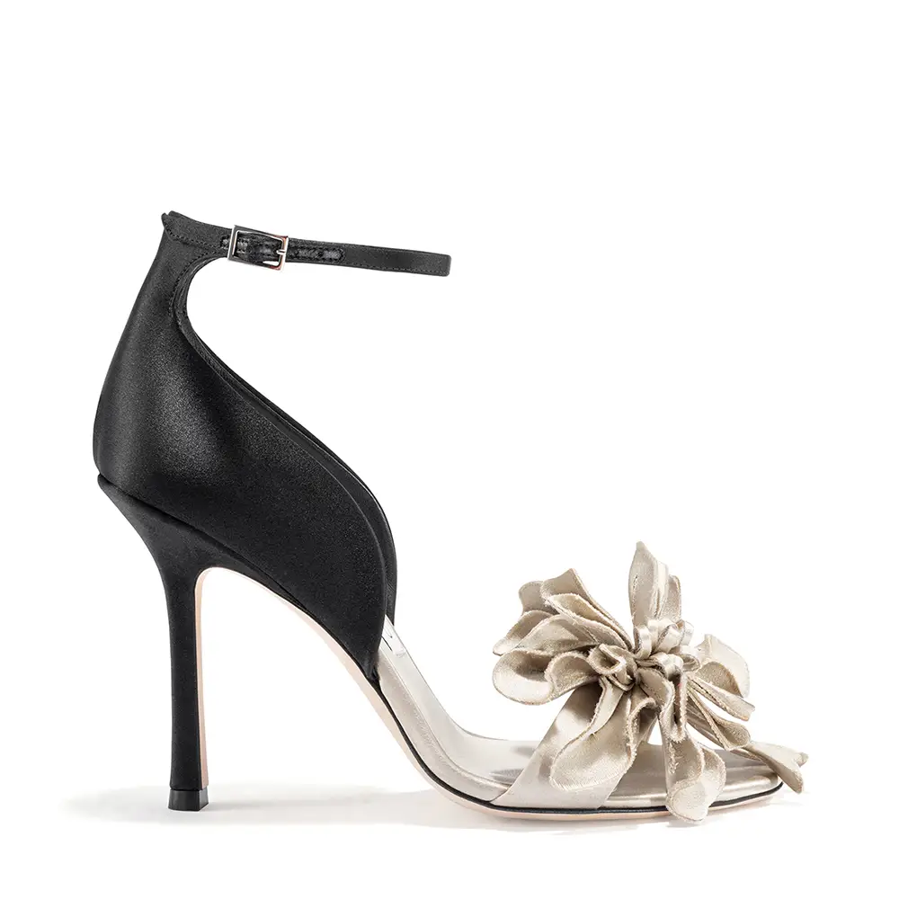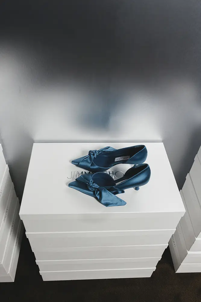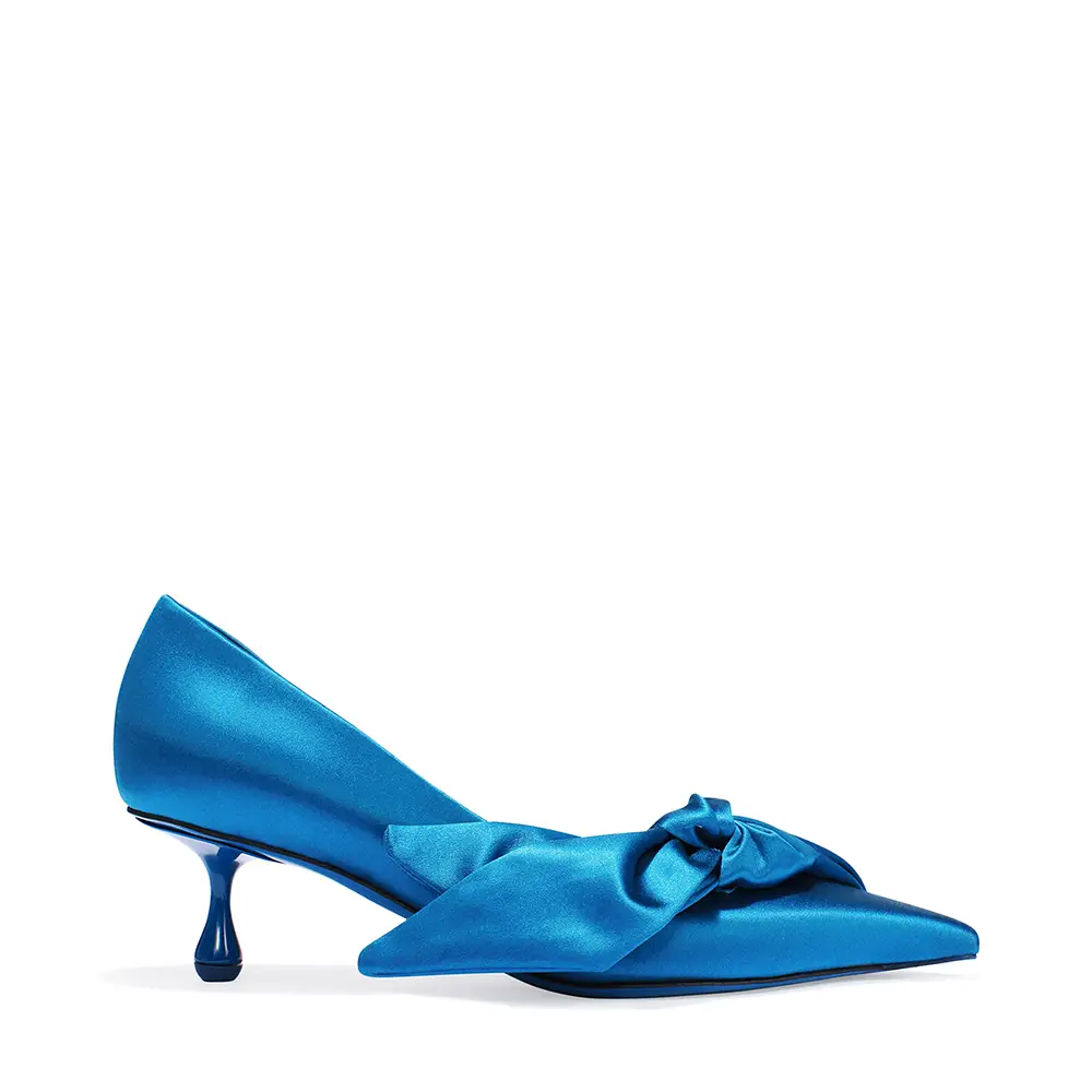 El gesto de la “pierna vestida” se refleja en estilos con lazos extravagantes y detalles florales. El COKO luce una roseta cortada con láser en la punta de una sandalia de noche bicolor: el tacón y la punta en satén negro y hueso, respectivamente, con un corte gráfico que atraviesa el centro de la suela. El ISSY PUMP, equilibrado sobre un tacón Drop de 50 mm, presenta un lazo lateral exagerado sobre un empeine bajo y puntiagudo en cuero suave y brillante, en un intenso y seguro tono azul laguna, color que también aparece en el bolso BAR Holdall.