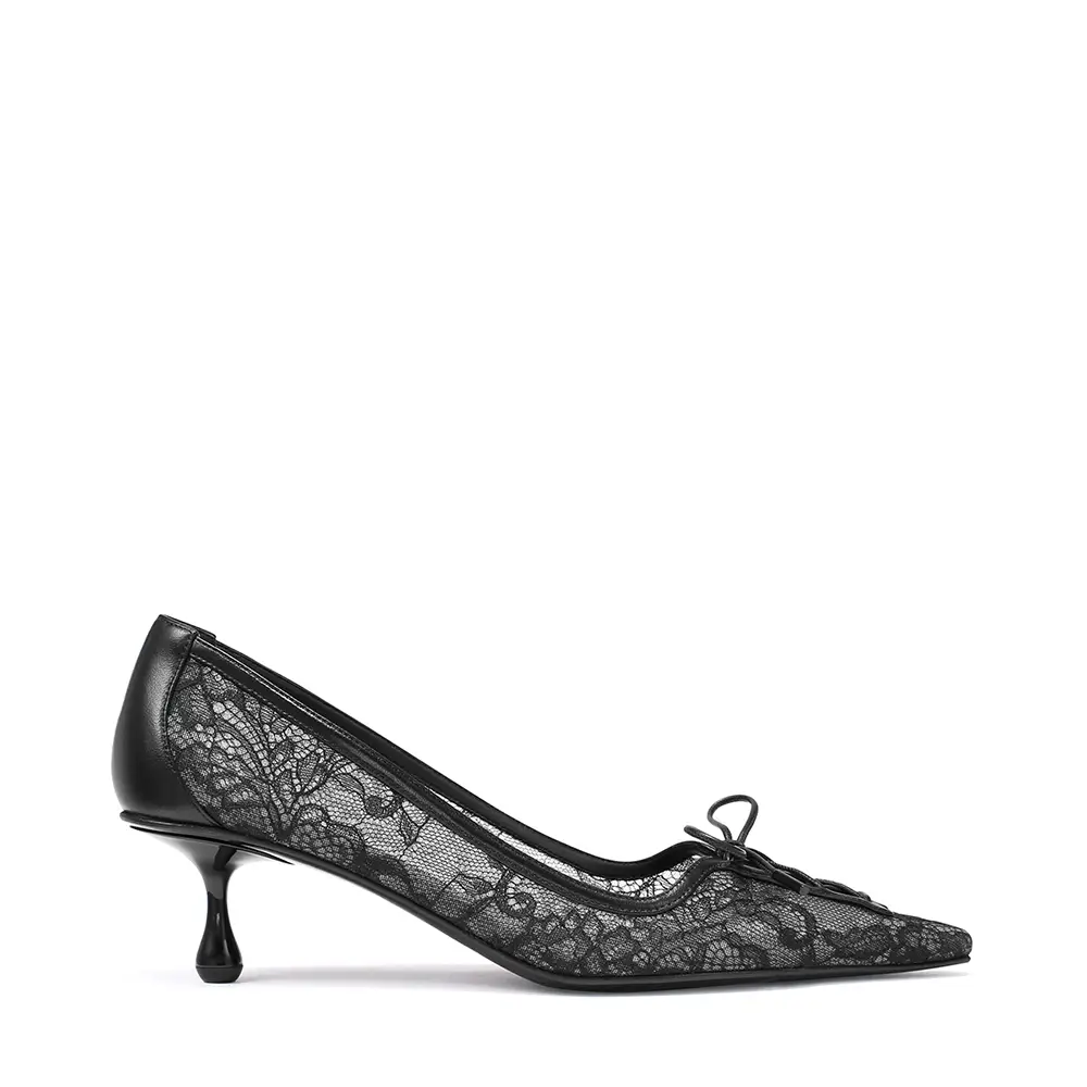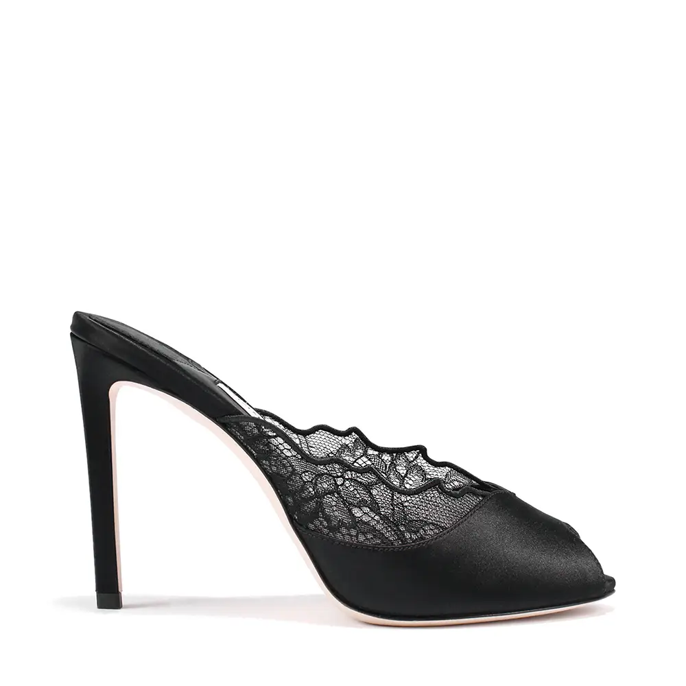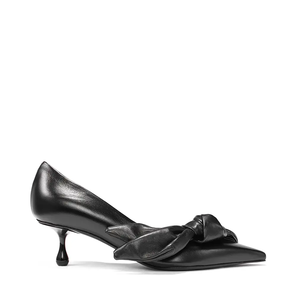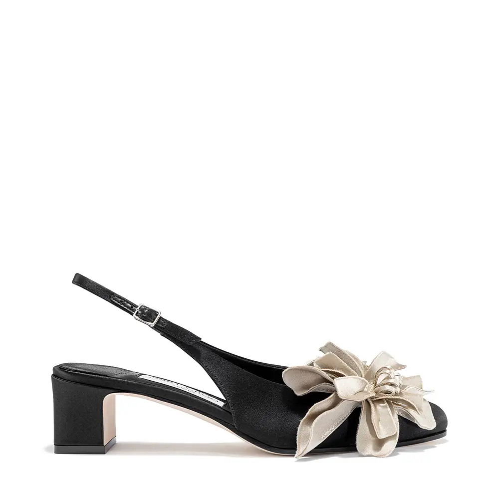 El gesto de la “pierna vestida” se refleja en estilos con lazos extravagantes y detalles florales. El COKO luce una roseta cortada con láser en la punta de una sandalia de noche bicolor: el tacón y la punta en satén negro y hueso, respectivamente, con un corte gráfico que atraviesa el centro de la suela. El ISSY PUMP, equilibrado sobre un tacón Drop de 50 mm, presenta un lazo lateral exagerado sobre un empeine bajo y puntiagudo en cuero suave y brillante, en un intenso y seguro tono azul laguna, color que también aparece en el bolso BAR Holdall.