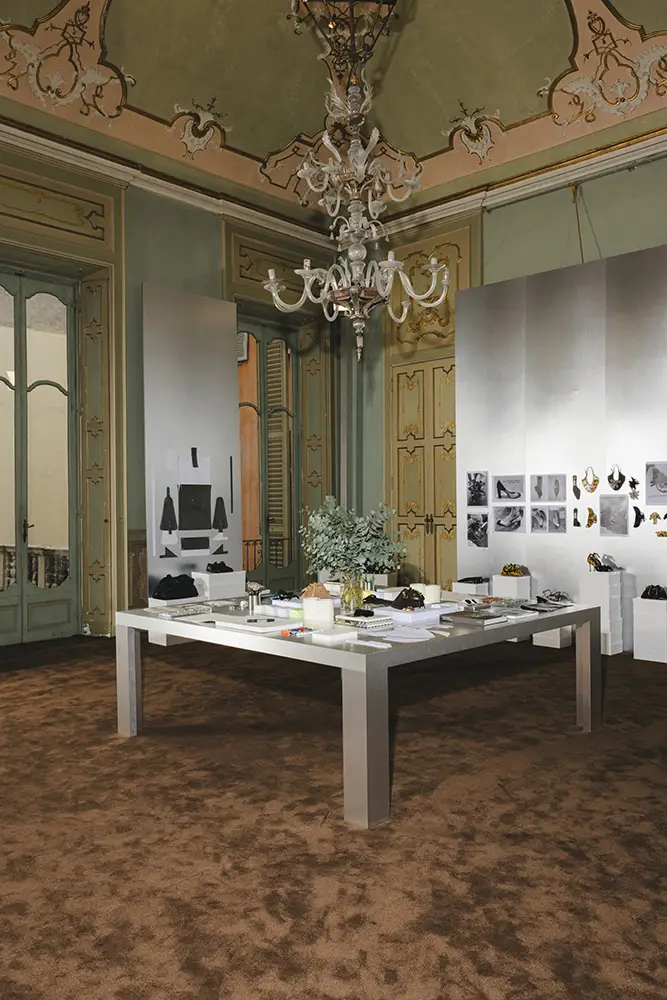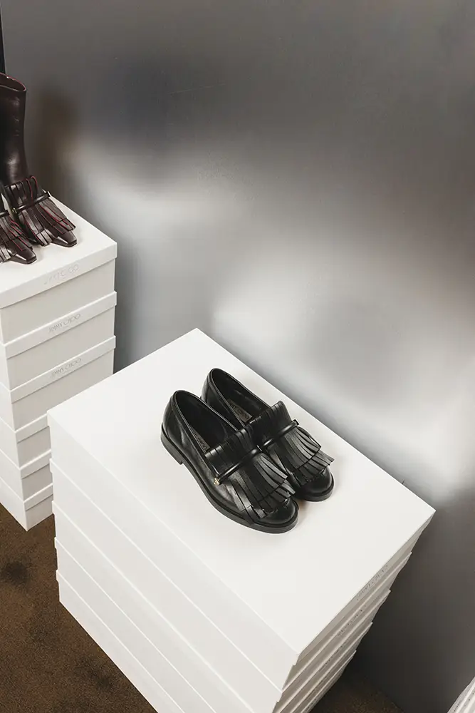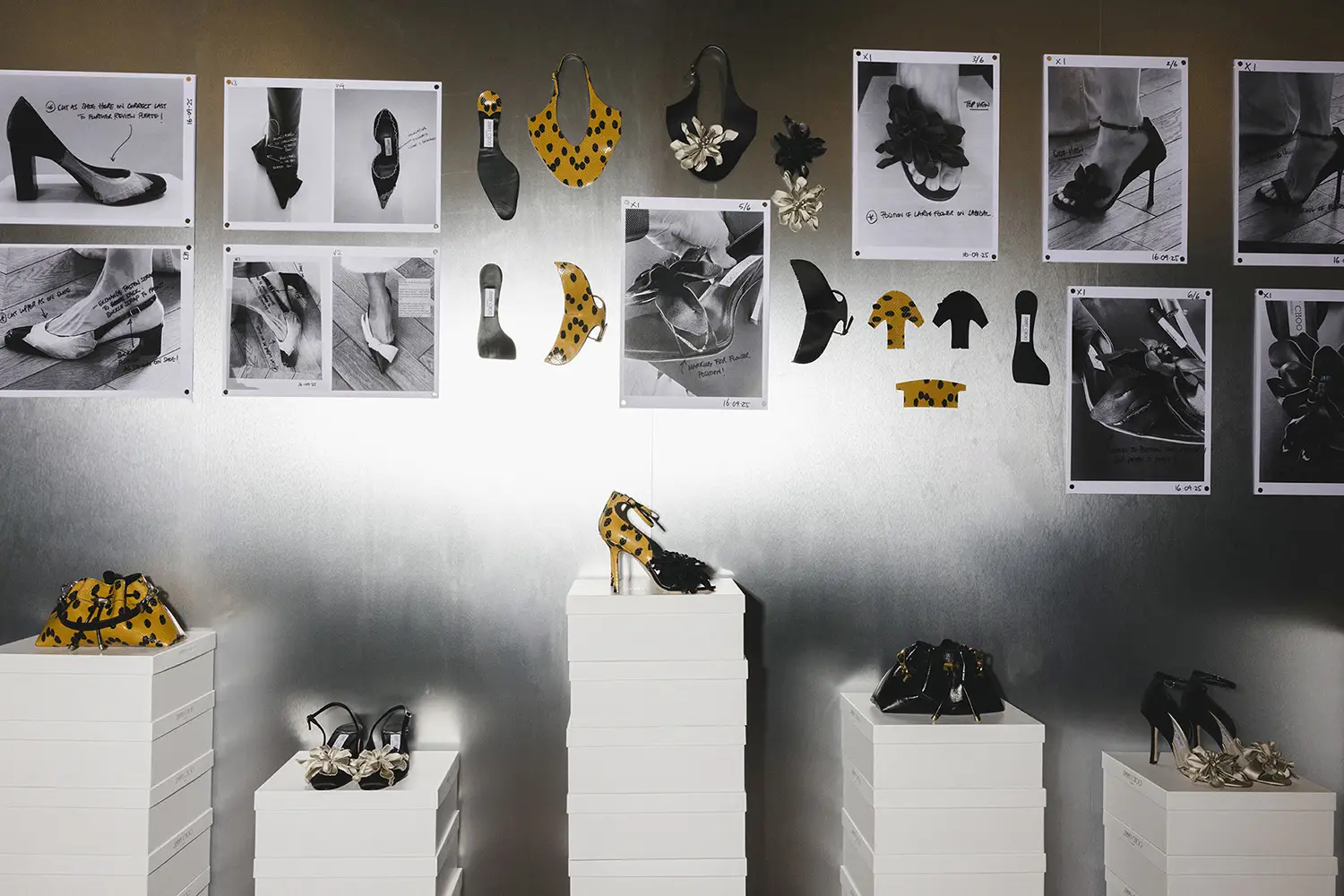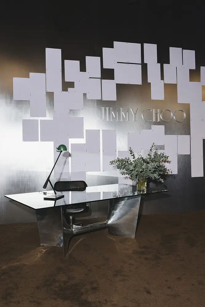 La colección se presentó durante la Semana de la Moda de Milán en un escenario de múltiples salas que era una interpretación del estudio de diseño de Sandra Choi en Londres. Habiendo supervisado el diseño desde que la marca se estableció en 1996, el espacio representaba de manera intencional la narrativa de lo que ocurre detrás de escena en la creación de una colección, en la creación de Jimmy Choo.