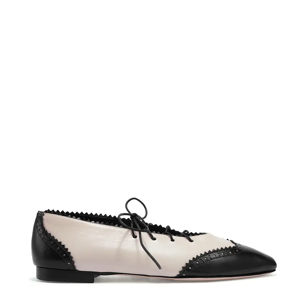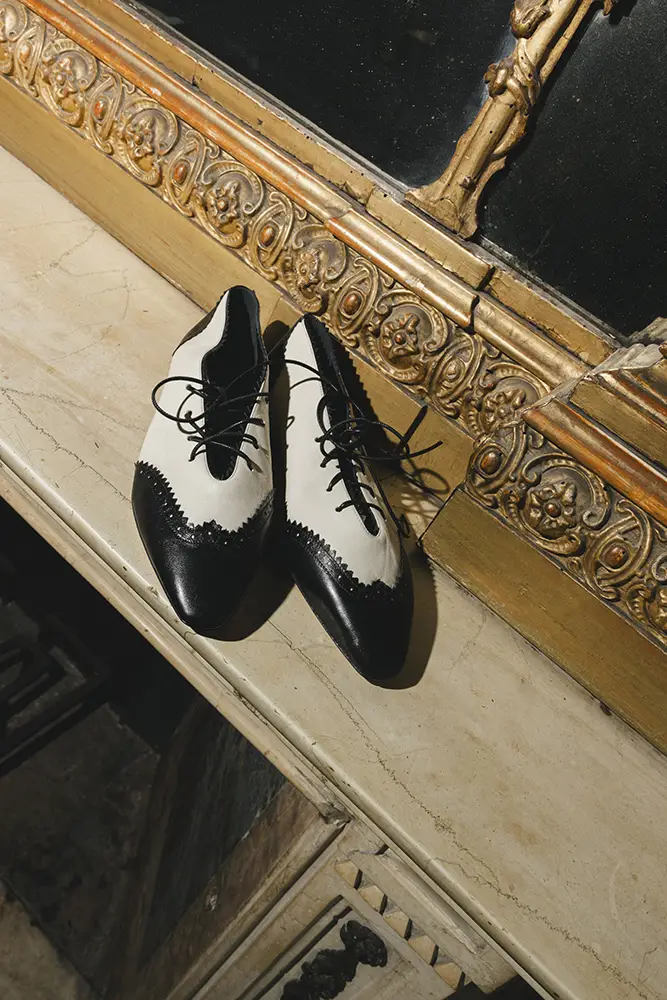 Inspirada en la actitud BIKER, hay una apropiación de prendas clásicas del guardarropa masculino, reinterpretadas de manera inherentemente femenina; se muestran la artesanía tradicional del calzado y el savoir-faire en cuero. El modelo MARGOT con cordones toma los detalles de brogue de los zapatos clásicos masculinos, destacando en el contraste bicolor de negro y hueso. El bolso CINCH se presenta en lana espiga sartorial, también utilizada para dar vida a la zapatilla ELIOT y al zapato de tacón SCARLETT.