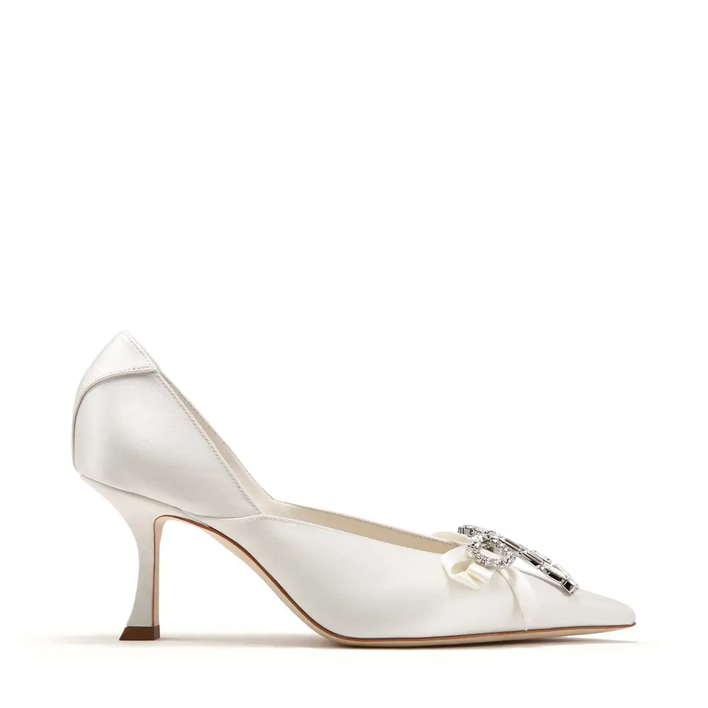 Entre los nuevos estilos nupciales se encuentran los zapatos de salón FAIZ, que exploran la naturaleza femenina y escultural del encaje, mientras que los FAYA, unos zapatos de salón de satén rojo rematados con un lazo de grosgrain y un «sello» con el monograma JC, evocan las cartas de amor de una época pasada. Los accesorios icónicos completan el vestuario nupcial de la novia moderna; el bolso BON BON se presenta en satén marfil y con divertidos adornos de perlas. Estas versátiles piezas están diseñadas para ser lucidas, recordadas y atesoradas mucho después del gran día.