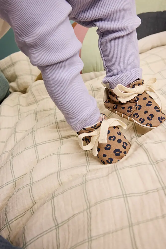 De los cero a los nueve meses, la piel descubre el suelo, las manos tantean el aire y los pies, aún descalzos, ensayan sus primeras piruetas invisibles. Los patucos de esta primera etapa se conciben como una segunda piel: flexibles, ligeros, sin rigidez innecesaria. Elaborados en algodón orgánico, ofrecen calor y protección sin interrumpir el diálogo que el bebé mantiene con su propio cuerpo. Son, en esencia, la tela donde se escribe el prólogo de sus movimientos.