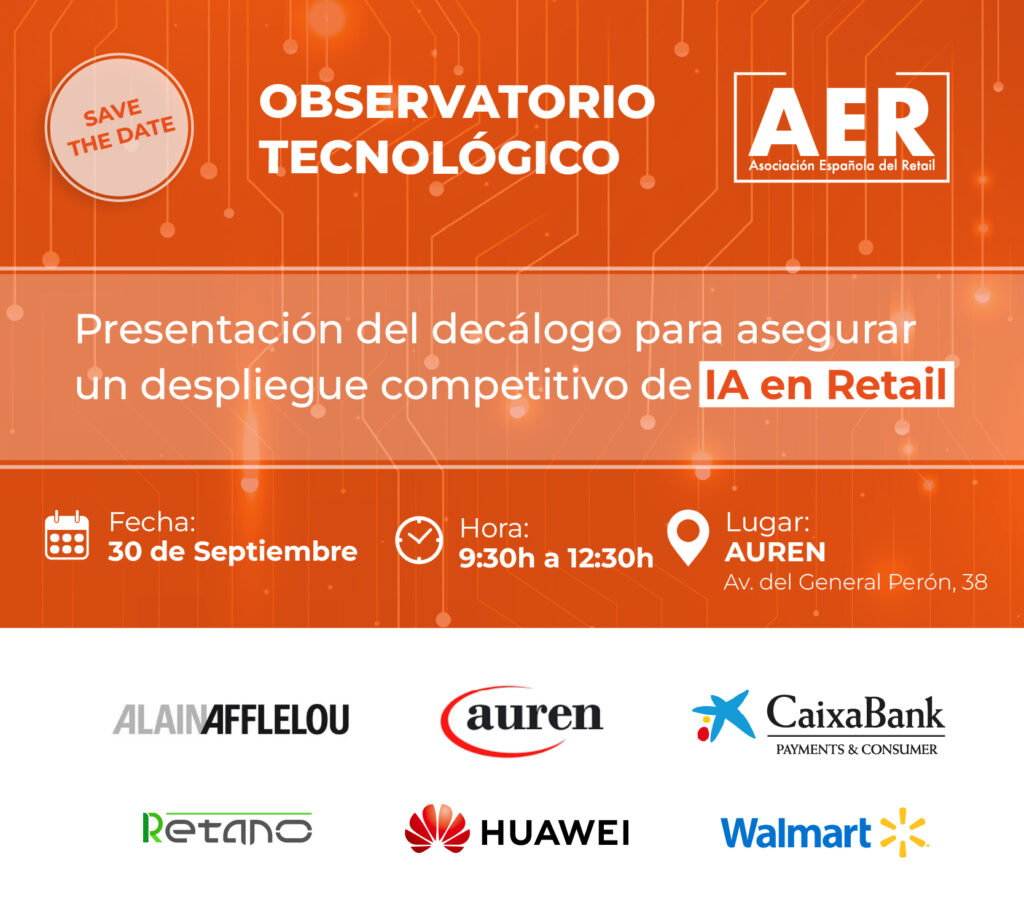 La Asociación Española del Retail (AER) presenta el 30 de septiembre, en la sede de Auren Madrid (Av. del General Perón, 38), su esperado Decálogo para asegurar un despliegue competitivo de IA en Retail. El evento, que dará continuidad al webinar celebrado en mayo, se inaugura con acreditaciones a las 9:30 h y comenzará oficialmente a las 10:00 h.