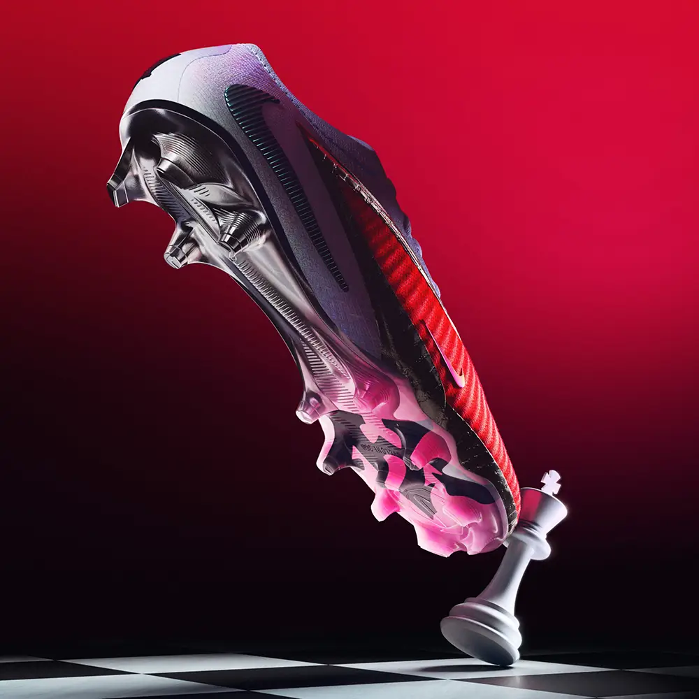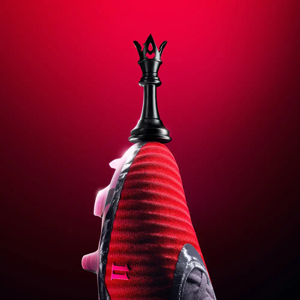 La bota luce una paleta de colores tan potente como su juego: rojos radiantes que reflejan fuerza, movimiento y creatividad; tonos negros que representan confianza, control e instinto; y sutiles detalles metalizados claros que aportan un acabado premium. Elementos con brillo añaden un toque distintivo bajo la iluminación de los estadios, mientras que los gráficos superpuestos aportan profundidad y complejidad al diseño. Motivos similares se trasladan a un chándal para adultos y a una camiseta y un pantalón corto infantiles.