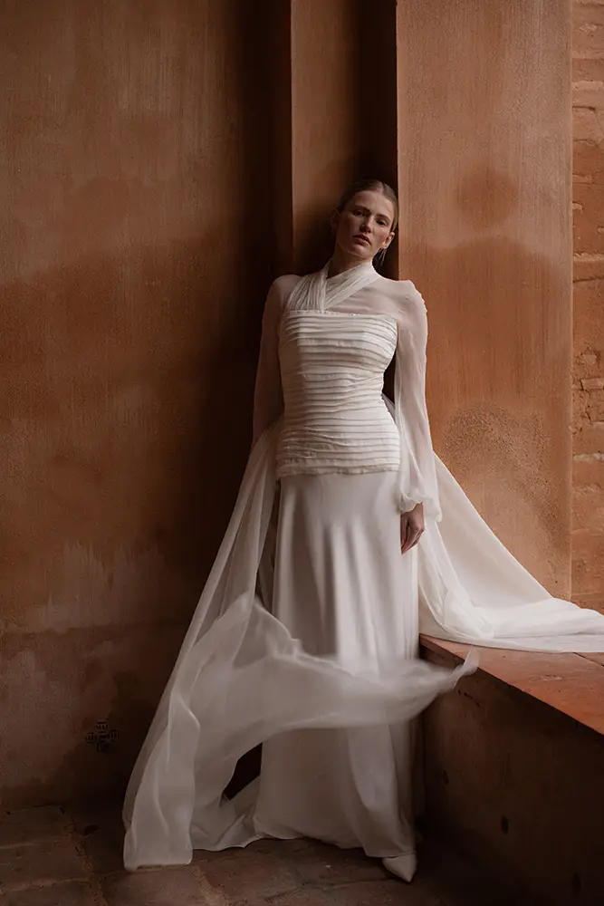 En Alex Vidal, las líneas limpias y los cortes fluidos dialogan con texturas exquisitas para dar forma al vestido de novia perfecto: romántico, ligero y sofisticado. Siluetas etéreas y delicadas, versátiles y atemporales, pensadas para acompañar a cualquier novia y cualquier estilo de ceremonia.