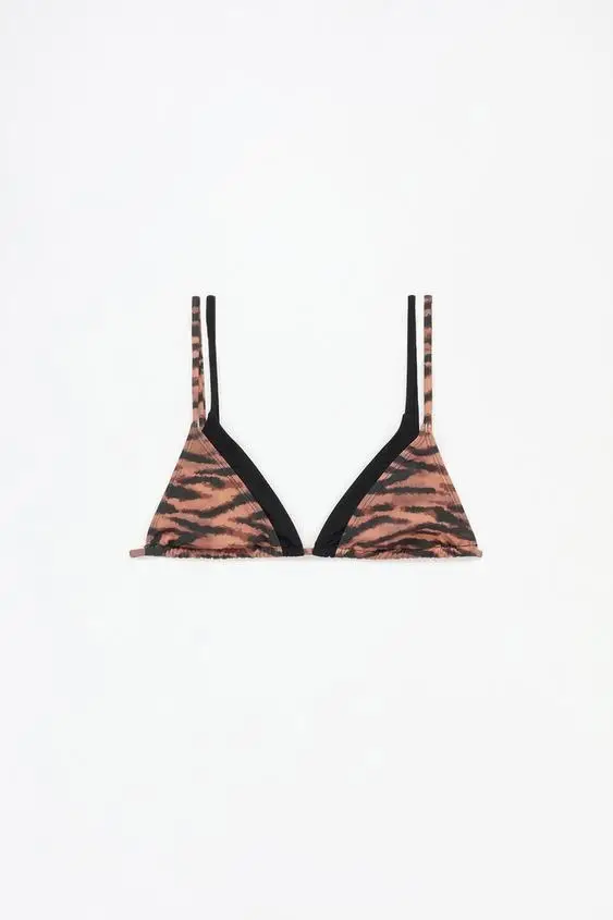 En cuanto a los bikinis, la colección ofrece desde modelos con detalles de tachas hasta opciones más sofisticadas como el sujetador triangular con cierre de lazada y braguitas de corte brasileño compuestas por dos piezas superpuestas: una lisa y otra estampada, ideales para quienes buscan versatilidad en su look de playa.