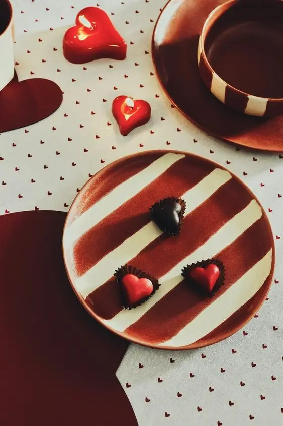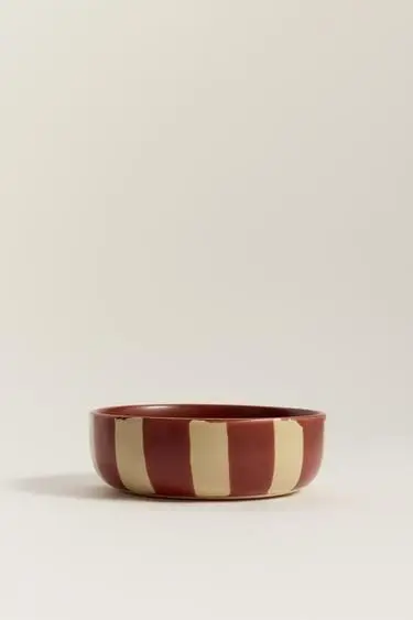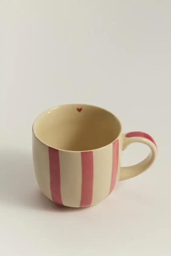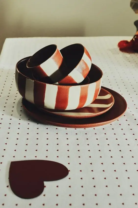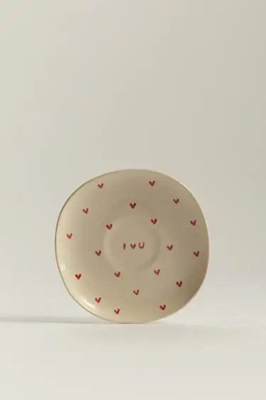 La línea Home incluye una cuidada selección de piezas de menaje y decoración como boles, platos llanos y de postre, tazas, vasos y ensaladeras en materiales como el gres, protagonista de gran parte de la vajilla que aportan un aire artesanal y acogedor a la mesa. Predominan los estampados lisos, de corazones y la combinación de rayas con el rojo oscuro los manteles y posavasos en forma de corazón.