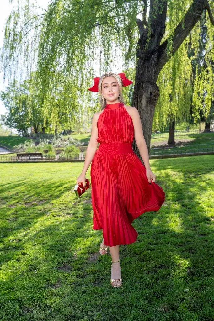 Para completar el look, los accesorios de la temporada son los pendientes XL, los lazos estratégicos y los bolsos metalizados que elevan el conjunto sin robarle protagonismo.