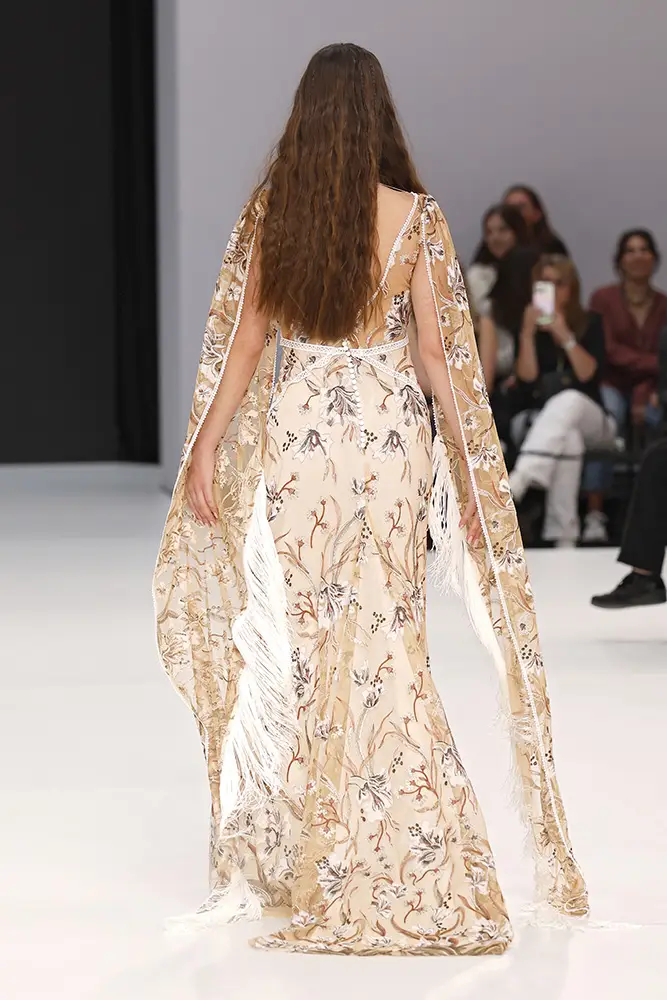 Los vestidos Amazigh están diseñados con una base artesanal que resalta la riqueza de los bordados, las texturas y los materiales naturales. Tejidos de lana, seda y algodón se entrelazan con hilos metálicos y detalles hechos a mano, creando una sensación de modernidad que mantiene viva la esencia tradicional. Los delicados bordados, inspirados en los patrones geométricos y las formas de la naturaleza, cuentan historias ancestrales que se traducen en una elegancia única para cada novia.