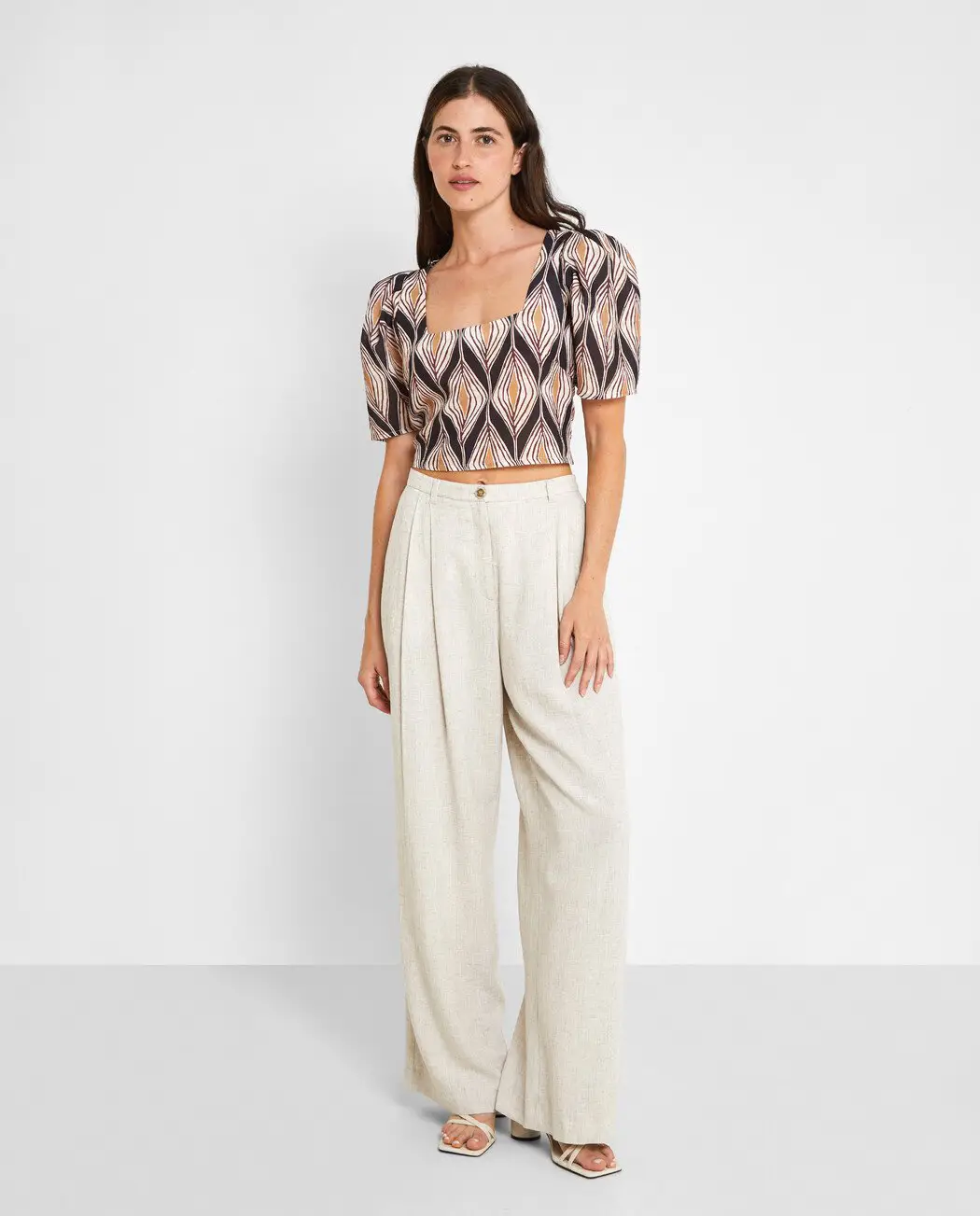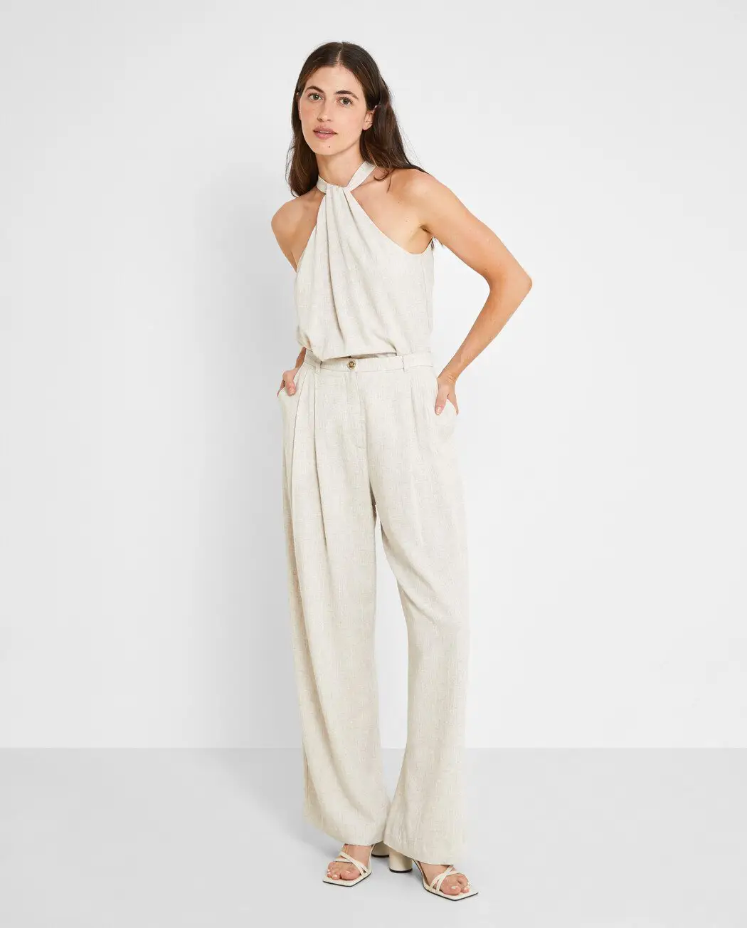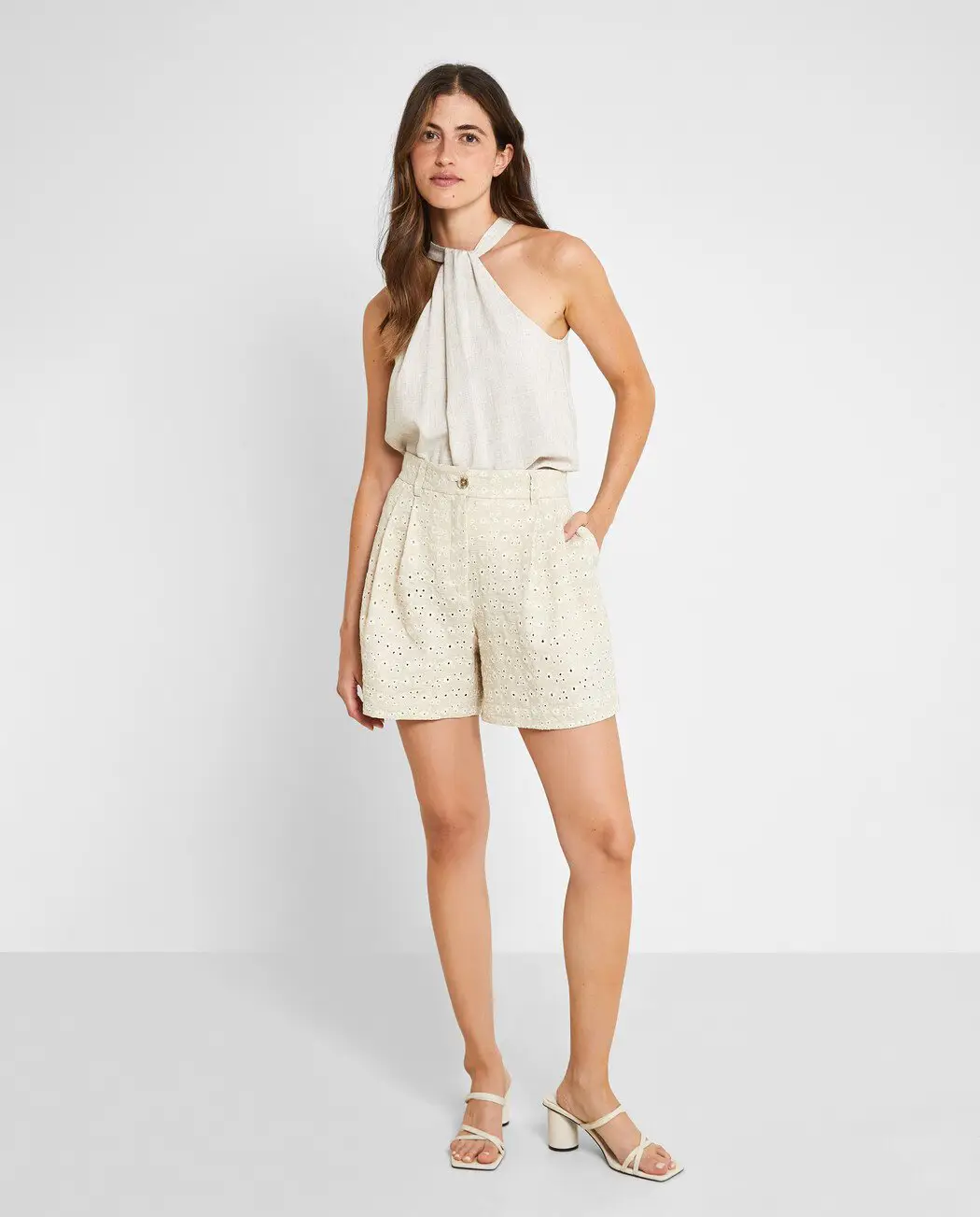 Para los días de sol, el conjunto de short con bordado y top escote halter a juego se impone como opción infalible. Su tono neutro facilita las combinaciones con otras prendas y accesorios, y su tejido ligero lo convierte en un comodín para recorrer cualquier destino con estilo y frescura. El pantalón corto, aporta un aire sofisticado incluso en los looks más relajados, también se puede combinar con el top étnico sin mangas que le dará un enfoque más veraniego y elegante.