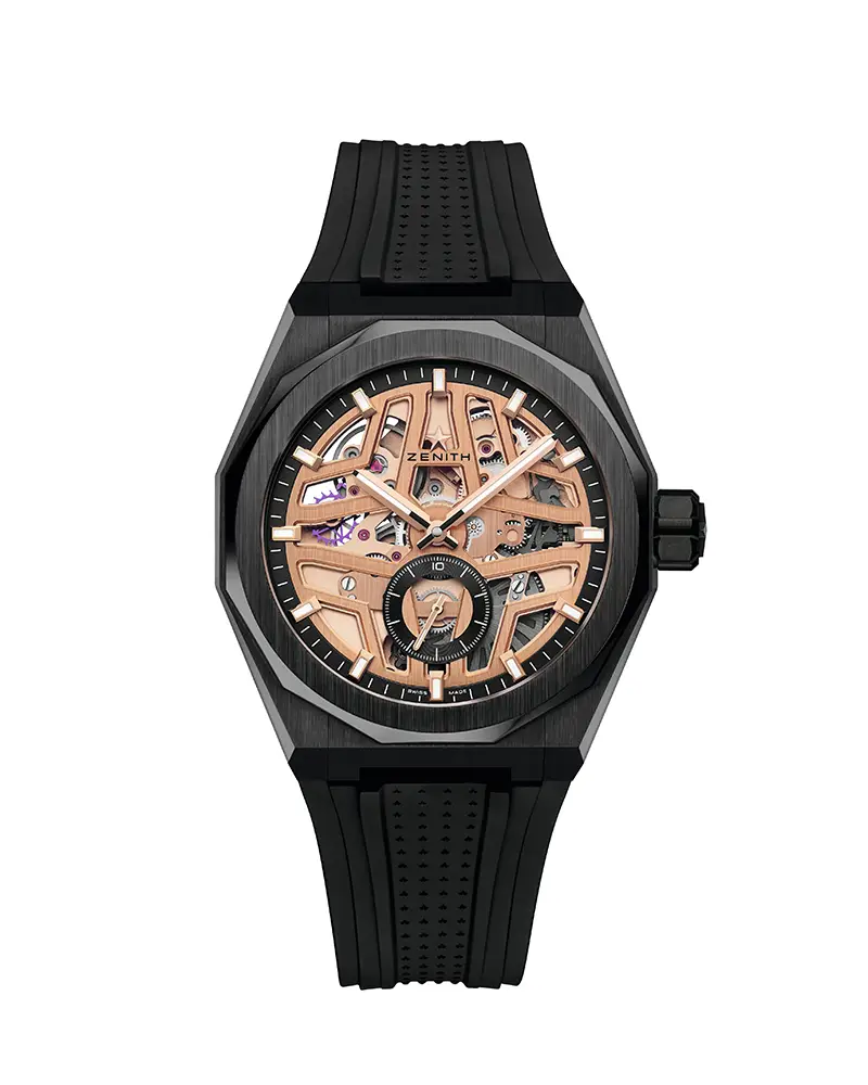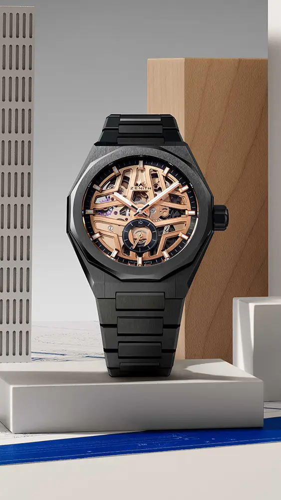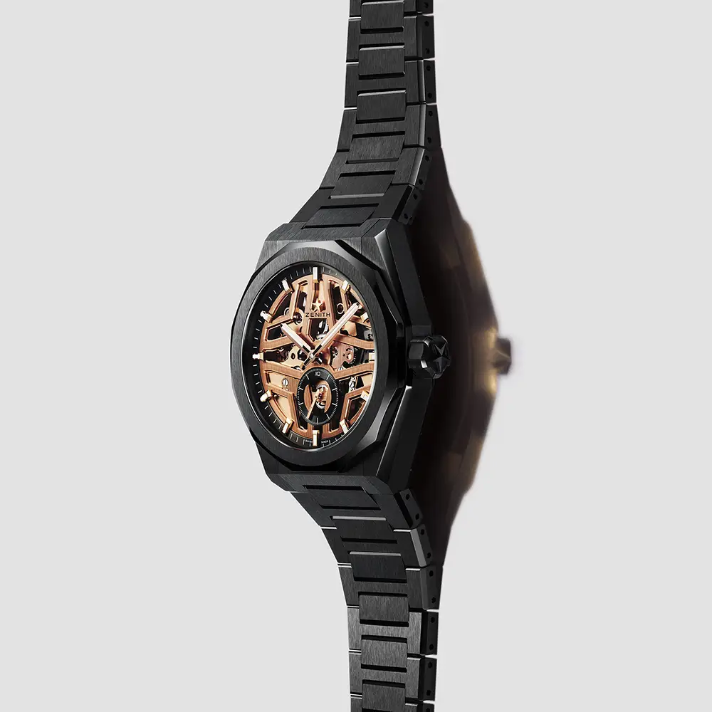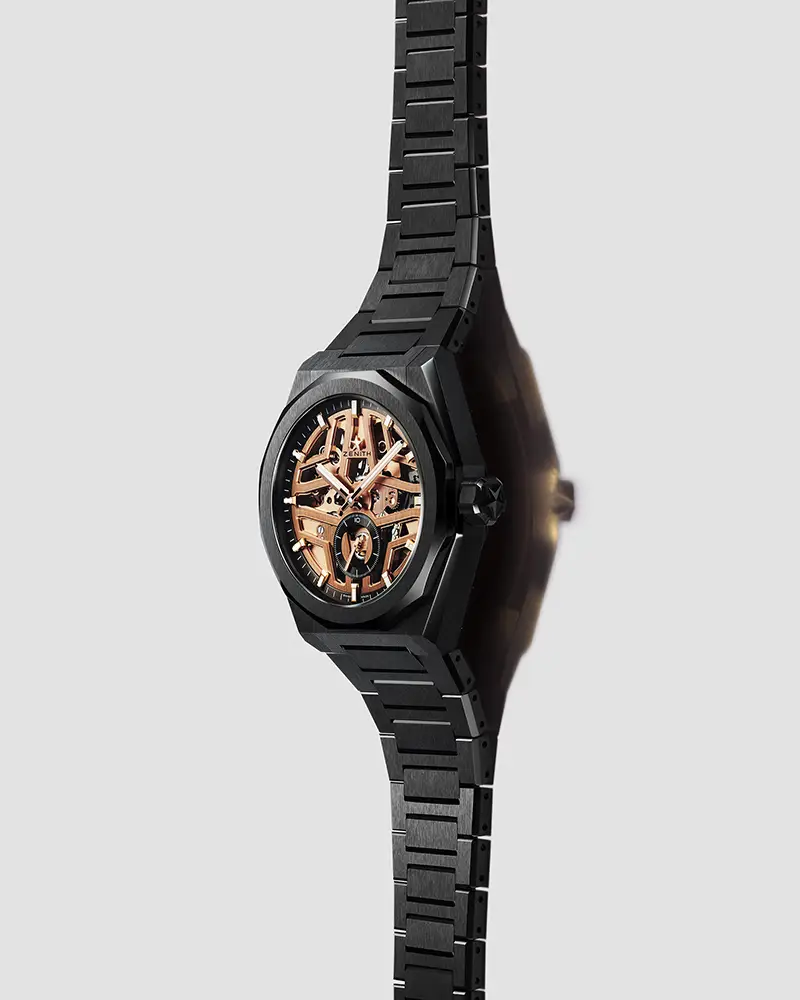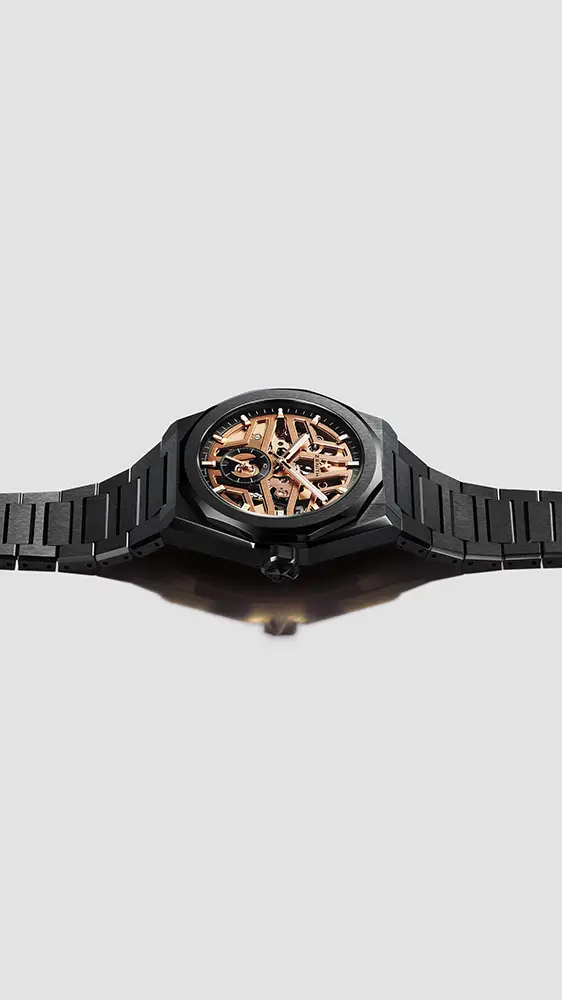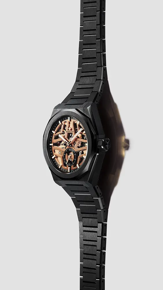 Con su atrevida arquitectura calada, el DEFY Skyline Skeleton revela todos los detalles técnicos del calibre El Primero, incluido su característico indicador de las décimas de segundo. La última versión presenta un nuevo contraste al combinar una caja de cerámica de color negro profundo con un movimiento dorado, una fusión que recuerda a los reflejos luminosos y las estructuras sombreadas de los paisajes urbanos contemporáneos.