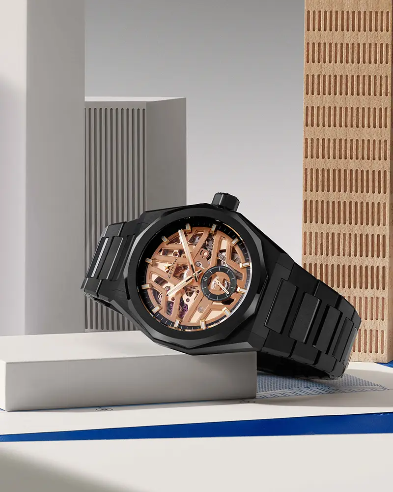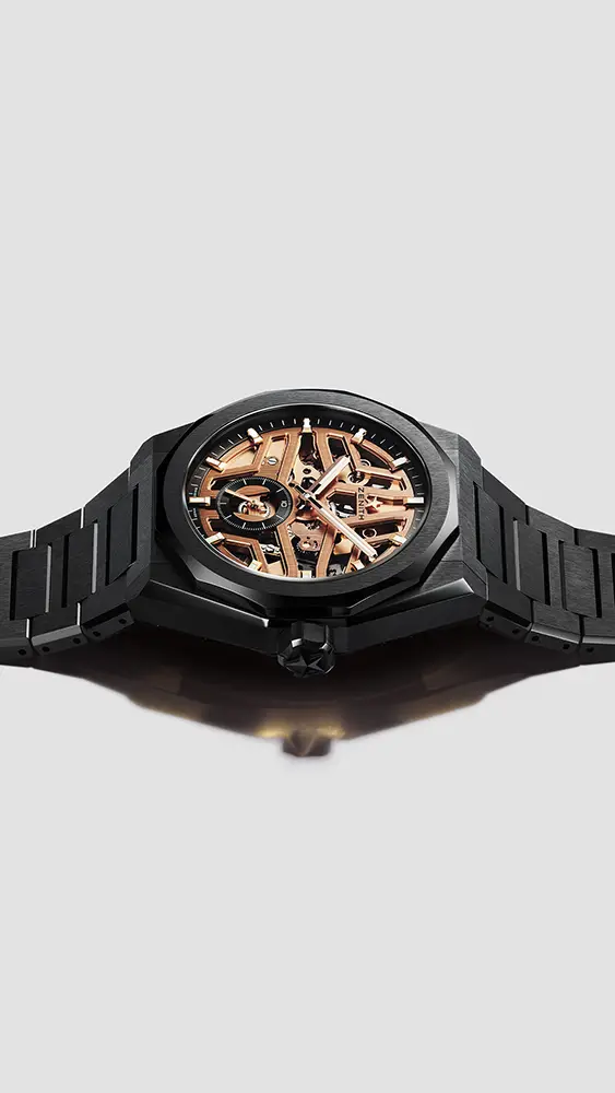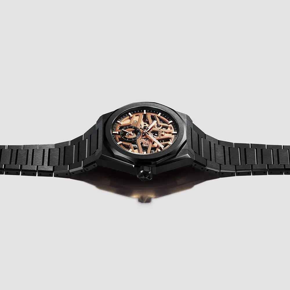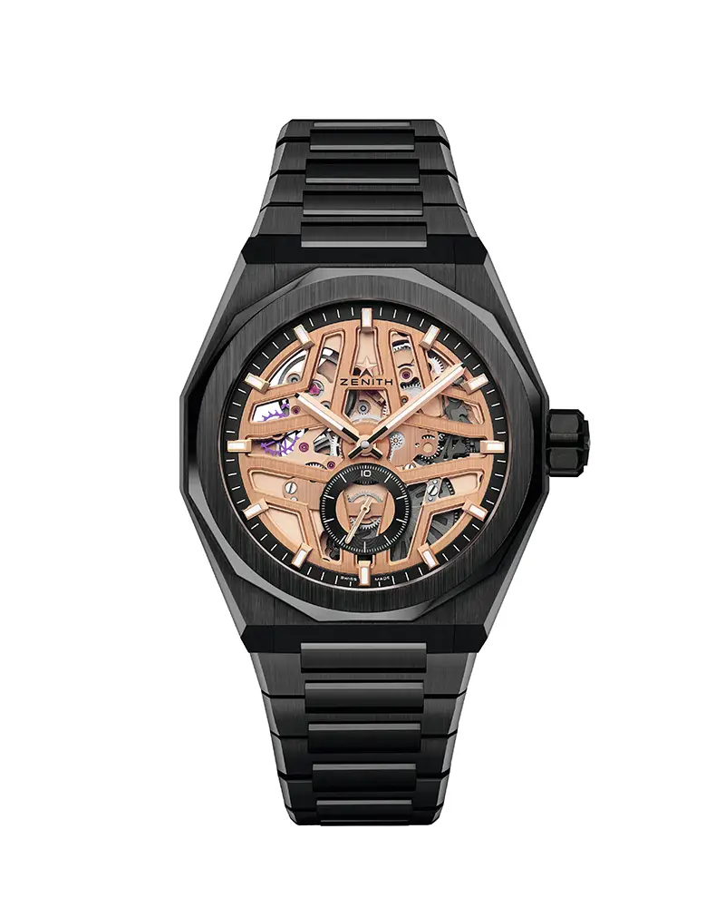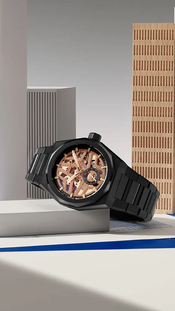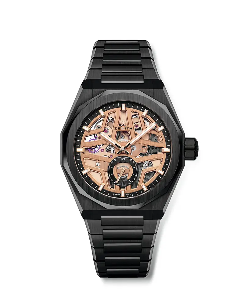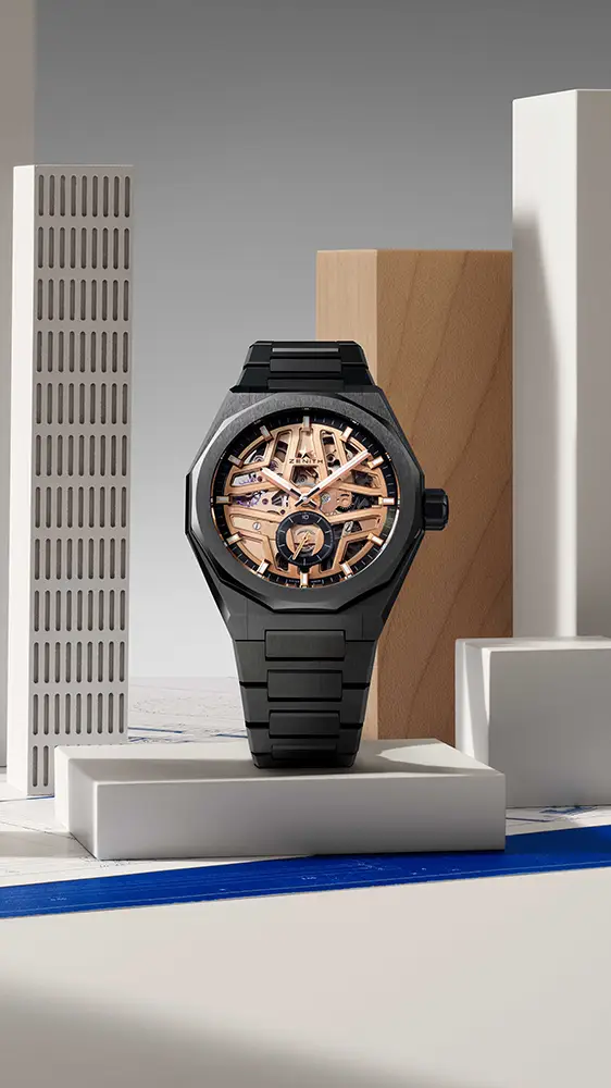 Con su atrevida arquitectura calada, el DEFY Skyline Skeleton revela todos los detalles técnicos del calibre El Primero, incluido su característico indicador de las décimas de segundo. La última versión presenta un nuevo contraste al combinar una caja de cerámica de color negro profundo con un movimiento dorado, una fusión que recuerda a los reflejos luminosos y las estructuras sombreadas de los paisajes urbanos contemporáneos.