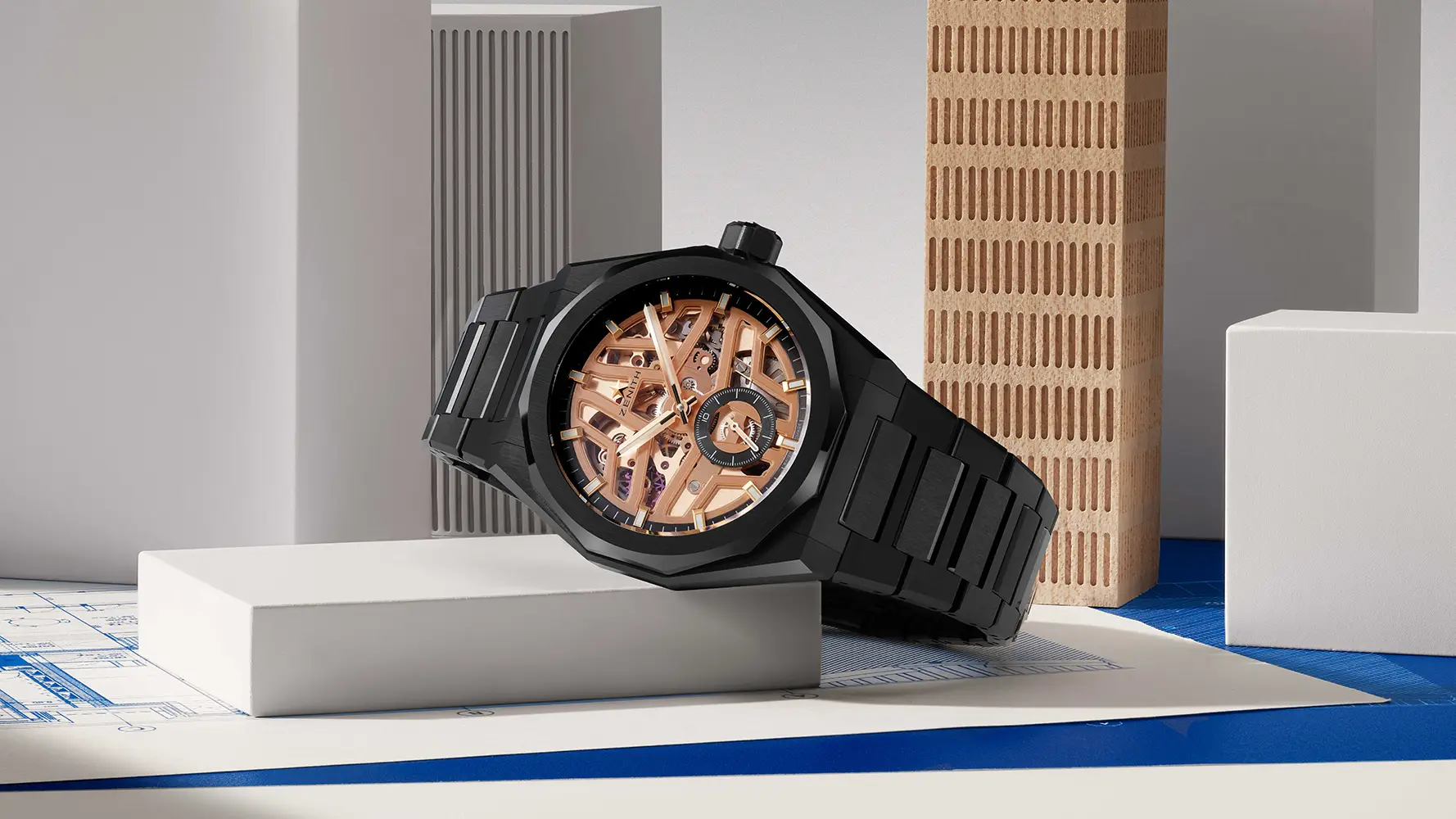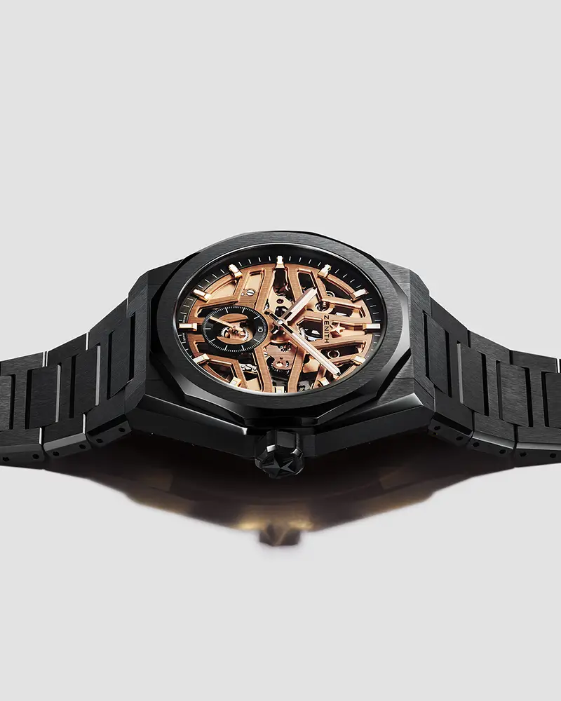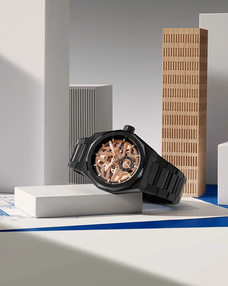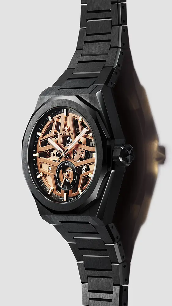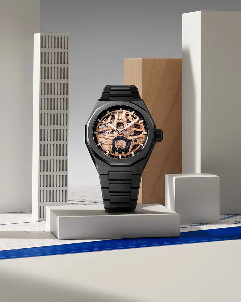 Con su atrevida arquitectura calada, el DEFY Skyline Skeleton revela todos los detalles técnicos del calibre El Primero, incluido su característico indicador de las décimas de segundo. La última versión presenta un nuevo contraste al combinar una caja de cerámica de color negro profundo con un movimiento dorado, una fusión que recuerda a los reflejos luminosos y las estructuras sombreadas de los paisajes urbanos contemporáneos.
