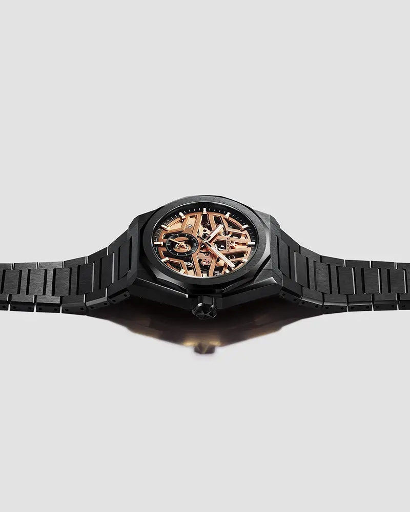 Esta cautivadora interacción entre el negro y el dorado reinventa el DEFY Skyline Skeleton para convertirlo en una auténtica obra de arte escultórica dentro del mundo de la relojería moderna. El exterior de cerámica negra satinada y pulida evoca las líneas depuradas y las formas monolíticas de los monumentos arquitectónicos, mientras que la brillante esfera calada y el movimiento dorados reflejan los cálidos destellos de una ciudad iluminada por la noche. En conjunto, estos elementos acentúan el bisel dodecagonal y la caja facetada del reloj para lograr un equilibrio entre la audacia metropolitana y la elegancia moderna.